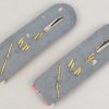 Sew on shoulder boards of bright silver/aluminum Russian braid with single gilt washed rank pip, unit numbers “27” and a “P” for panzerjäger. All mounted on grey wool base with a pink wool middle layer. The matching pair is in good, little used condition. There is moth bites to the pink edges and grey wool base, see pictures!