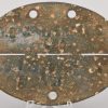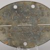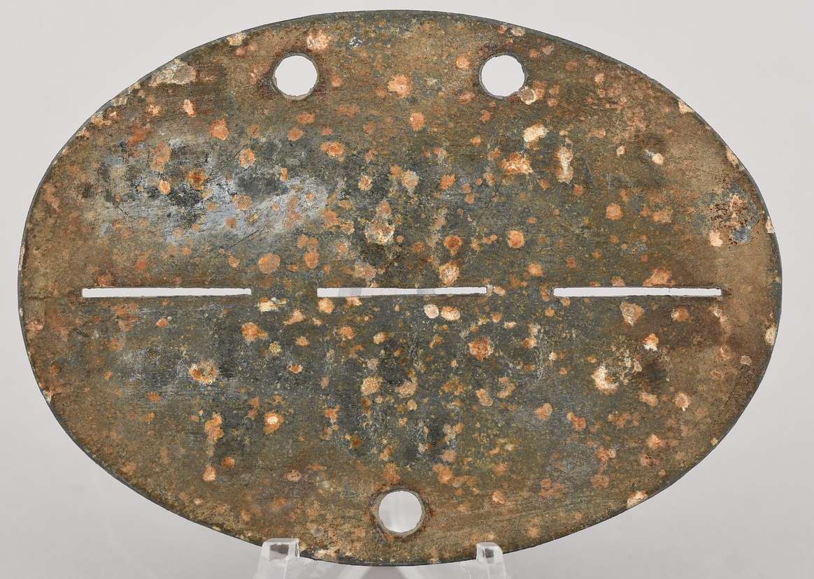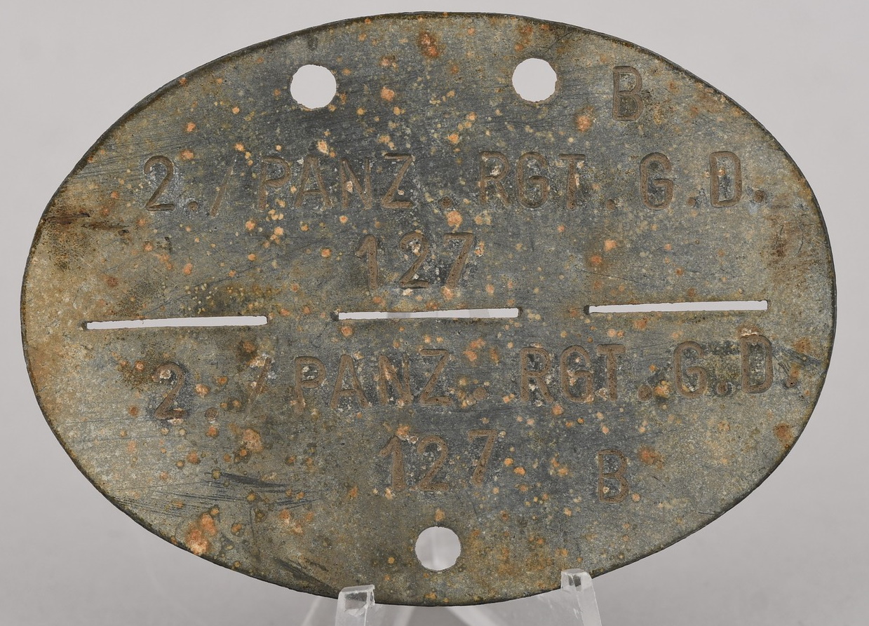 German dog tag (Erkennungsmarke), constructed of alloy metal. Two identical parts ment to be broken to the middle with one part following the body and the other to the unit for report of the death. “The dog tag is marked “2. / PANZ. RGT. GD” and number marked “127”, blood group “B” Complete example with signs of age.