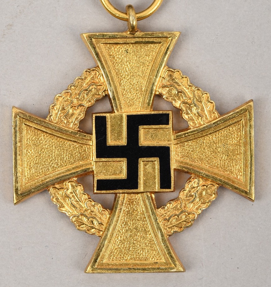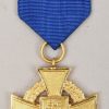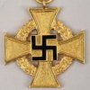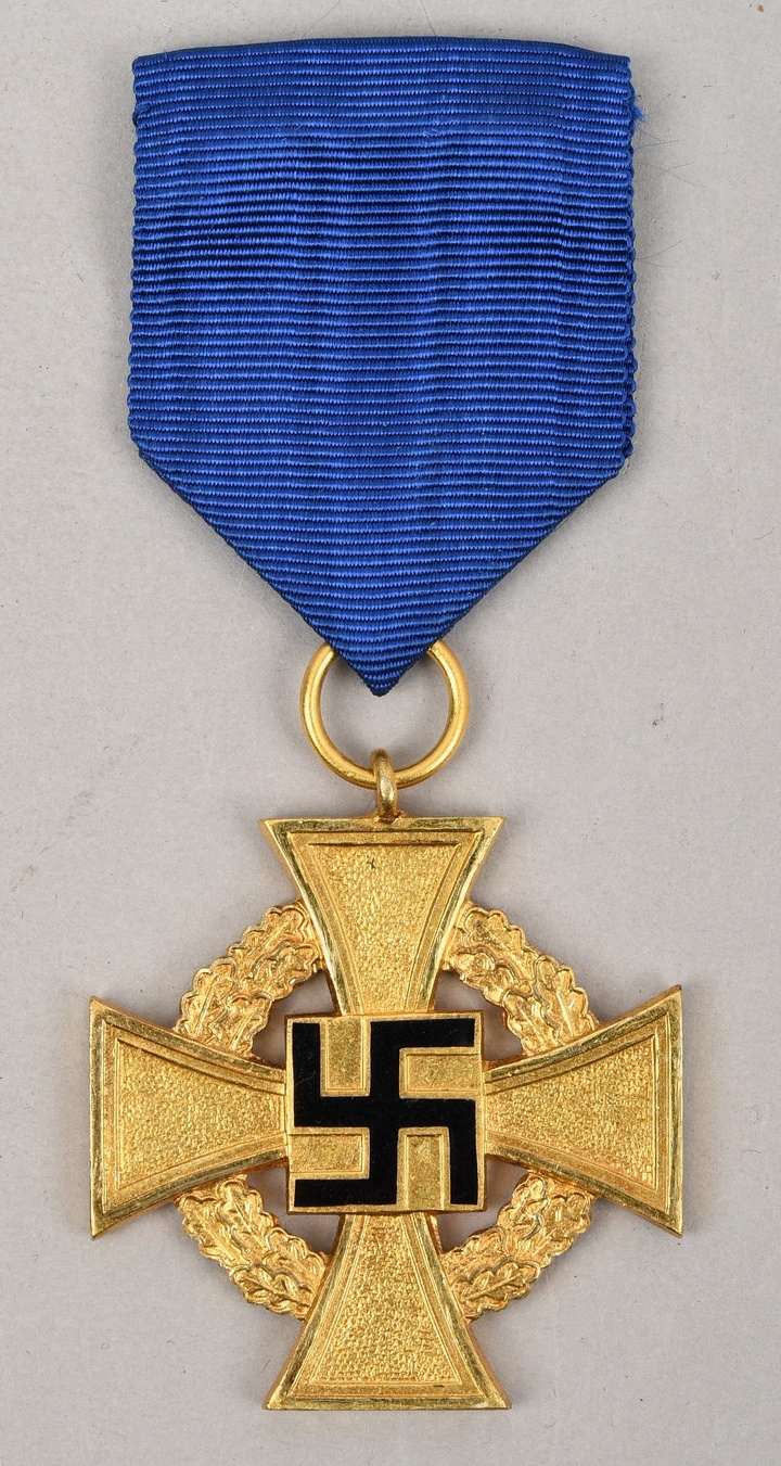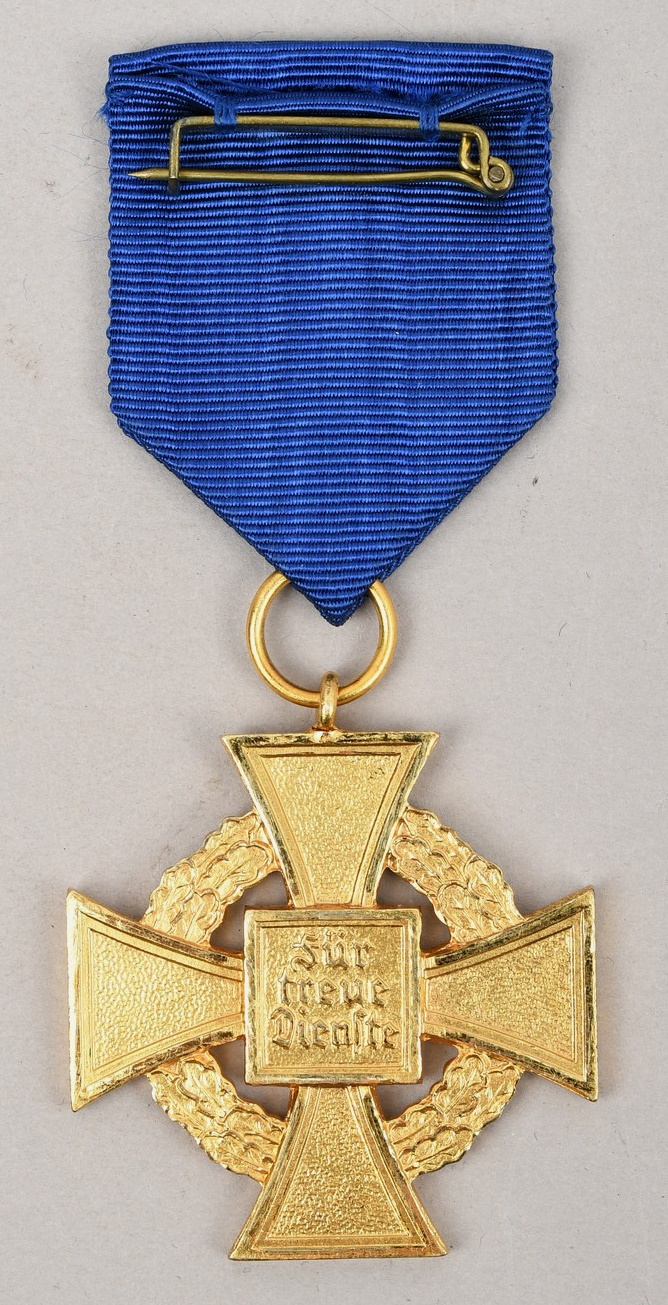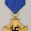 Constructed of gilded Tombak, consisting of a Cross Pattée with pebbled arms, the obverse with a central black swastika, the reverse with a central inscription of “FÜR TREUE DIENSTE” (FOR FAITHFUL SERVICE) with an oak leaf wreath. The cross comes complete with suspension ring and original blue colored ribbon. The ribbon has it’s pinback device still intact to the reverse. The cross is in very good, close to mint condition.