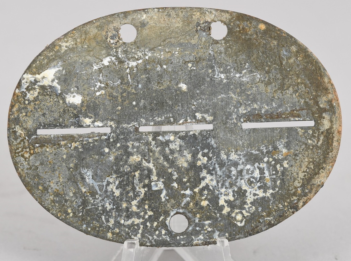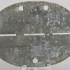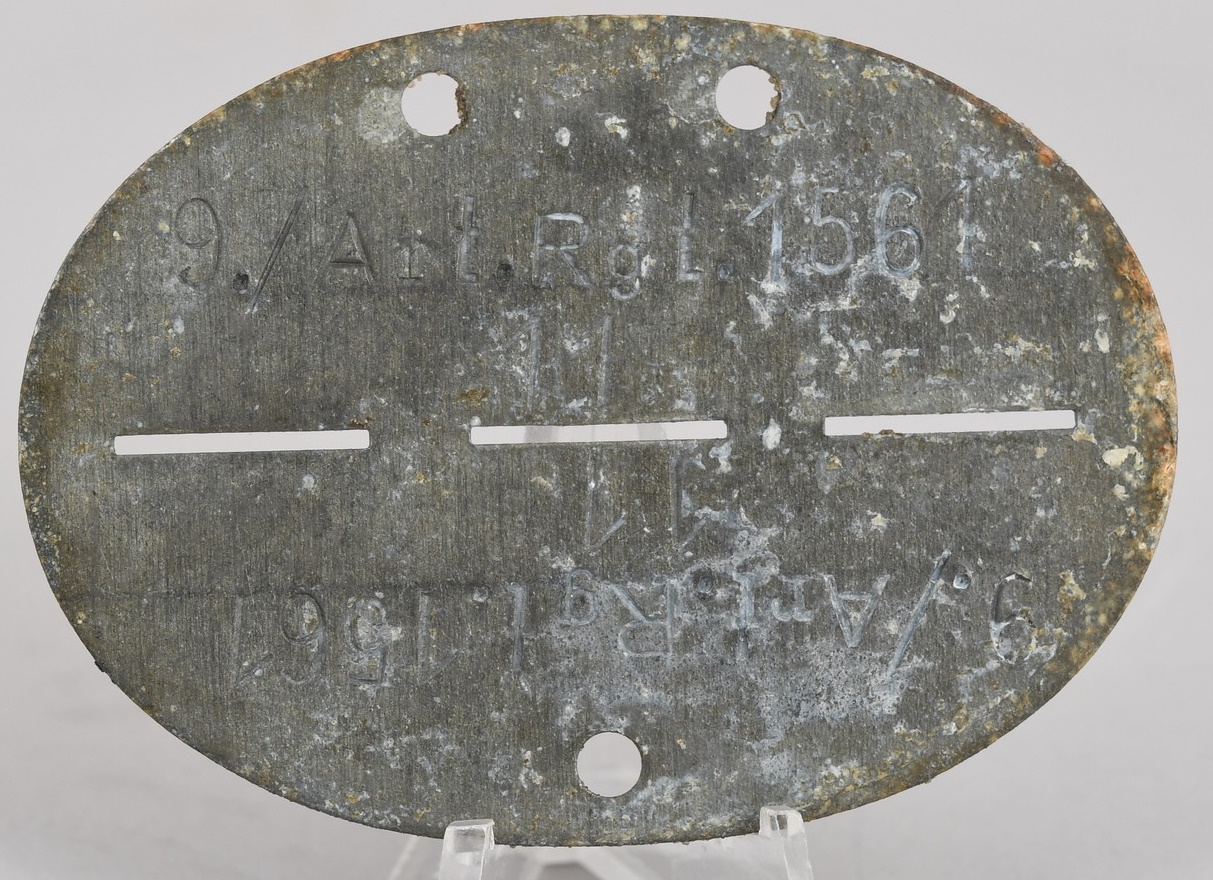 German dog tag (Erkennungsmarke), constructed of alloy metal. Two identical parts ment to be broken to the middle with one part following the body and the other to the unit for report of the death. The dog tag is marked “9./Art.Rgt” and identifation number marked “1561, 11”. Complete example with signs of age.