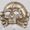 1’st pattern Danziger style, jawless skull with crossbones. Constructed of die stamped tombak with a silver paint washed. Both prongs remain intact to the reverse. Most of the silver paint remains intact. The skull shows light wear to highlighted positions indicating real period use. The skull also show a very nice age patina.