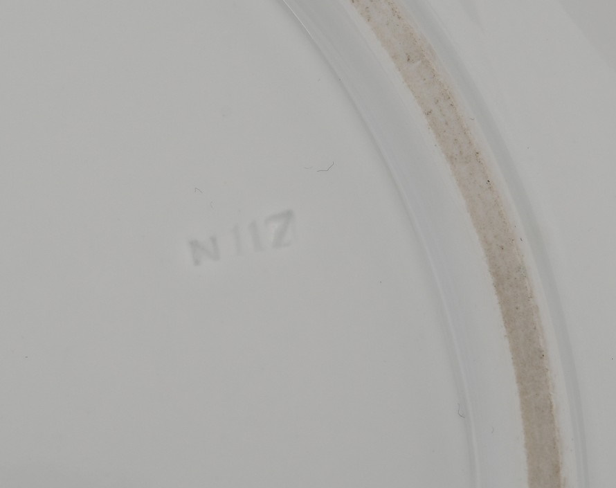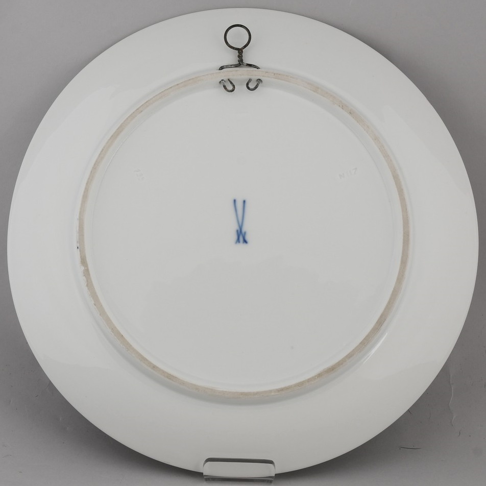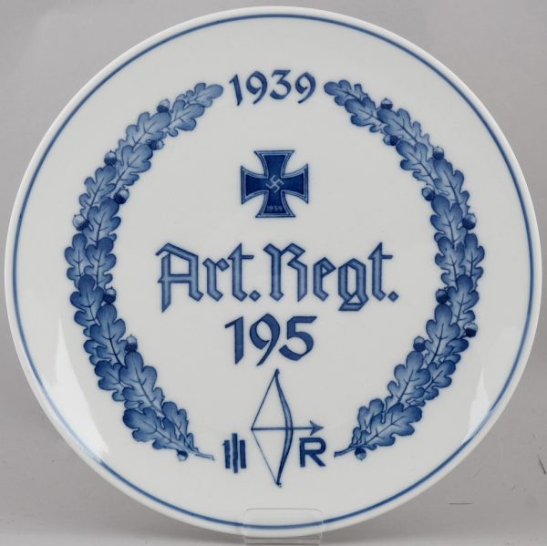Constructed of glazed white porcelain, the obverse bearing a central blue underglaze inscription of “Art. Regt. 195”, topped by a 1939 Iron Cross, and situated within a circular oak leaf wreath, joined together at the bottom by a regimental emblem and at the top by a date of “1939”, the reverse maker marked with the logo of Meissen Porcelain and a stamped design code of “N117”, perforated with two holes which retain a period original metal suspension loop, measuring 25.5 cm in diameter. In very good condition with minor signs of age and use.