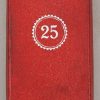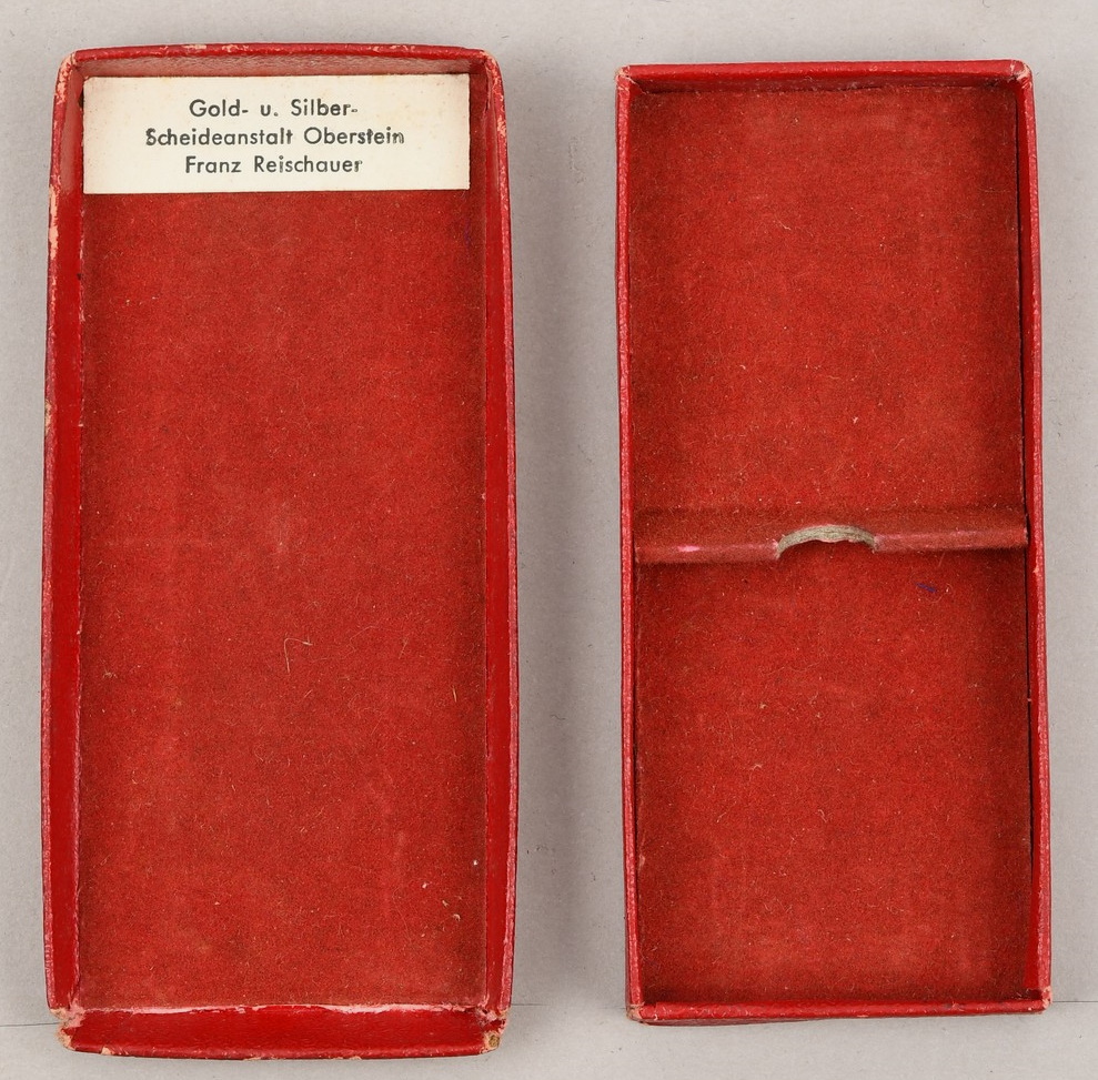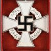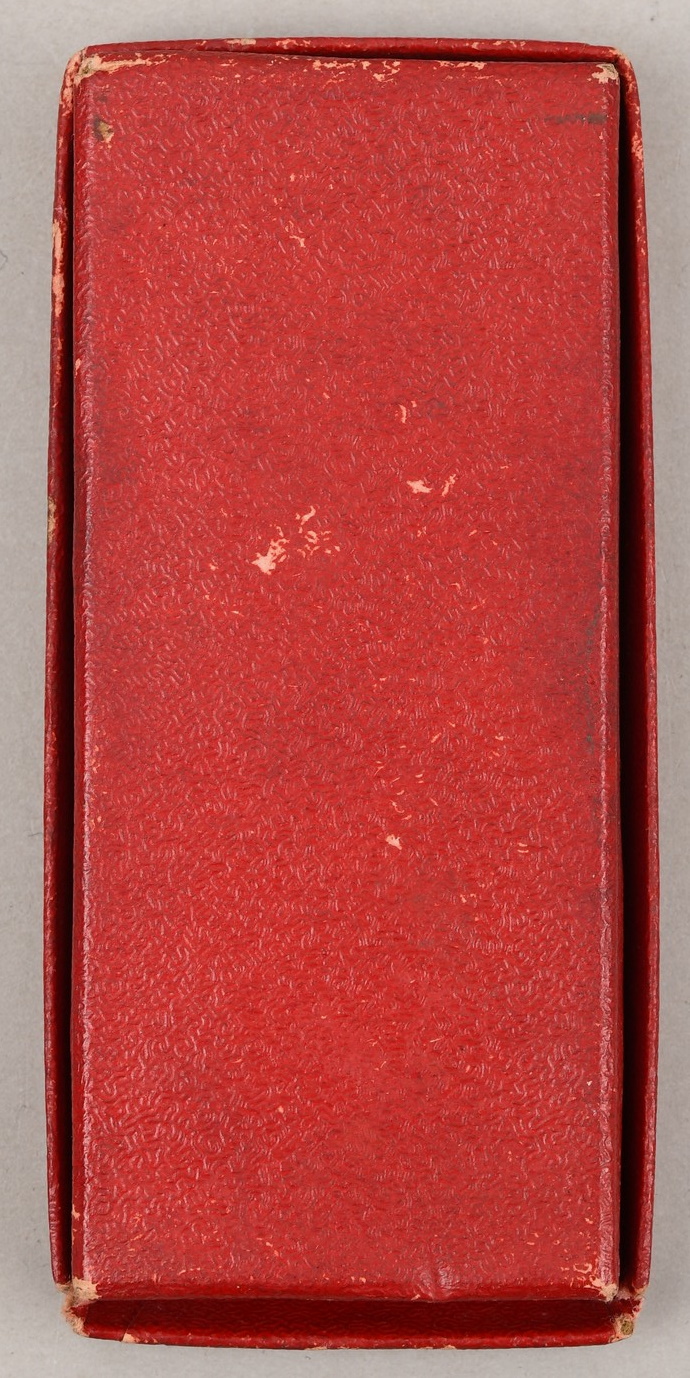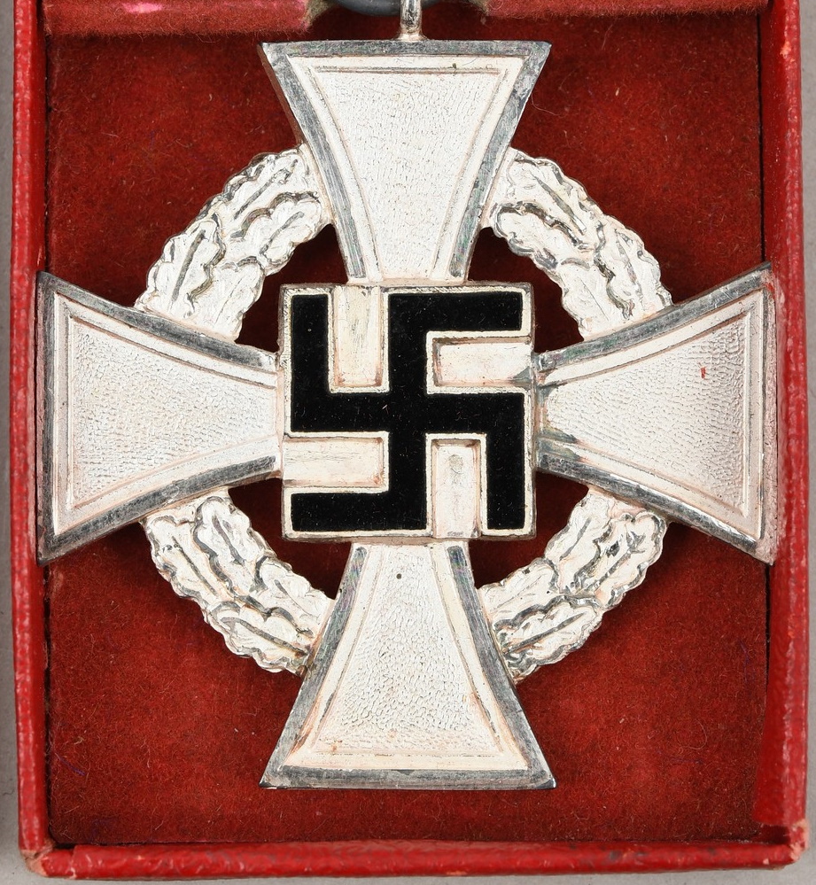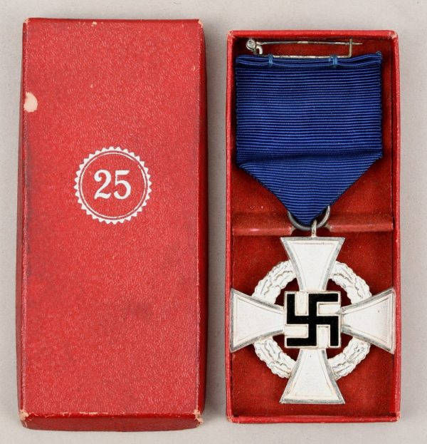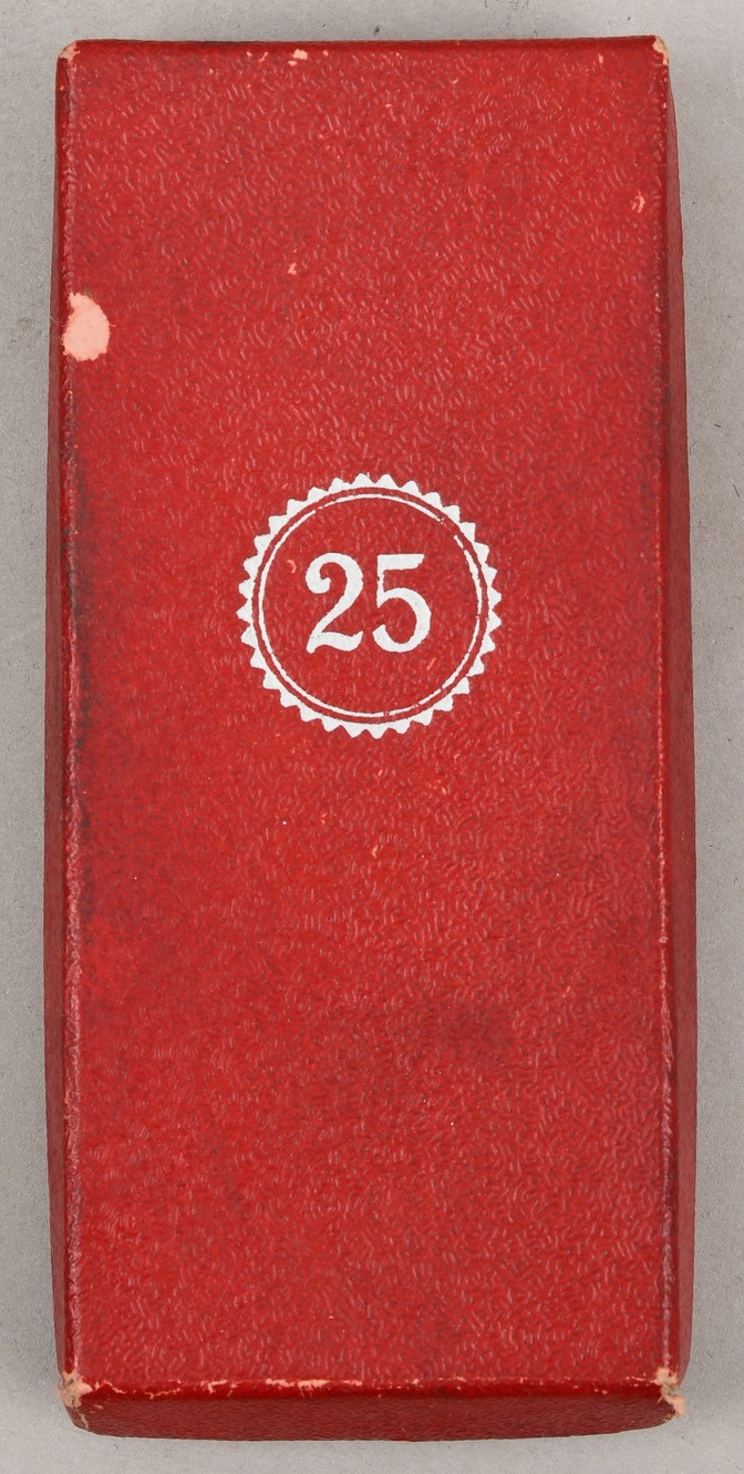 This is a second class die struck alloy decoration with nickel-silver plated highlights, frosted white finish and a black enamel swastika. The cross is complete with ribbed rayon cornflower blue ribbon which has a pin-back device stitched to its reverse top. The award is housed in a red simulated leather cardboard case with a “25” encompassed by a cogged wheel embossed in silver to its top. The red felt interior has a slotted retaining cross bar to its base to hold the award in place. The medal is in very good condition with minimal signs of age. The case shows some signs of age and handling.