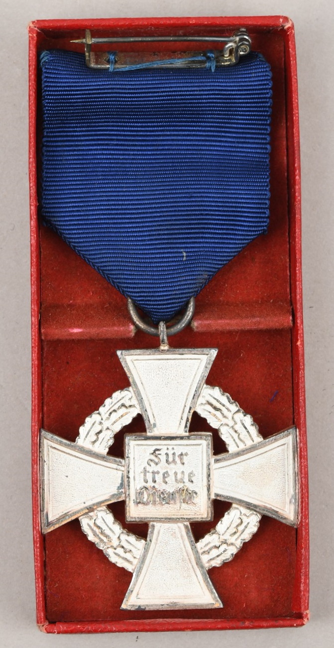 Instituted by Adolf Hitler on January 30th 1938, Faithful Service Decoration in three classes. In recognition of long serving civil servants, and public works personnel. The three classes of the decoration consisted of the special class for fifty years of continuous service with the same employer in the free economic system, the 1’st Class decoration for forty years of service and the 2nd class decoration for twenty-five years service. All three classes followed the same basic design with minor variations.