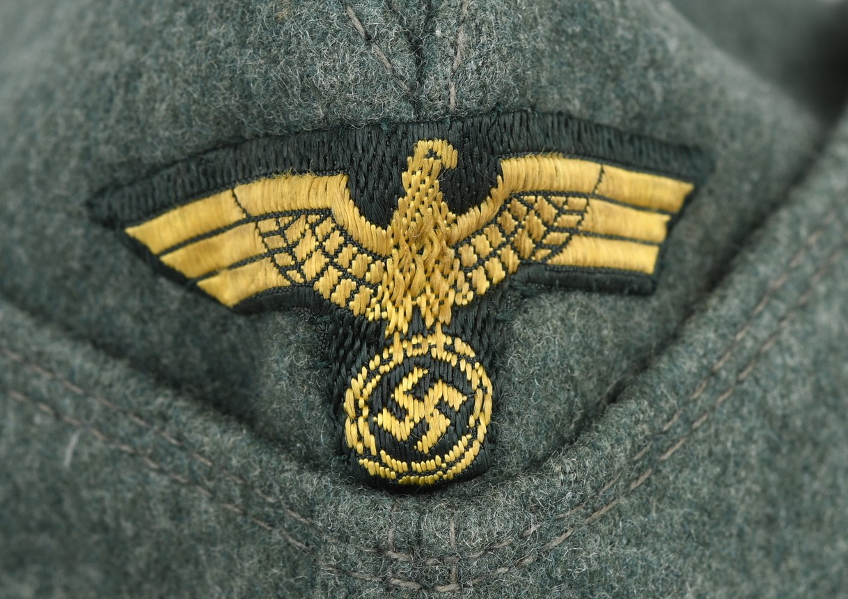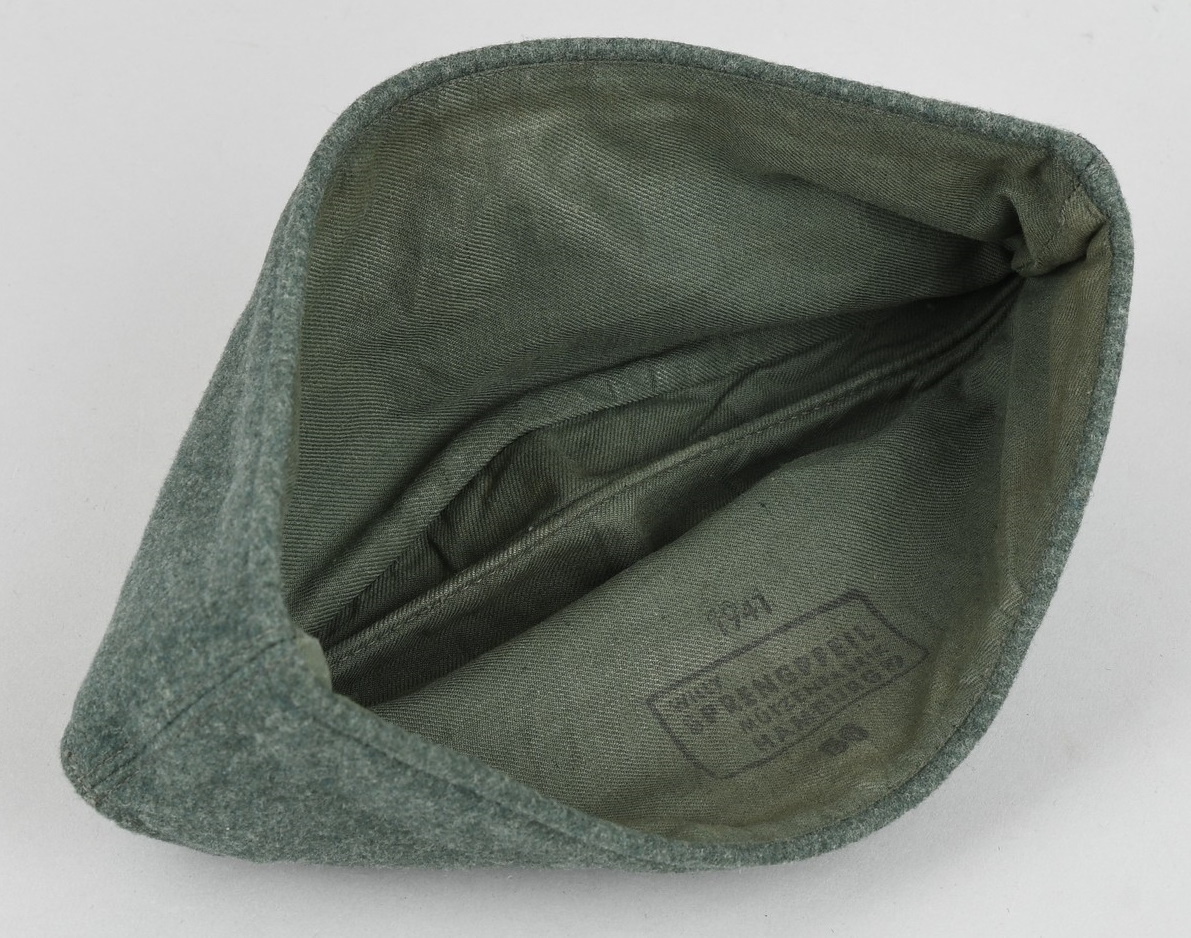 The cap isconstructed of field-grey wool with fold down side and back panels. The front center of the cap has a machine woven EM/NCO’s national eagle in golden yellow threads on a cut-out dark green rayon base. The eagel is neatly hand sewn in place. The front center of the fold down panels has a machine woven national tri-color cockade on dark green rayon base, machine sewn in place. Both pieces of insignia are original to the cap. A golden yellow soutache is machine sewn in place as well as inserted to two small holes located at the bottom edge.