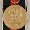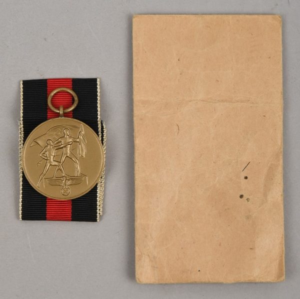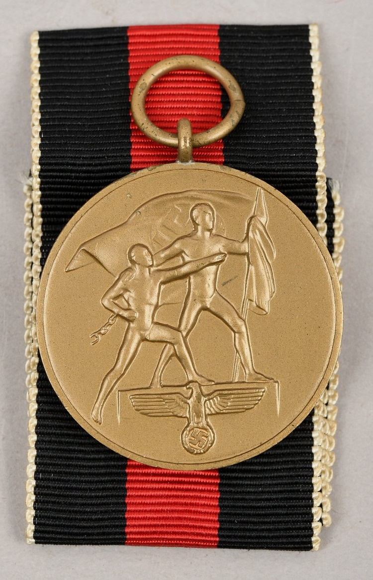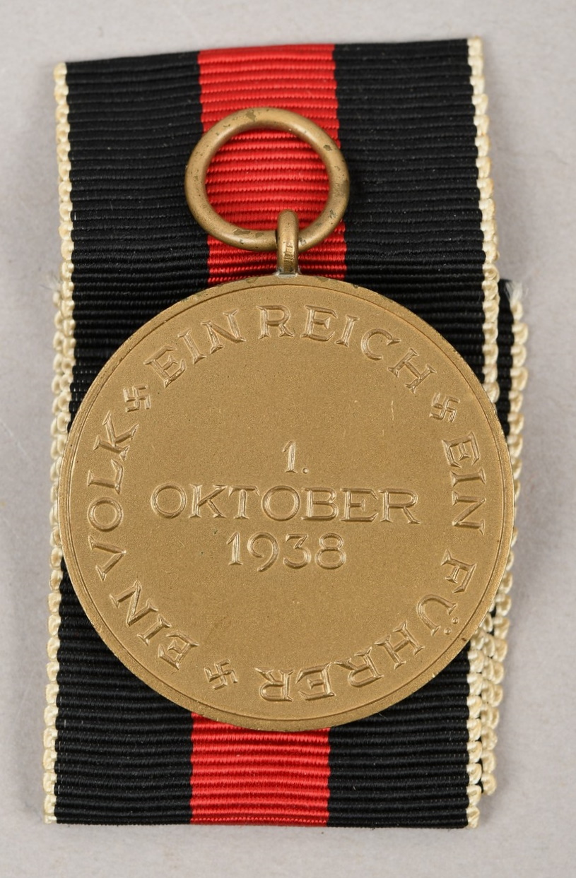 A so called “Sudetenland Medal” constructed of high quality metal, Buntmetal. The medal retains about 99% of its original bronze/gold paint wash. Complete with original ribbon and medal ring. Sewn in place to the ribbon is a functional pin back device. The medal shows minor signs of age and handling.