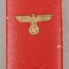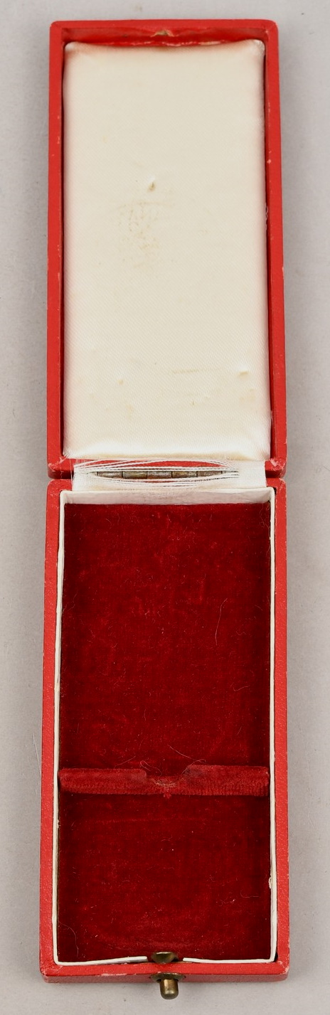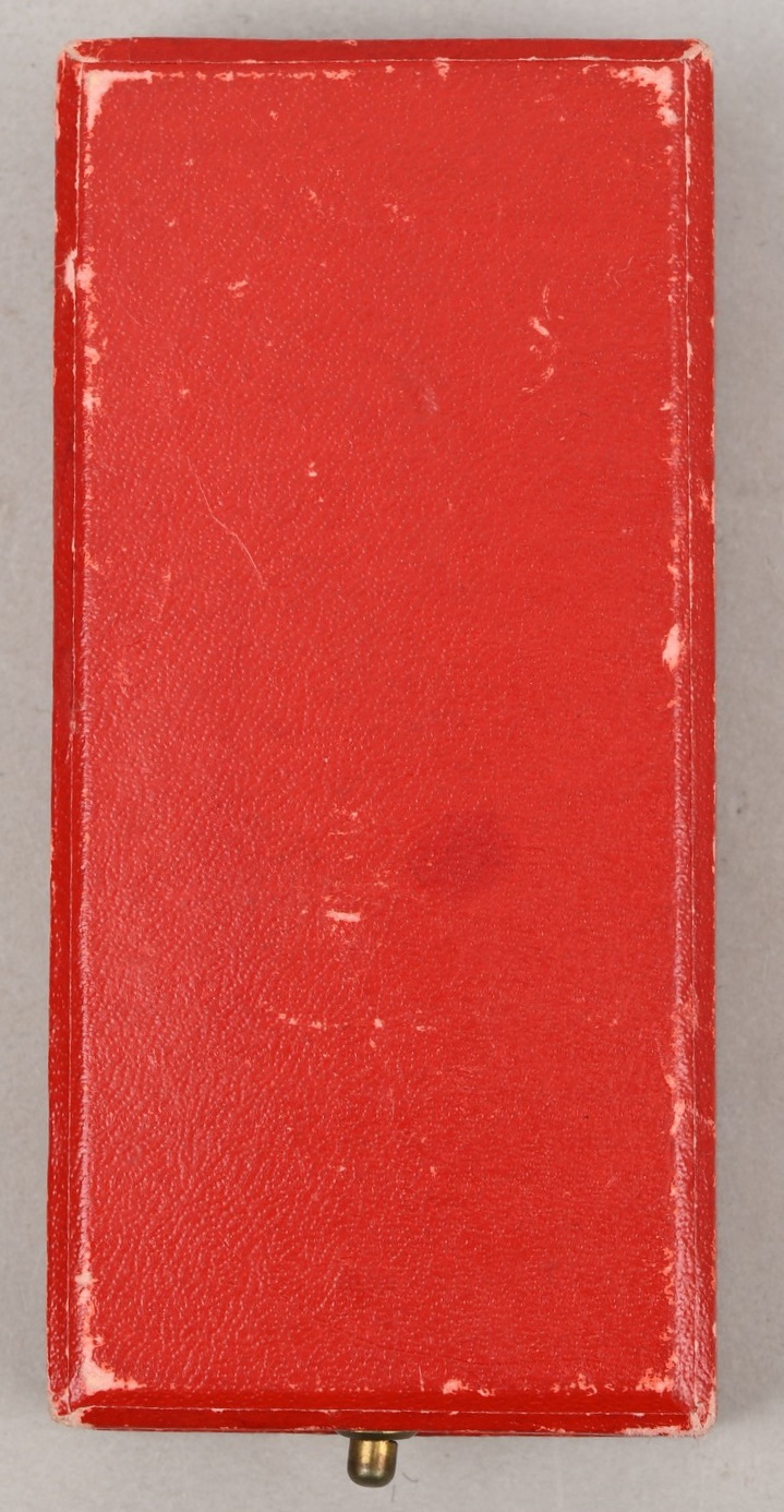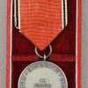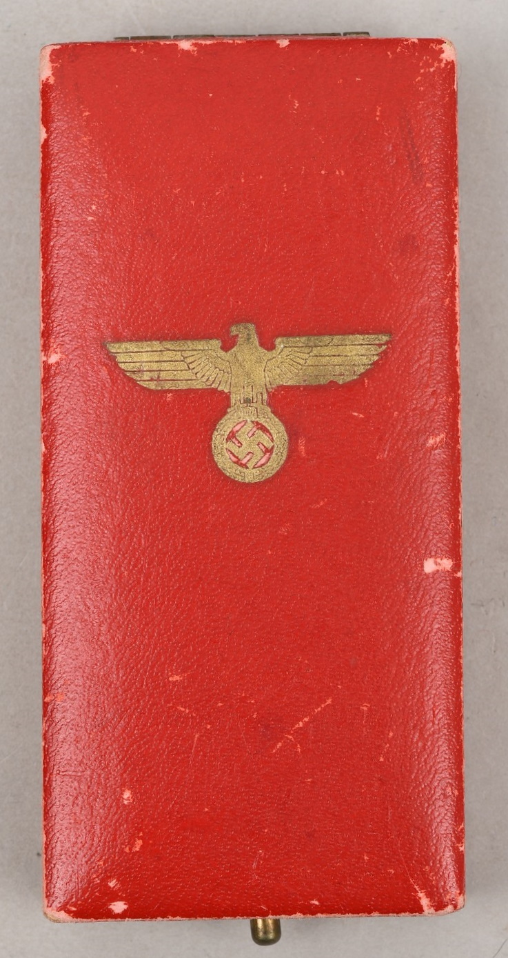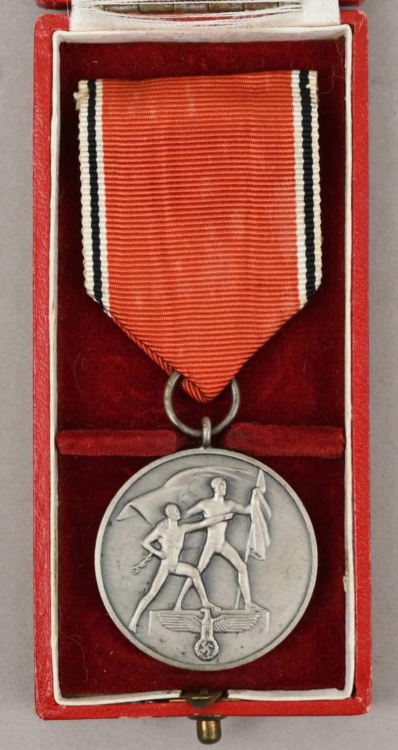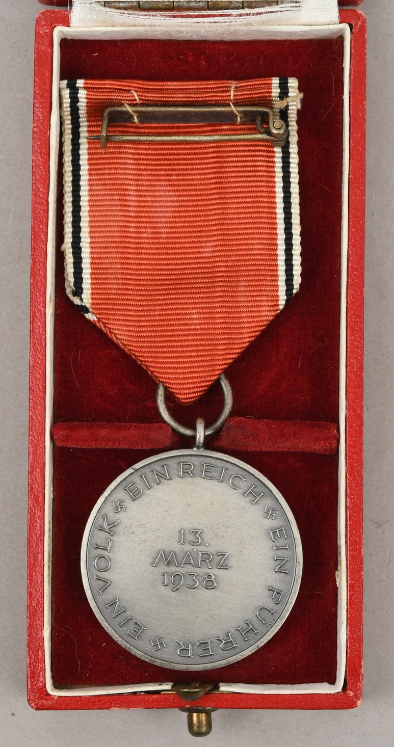 Silver washed, die struck alloy construction medal. The reverse features embossed Latin script to the center, “13th März 1938”, encompassed by additional script, “Ein Volk, Ein Reich, Ein Führer”. The ribbon suspension ring and medal loop are both intact and the award comes complete with its original ribbed rayon ribbon. Fastening device is neatly sewn to the reverse of the eribbon. The medal comes housed in its isue hardshelled case, with red leather immitation cover and gilt eagle on the lid. The case shows light signs of age and handling.