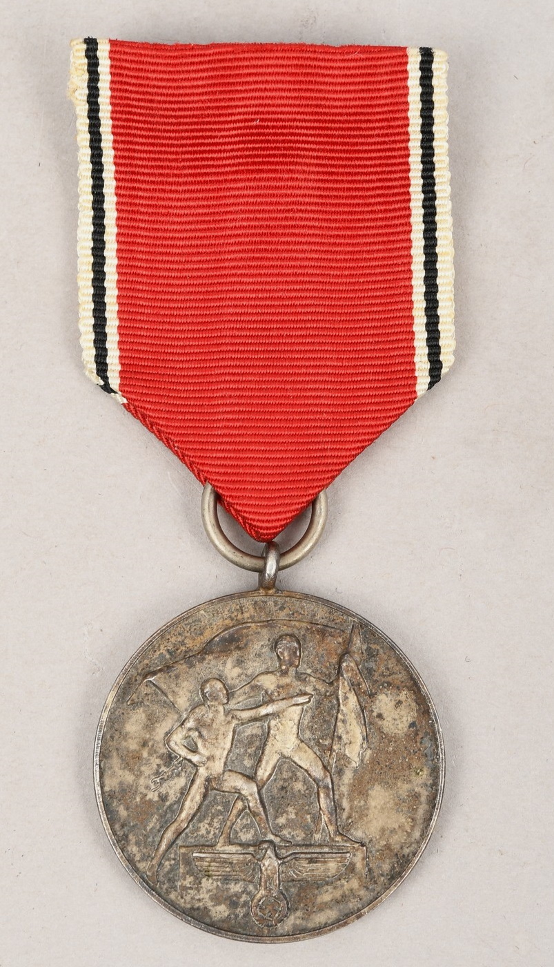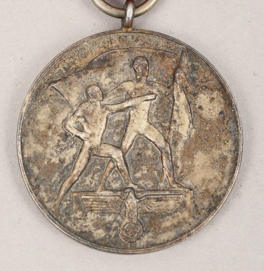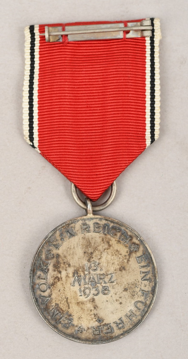 Silver washed, die struck alloy construction medal. The reverse features embossed Latin script to the center, “13th März 1938”, encompassed by additional script, “Ein Volk, Ein Reich, Ein Führer”. The ribbon suspension ring and medal loop are both intact and the award comes complete with its original ribbed rayon ribbon. The medal shows some age tarnish.