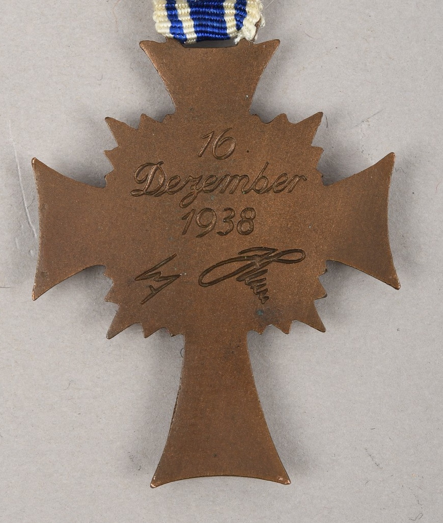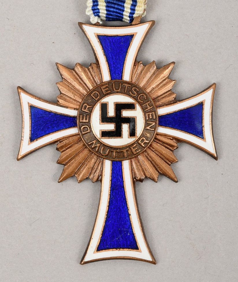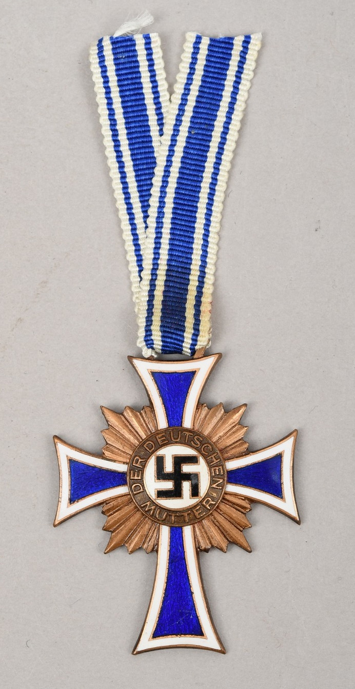 The Cross of Honour of the German Mother was instituted on December 16, 1938, to recognise women who had given birth and successfully raised a large number of “racially pure” children. The decoration, which was intended to encourage women to bear more children, was considered to be the most significant award that could be conferred upon a woman. The award was established in three classes, Bronze, Silver, and Gold. Bronze was issued to mothers of 4-5 children, Silver to mothers of 6-7 children, and Gold to mothers of 8 or more children.