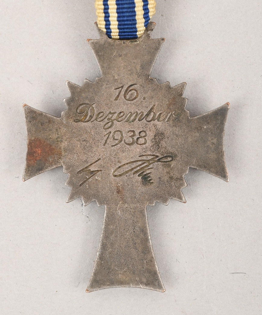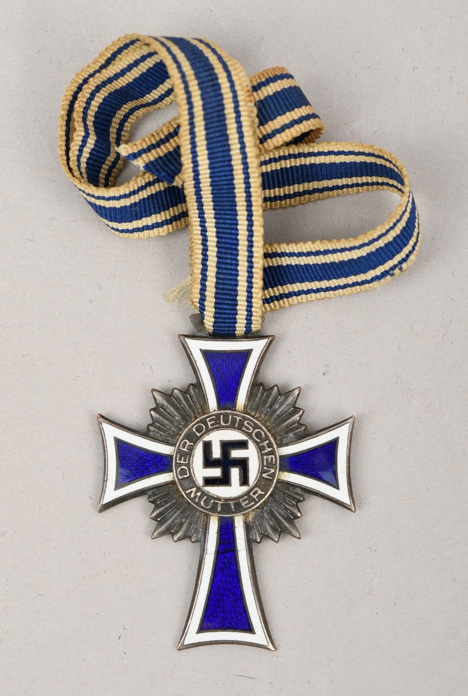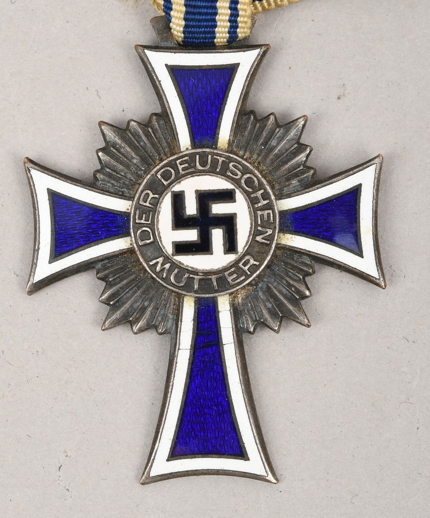The Cross of Honour of the German Mother was instituted on December 16, 1938, to recognise women who had given birth and successfully raised a large number of “racially pure” children. The decoration, which was intended to encourage women to bear more children, was considered to be the most significant award that could be conferred upon a woman. The award was established in three classes, Bronze, Silver, and Gold. Bronze was issued to mothers of 4-5 children, Silver to mothers of 6-7 children, and Gold to mothers of 8 or more children.