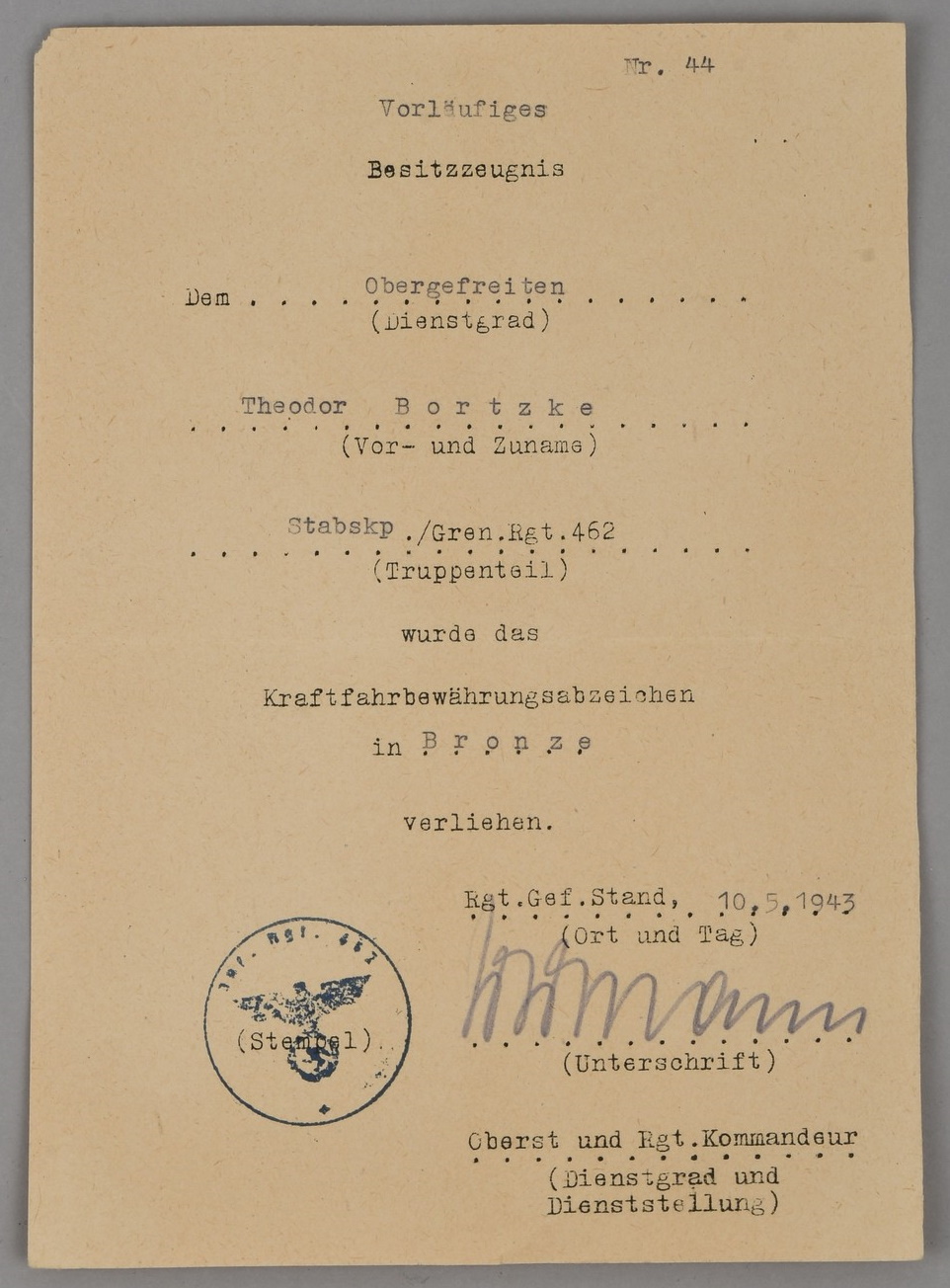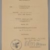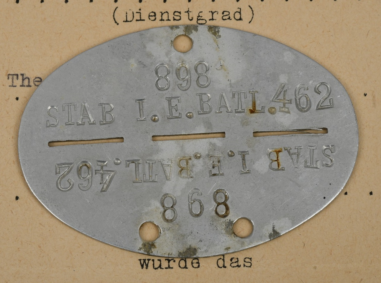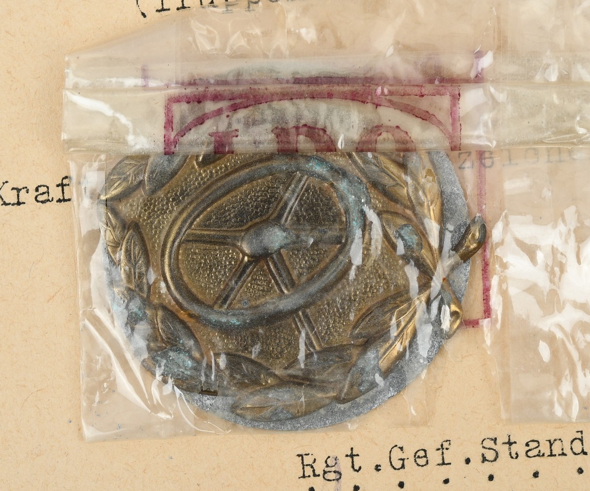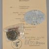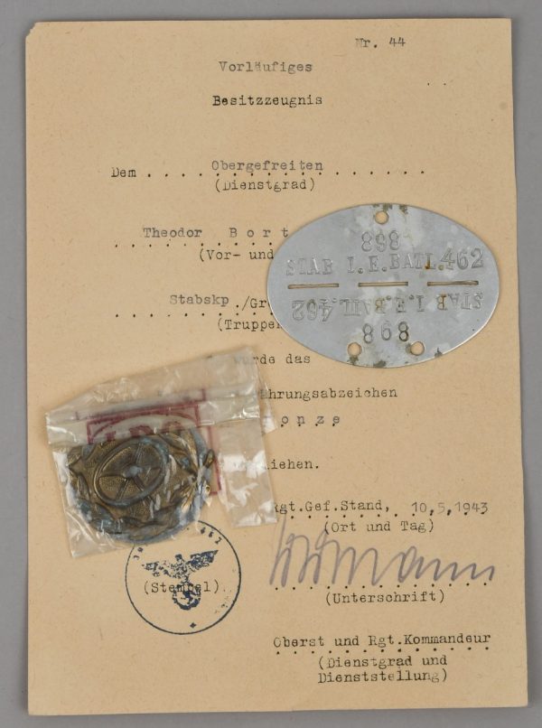 Small and complete grouping: Preliminary award document, Drivers badge in bronze. Awarded to Obergefreiter Theodor Bortzke, serving in Stabskp Gren. Rgt 462. Dated, 10.5.1943 and signed by the company Oberst. The document is in very good condition with minor signs of age. The document comes with the drivers badge in bronze. The badge is still in it’s original LDO marked cellophane bag of issue (rare to find). The badge although still in the badge shows some corrosion. The grouping is complete with a complete dog tag. The dog tag is marked “STAB I.E, BATL. 462” and “A” to the reverse for blood group A.