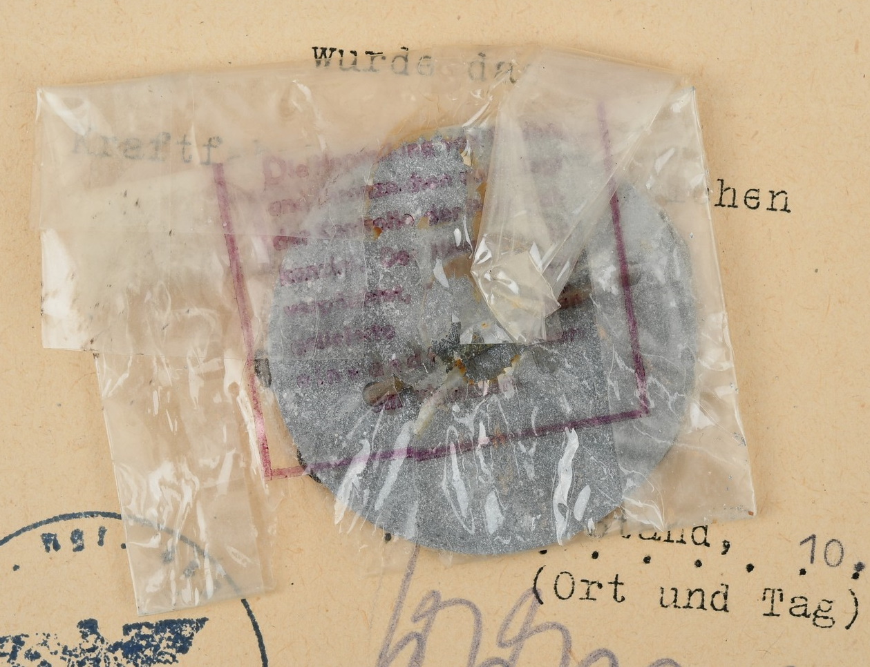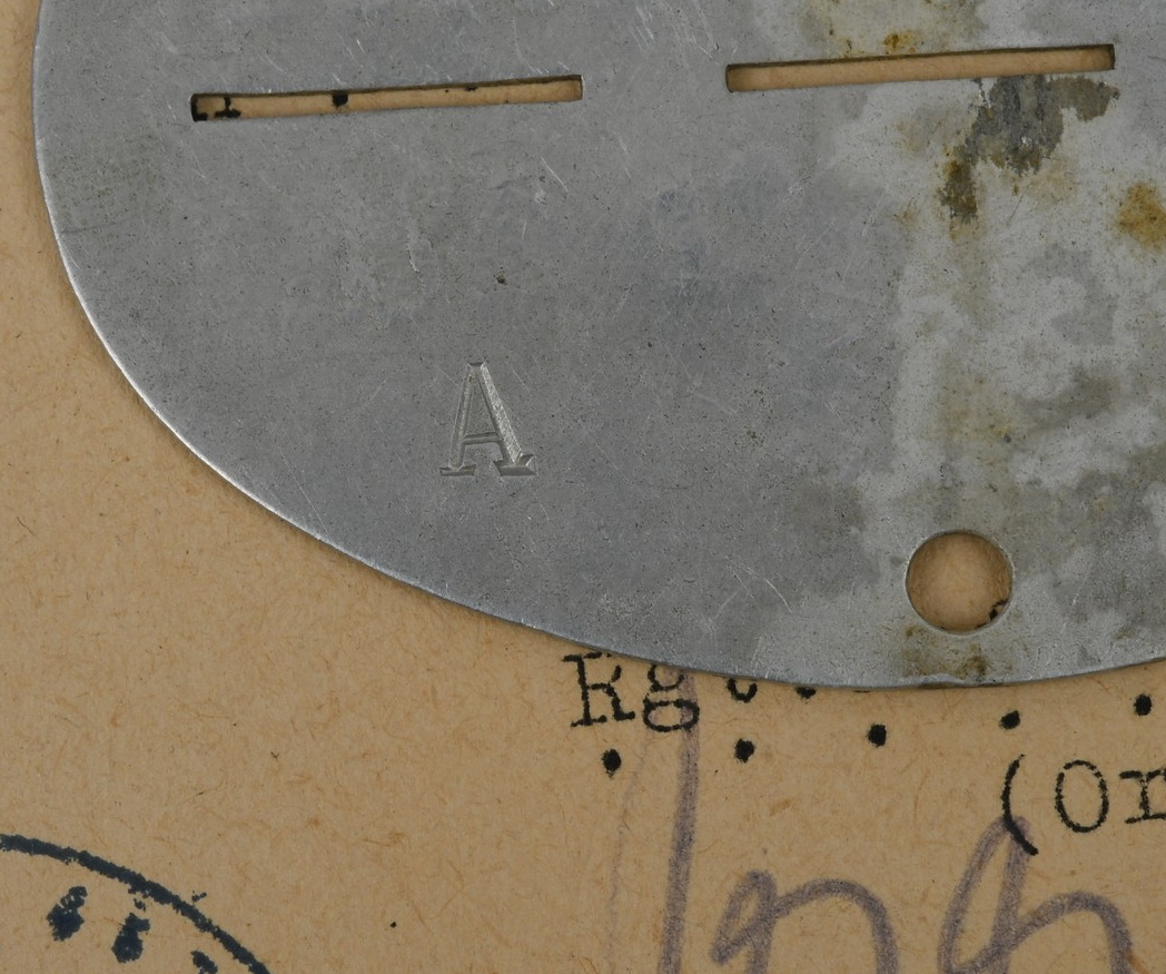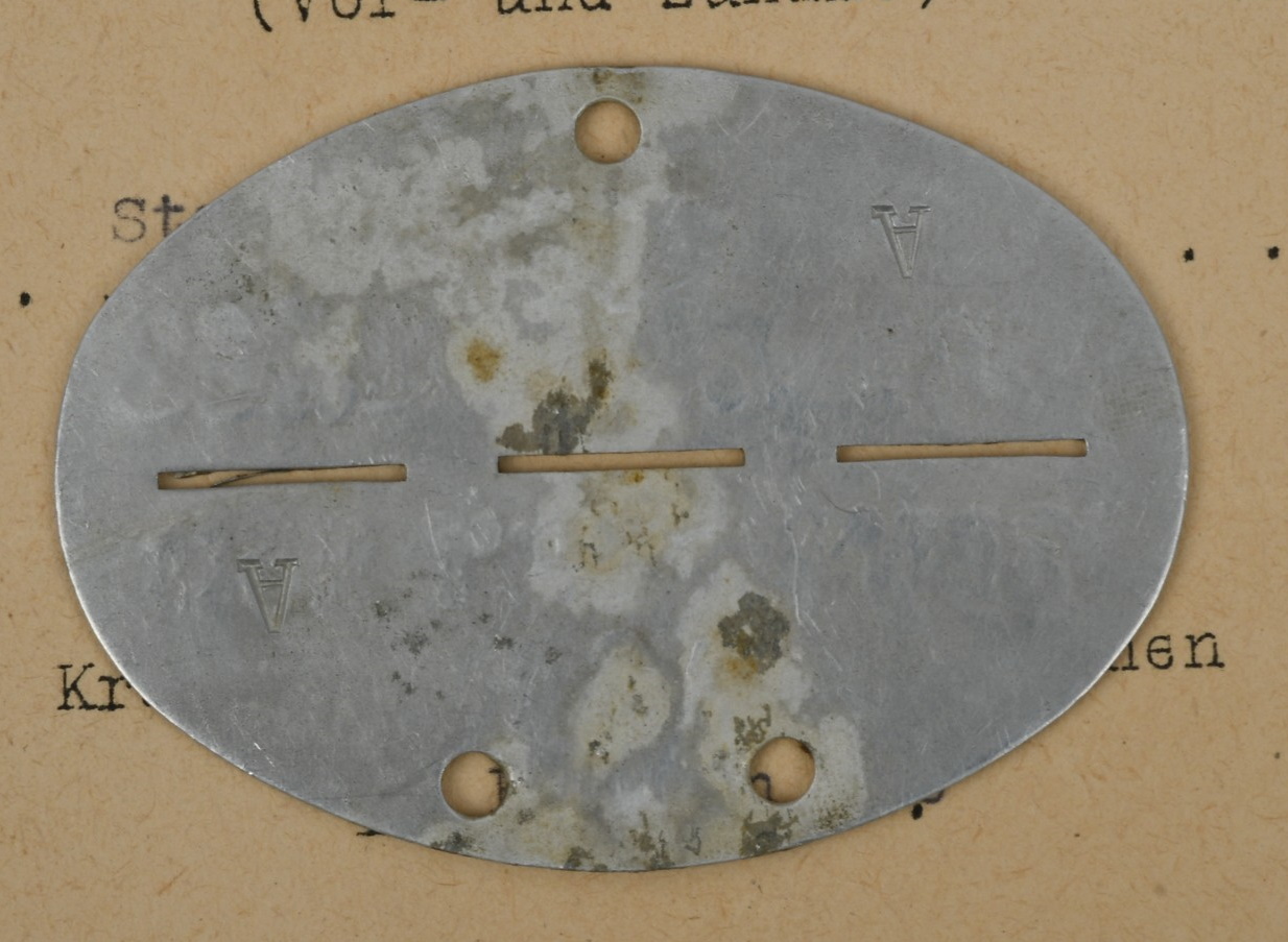 Small and complete grouping: Preliminary award document, Drivers badge in bronze. Awarded to Obergefreiter Theodor Bortzke, serving in Stabskp Gren. Rgt 462. Dated, 10.5.1943 and signed by the company Oberst. The document is in very good condition with minor signs of age. The document comes with the drivers badge in bronze. The badge is still in it’s original LDO marked cellophane bag of issue (rare to find). The badge although still in the badge shows some corrosion. The grouping is complete with a complete dog tag. The dog tag is marked “STAB I.E, BATL. 462” and “A” to the reverse for blood group A.