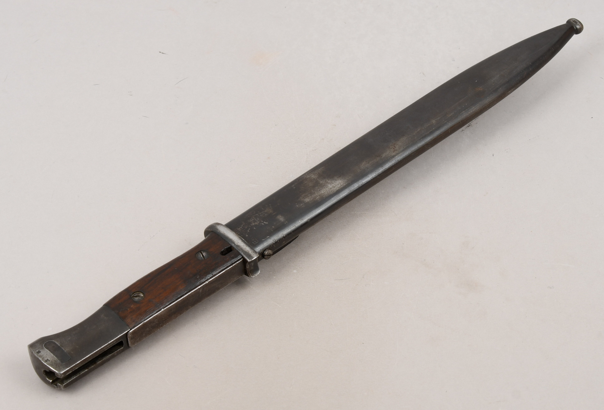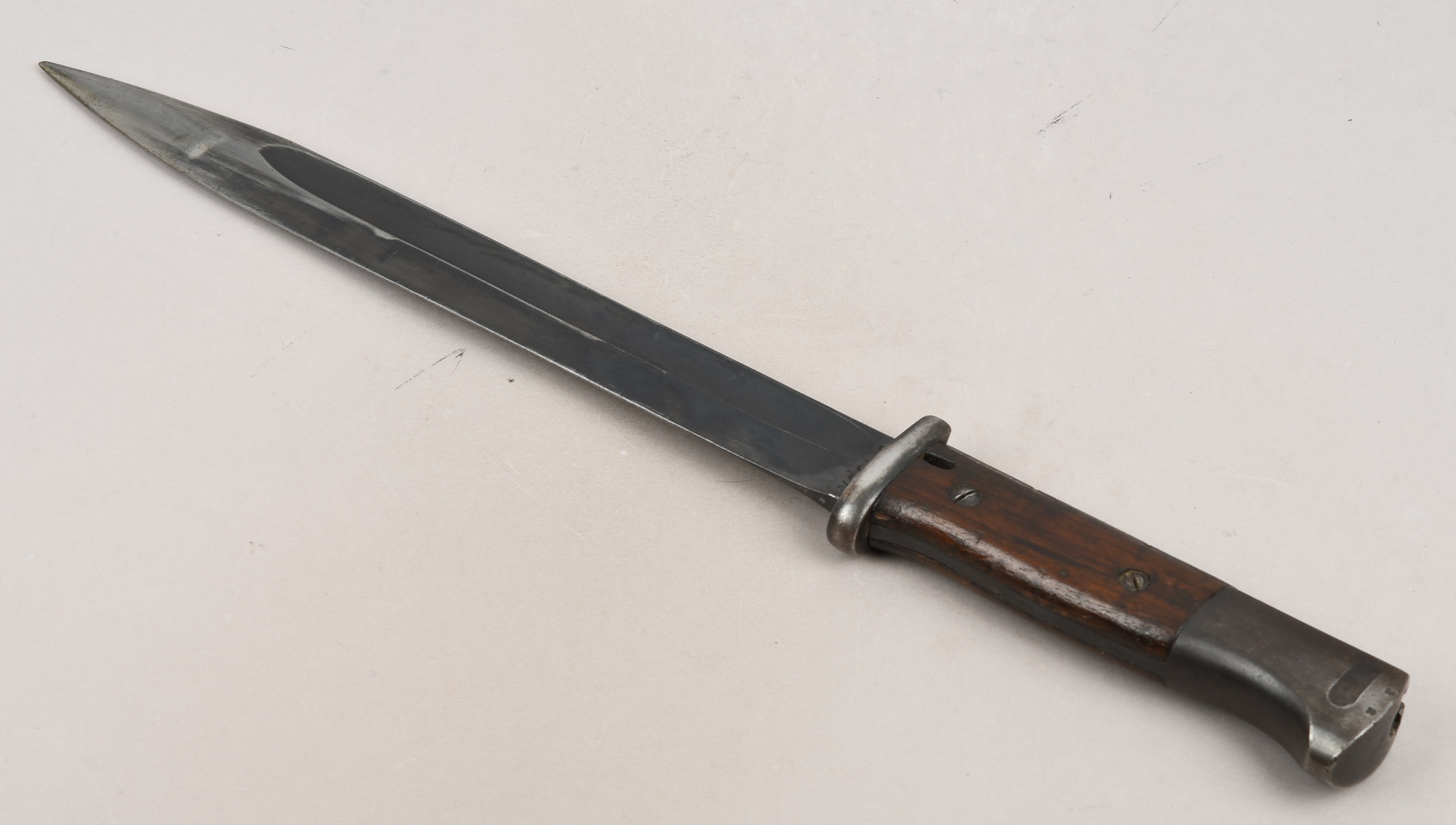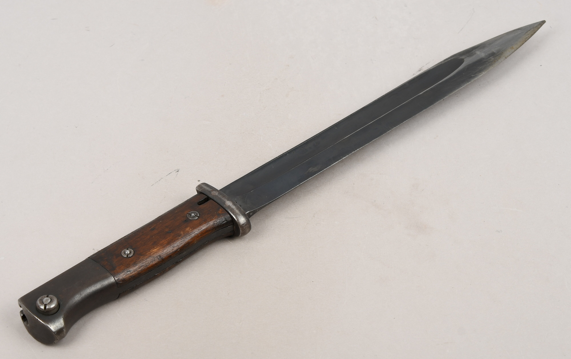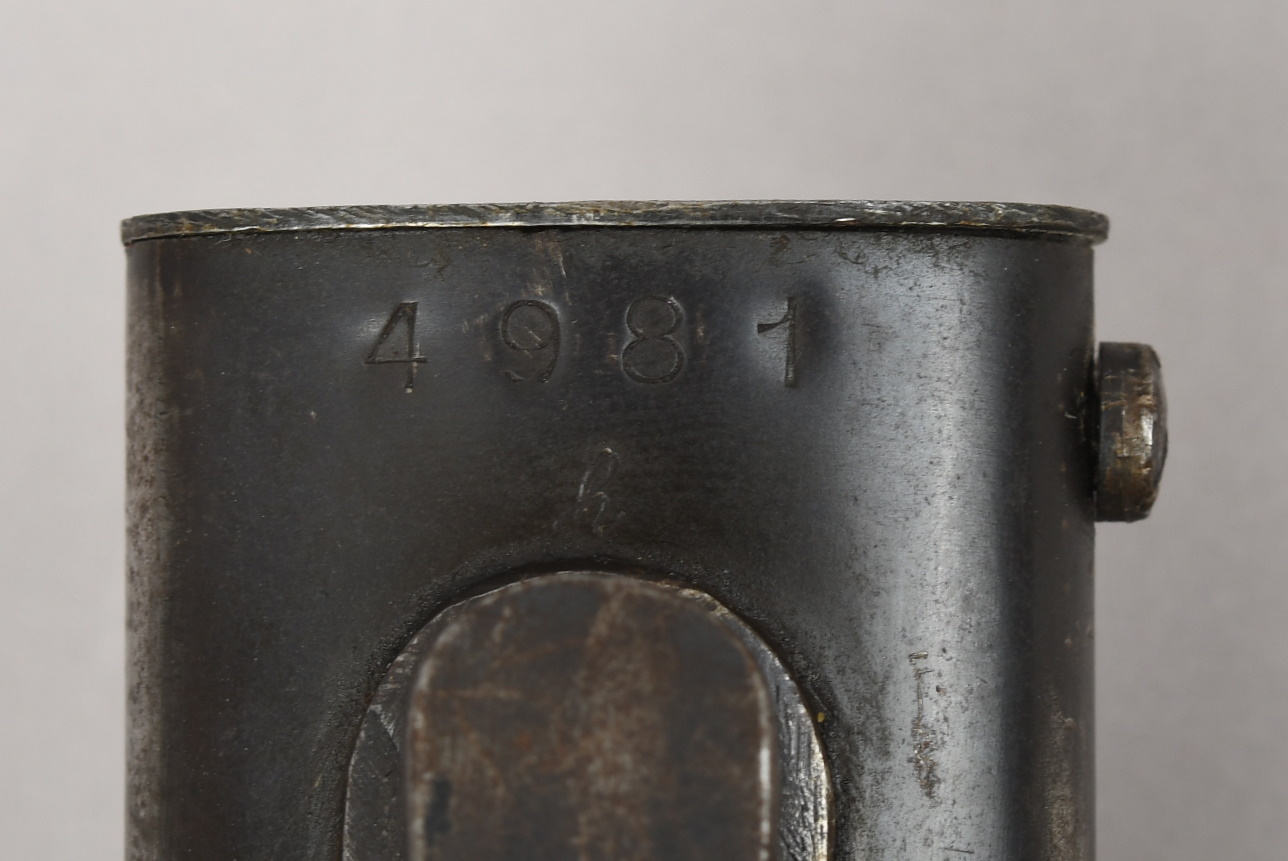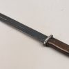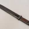 Drop forged, steel construction blade with wide fullers. Blade retains most it’s original blueing. Blade and scabbard are both marked, but do not match. Wood grip. Stud functions well. In good condition with some signs of age and real use.
