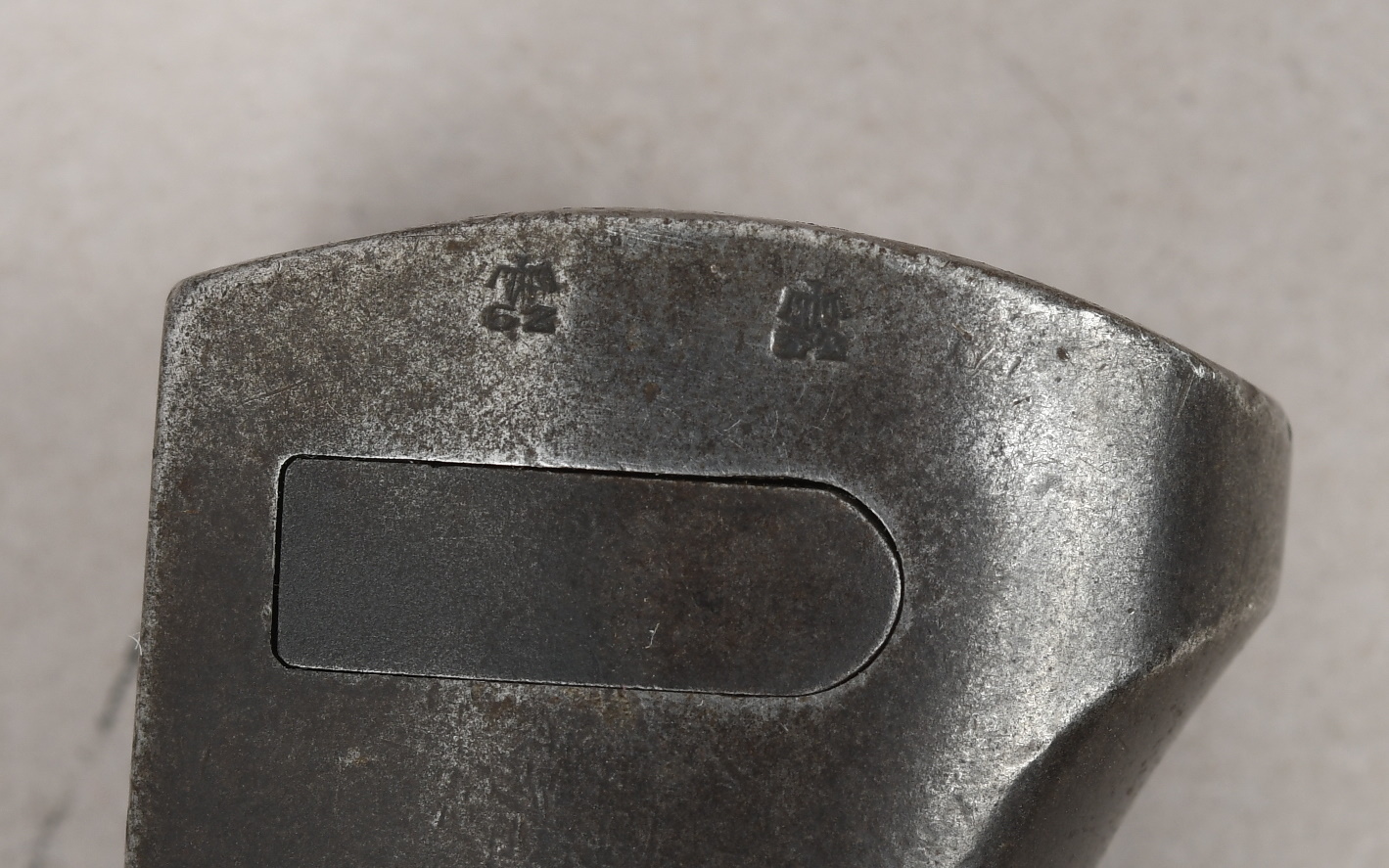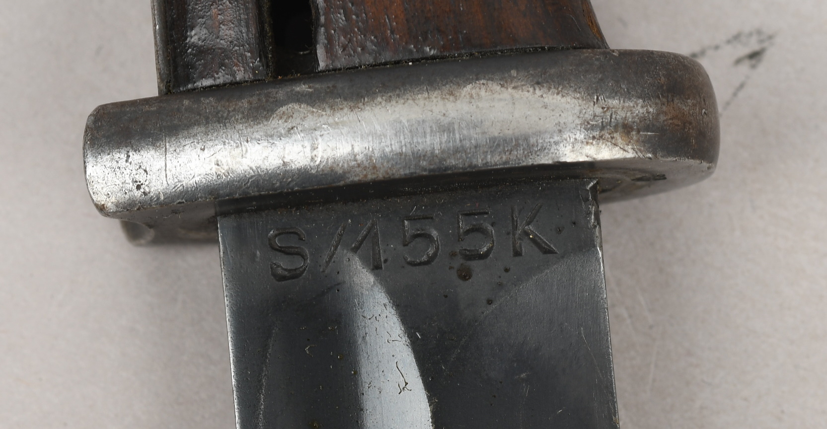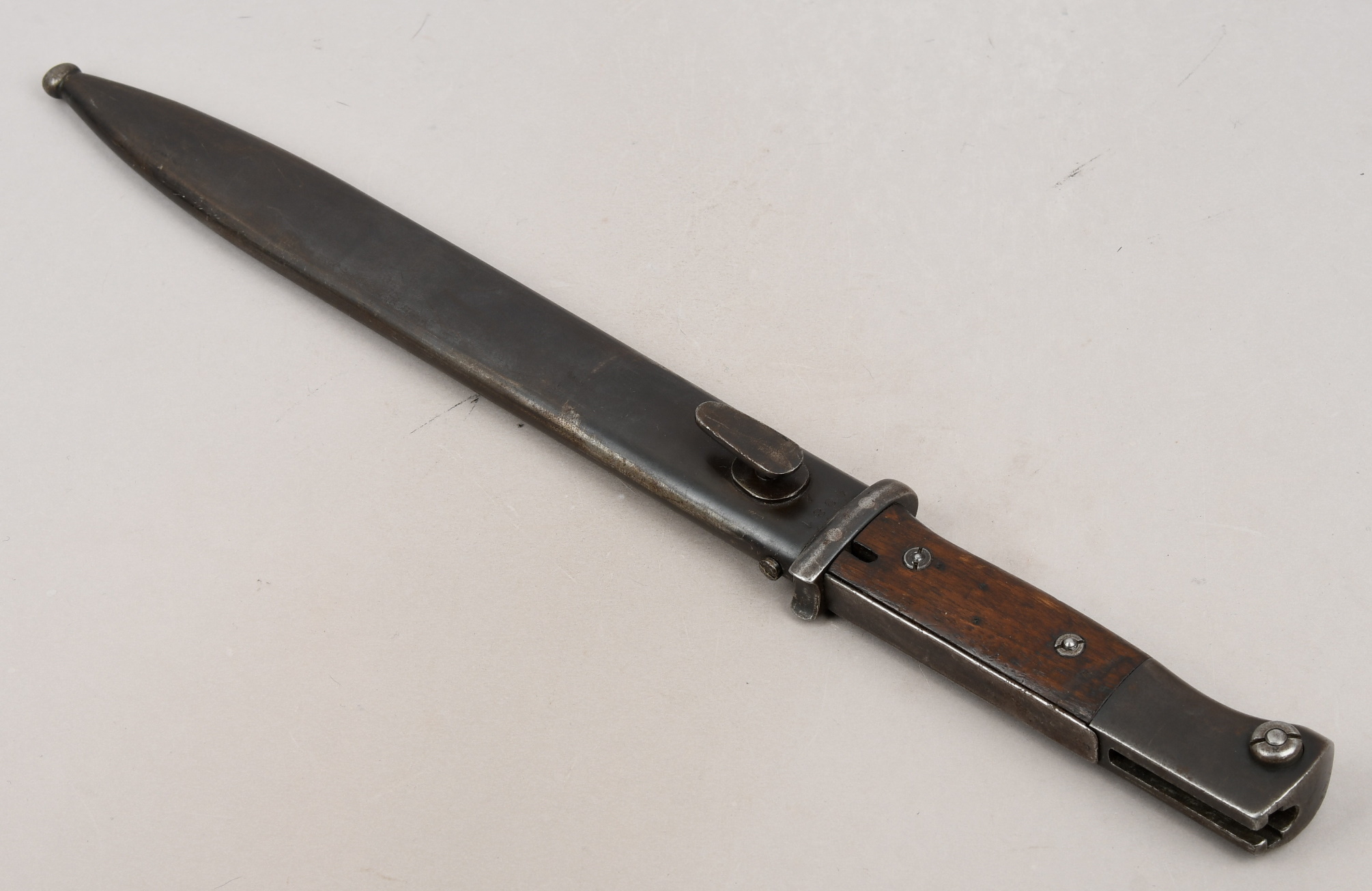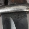 Drop forged, steel construction blade with wide fullers. Blade retains most it’s original blueing. Blade and scabbard are both marked, but do not match. Wood grip. Stud functions well. In good condition with some signs of age and real use.