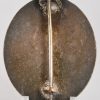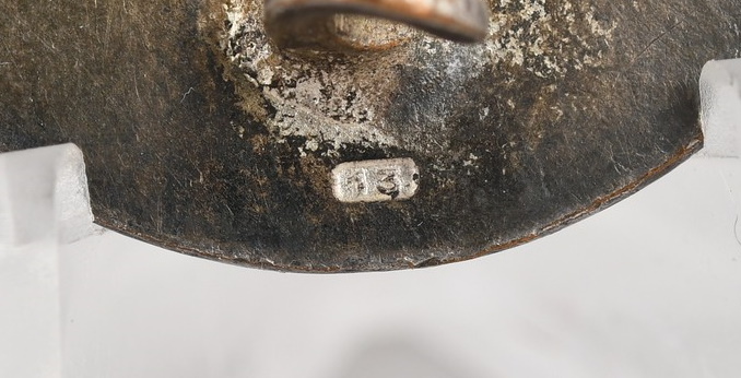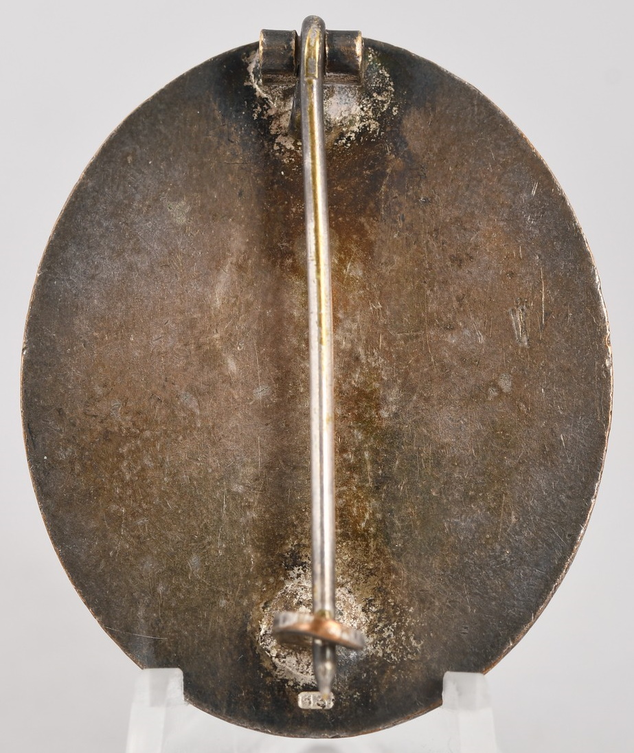 This is the 1939 pattern, early die stamped, high quality Tombak construction badge with a silver paint wash. The badge retains about 90% of its original silver wash to the obverse. Reverse has the hinge, pin and catch all intact. The badge is maker marked stamped “13” below the catch, which is the PK code for the maker “Gustav Brehmer, Machnuekirchen”. The badge shows a very nice age and wear patina.