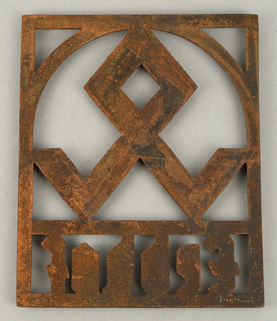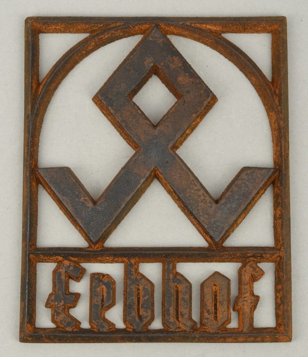 Rare original cast iron Reichsnährstand “Erbhof” sign (Erbhof-Erkennungszeichen). According to the “Reichserbhofgesetz” of September 29. 1933. an Aryan farm could only be passed on to the eldest son if he could prove his Aryan origins dating back to at least 1800. These signs hung at the farm designated as an “Erbhof” between 1933 and 1945. After the war, the signs were removed and, in many cases, destroyed. The cast iron sign depicts the Odal Rune; the sign measures 24.5 x 19.5 cm. The sign is in good condition with some surface rust.