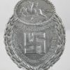 Constructed of die struck alloy metal with a silver finish. The obverse consisting of an oval oak leaf wreath, topped by a plaque featuring a raised Saxon horse situated above a date of “1933”, surrounding a central raised mobile swastika, circumscribed by an inscription of “GAUTAG OSTHANNOVER IM JAHRE DER NATIONLASOZIAL. ERHEBUNG” the reverse with a original fastening device. Reverse is also nicely maker marked in high relief.