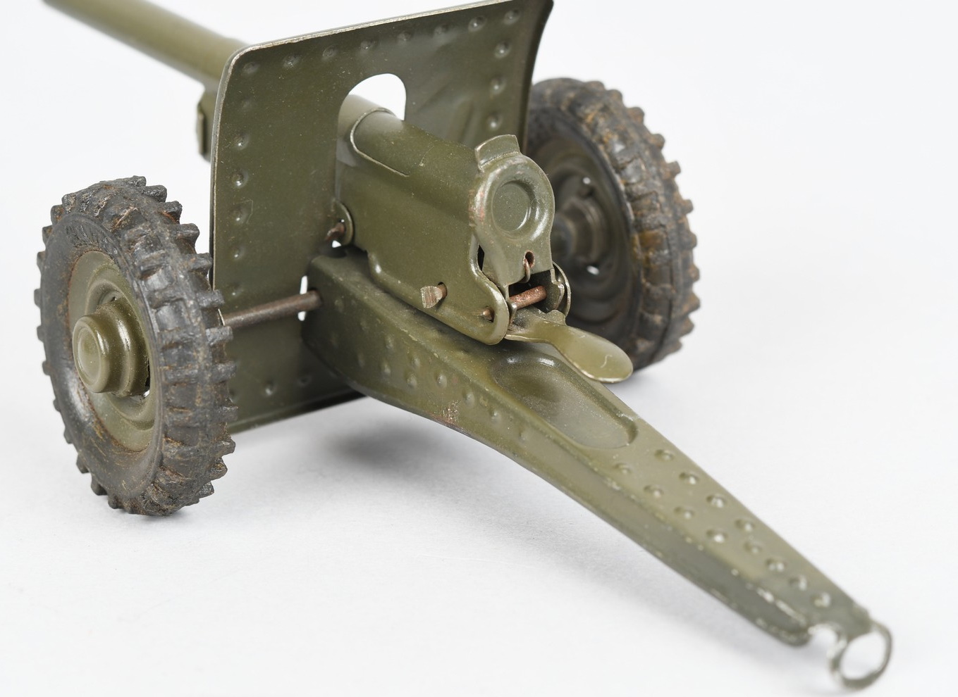 Toy howitzer produced by the Company Hauser in the 1930’s. Sheet metall with field-grey paint in very good condition. All parts intact and functional spring. Maker marked “Hausser Germany”.