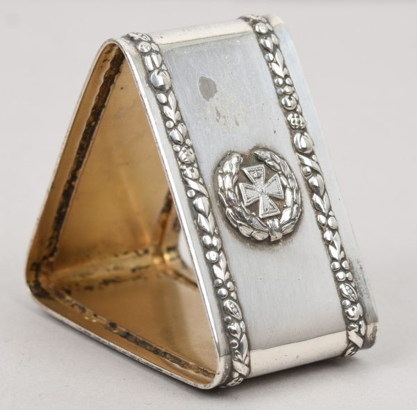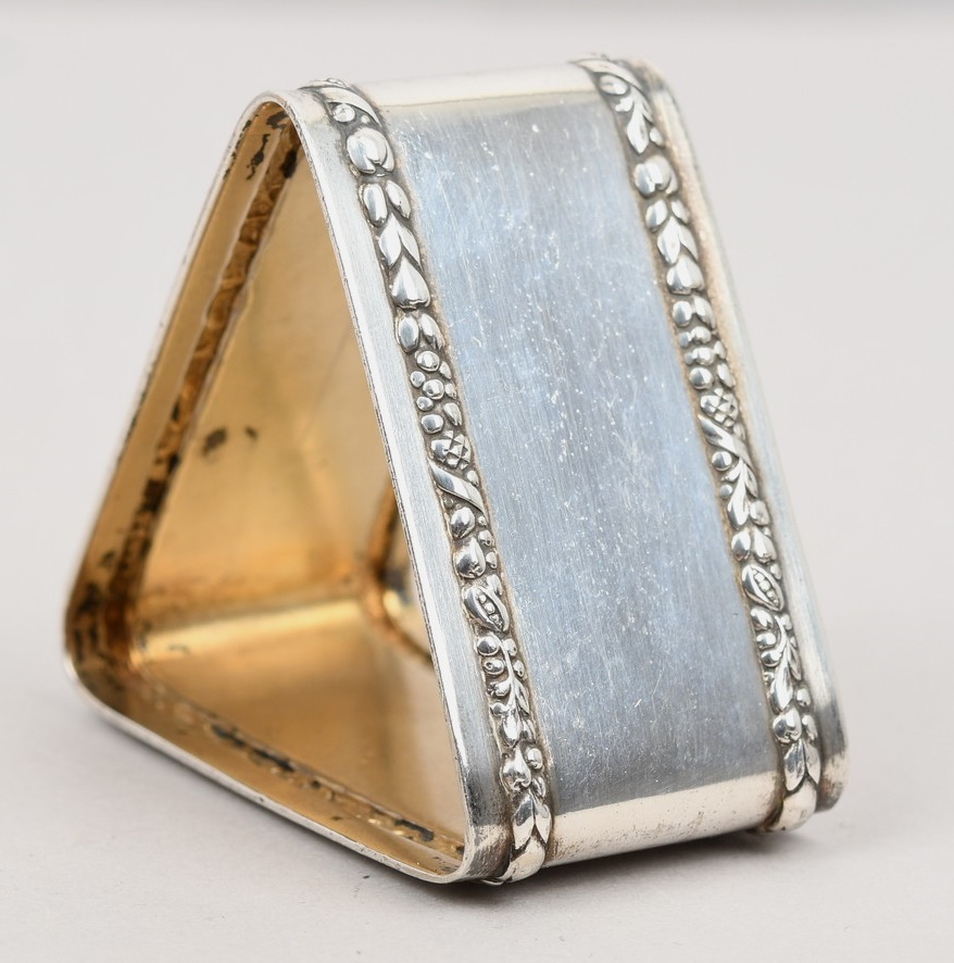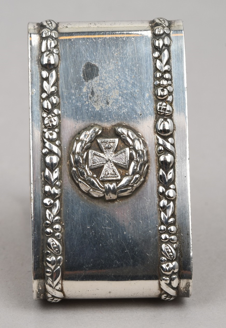 Patriotic napkin holder, produced during WWI. Constructed of silverplated non ferrous metal. Nicely ornamented with a WWI type Iron Cross to the center. In very good condition with light signs of age.