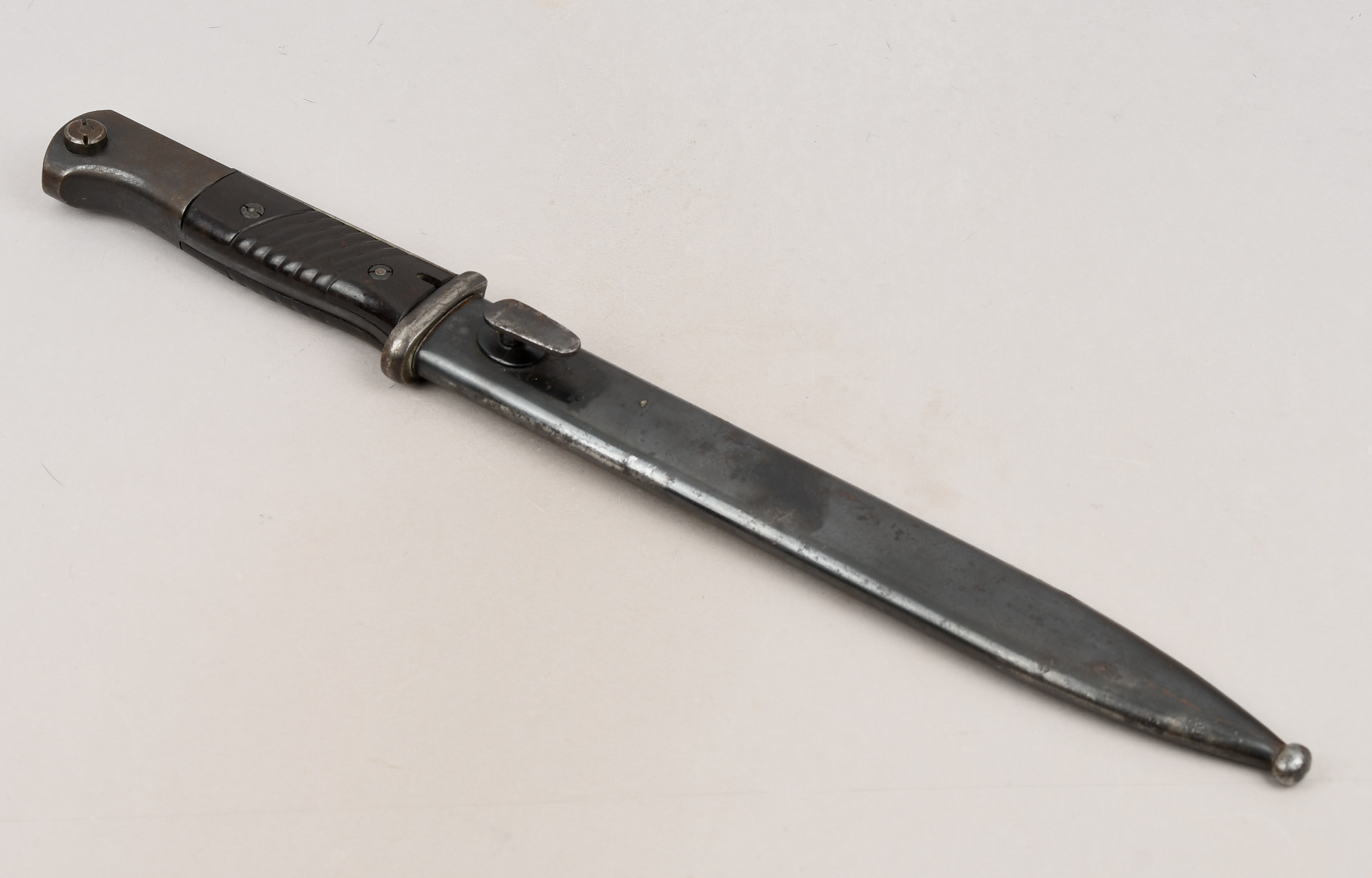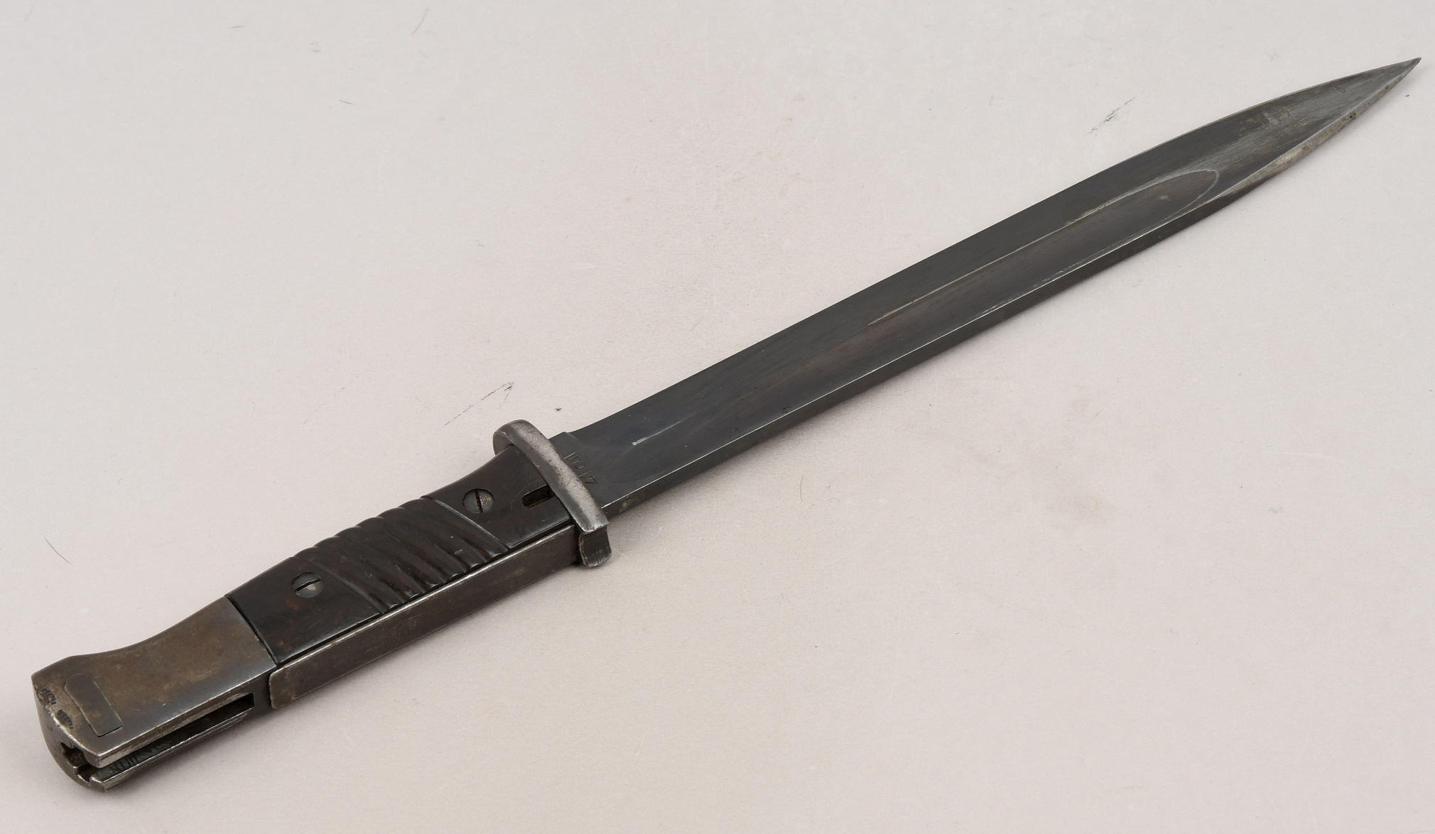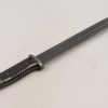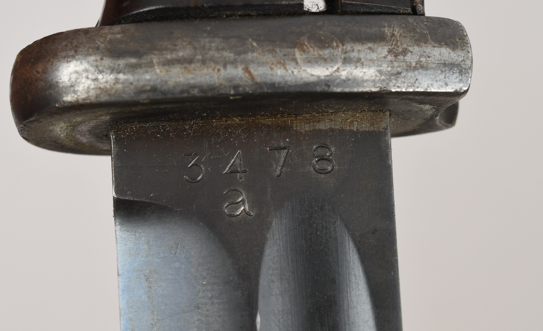 Drop forged, steel construction blade with wide fullers. Blade retains most it’s original blueing. Blade and scabbard are both marked, but do not match. Bakelite grip. Stud functions well. In good condition with some signs of age and real use.