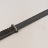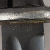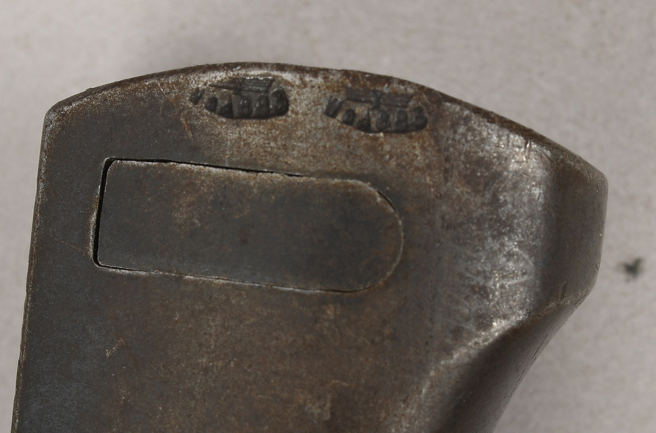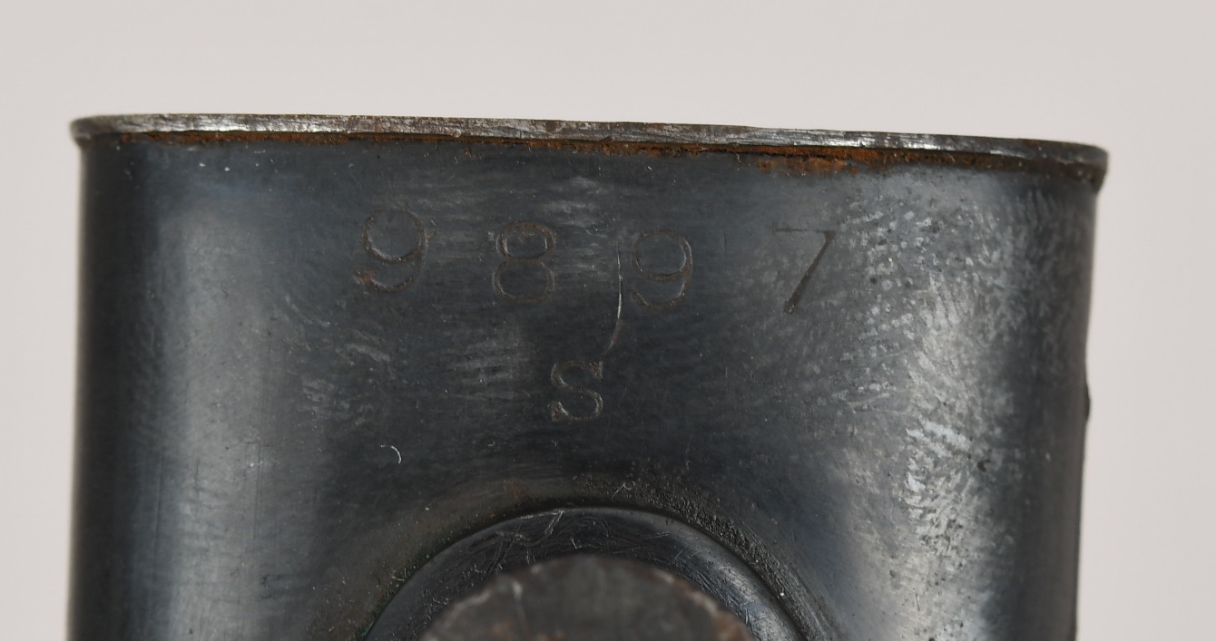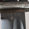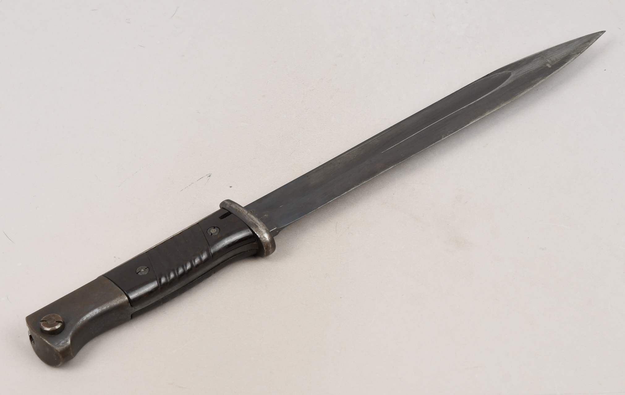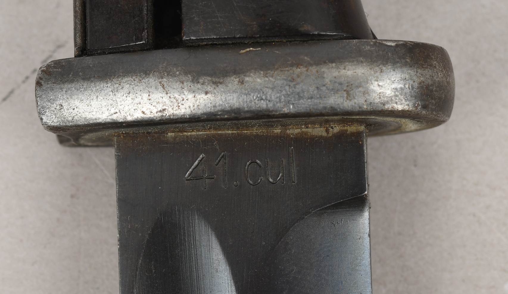 Drop forged, steel construction blade with wide fullers. Blade retains most it’s original blueing. Blade and scabbard are both marked, but do not match. Bakelite grip. Stud functions well. In good condition with some signs of age and real use.