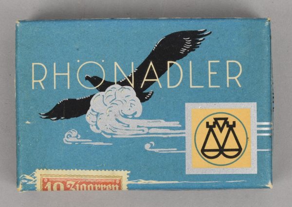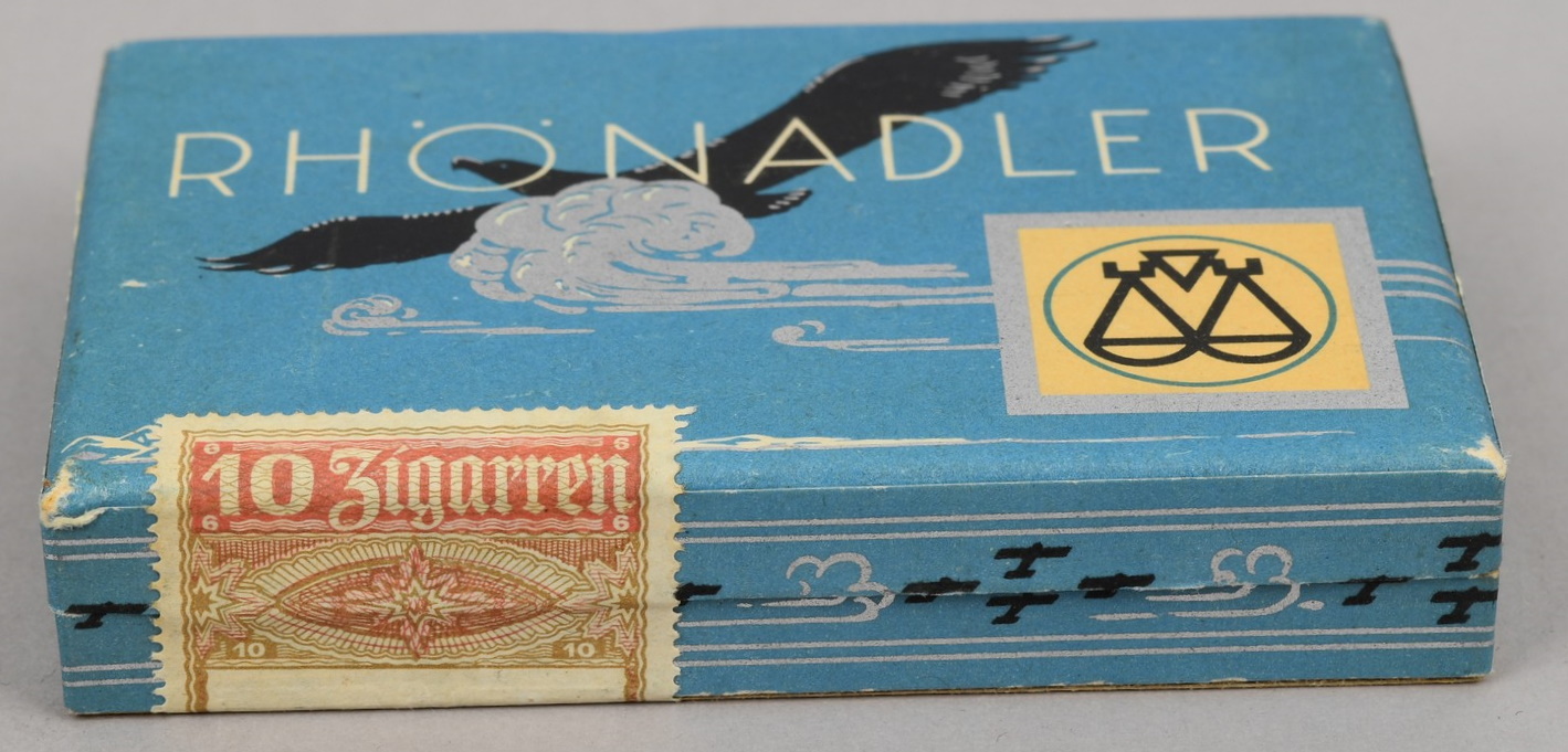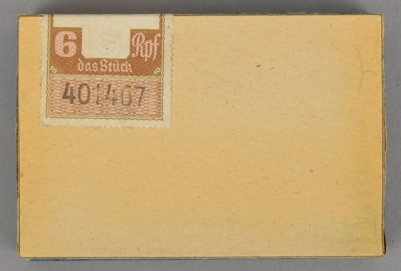 Cardboard construction cigarette package with printed script and logo. The package still has its original, un-broken glued on, tax seal. The tax seal also has printed script which includes the quantity of cigarettes, and price. Never opened with intact content. In very good condition with minor signs of age.