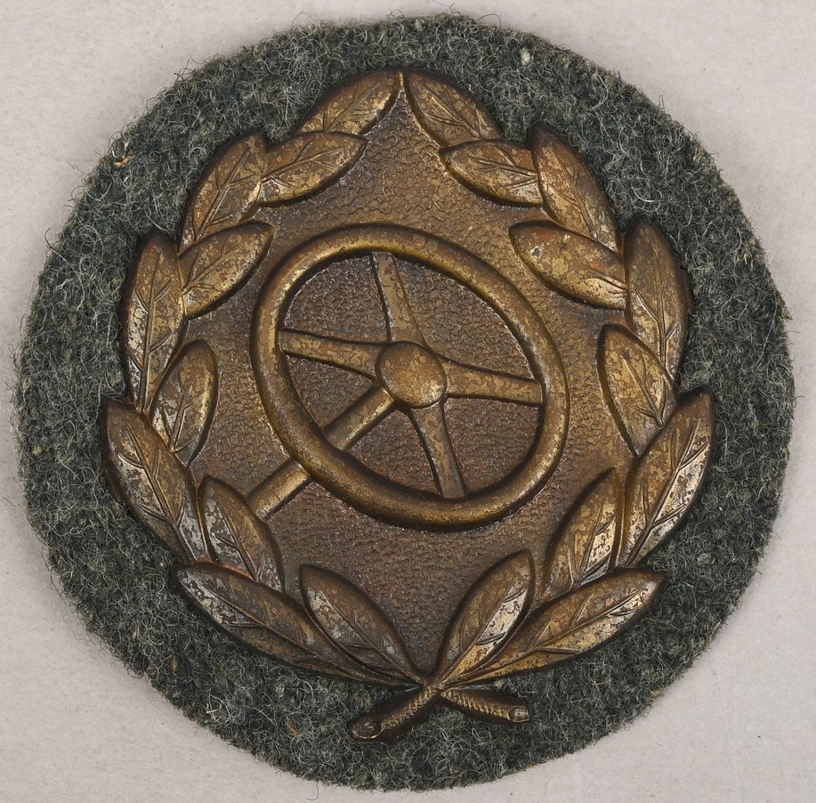 On 23rd October 1942 Germany introduced a series of three Motor Vehicle Driver’s Proficiency Badges in the grades of bronze, silver and gold with qualifications for bestowal of the badges being retroactive to 1st December 1940. The badges were awarded to both Wehrmacht, (Armed Forces), personnel and civilian personnel, including Foreign volunteers and auxiliary personnel, under Wehrmacht command, who had fulfilled the required criteria. The criteria for bestowal of one of the badges varied with exceptional driving ability and vehicle maintenance being the main considerations and also included a prescribed amount of days under difficult weather or combat conditions. When awarded the badge was accompanied by an award certificate and was to be worn on the lower left sleeve of the field blouse and service tunic. The badges were mounted on cloth bases which were to match the uniform it was to be worn on. This example in bronze, is the lowest of the three grades.