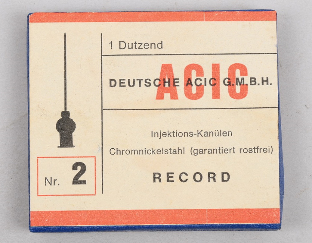 Made of cardboard with blue covered simulated leather top. The top part also has the manufacturers/content label firmly glued in Place. “It reads: Deutsche ACIC G.M.B.H. Injektions-Kanülen” and “Nr. 2” for size “2”. Inside still with unopened celluloid with 12 injection needles. Very good condition with minor signs of age. We have 3, price is for one.