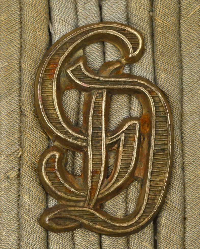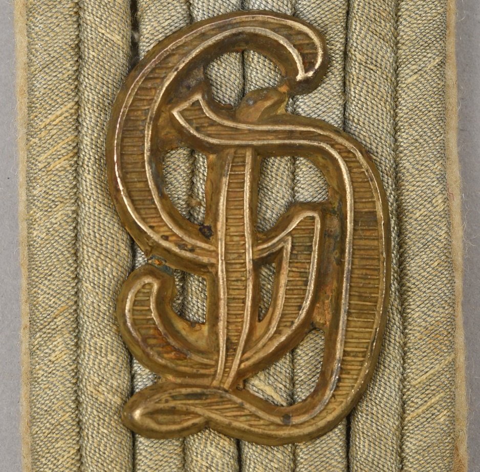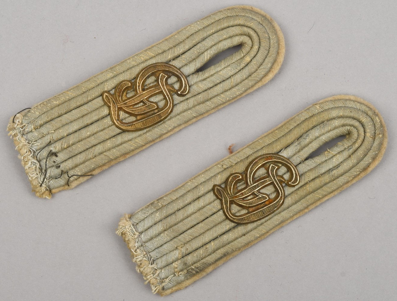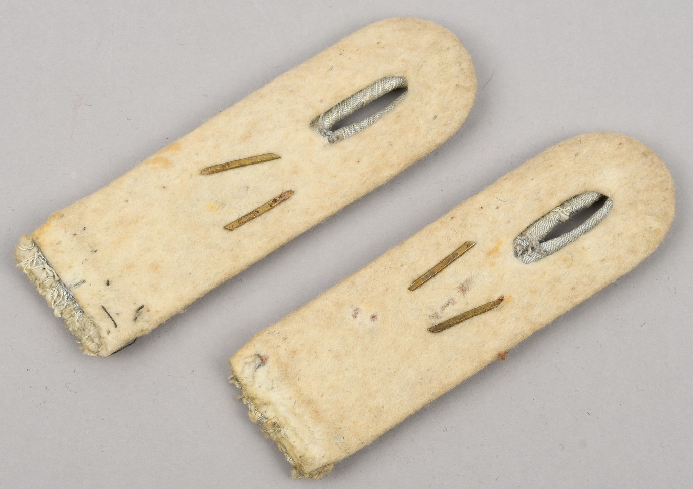 Constructed of white wool with dull russian braid. Pinned in place to each board is a gilt ferrous metal “GD” monogram cypher pinned in place. The perfect matching pair show clear signs of age and real use.