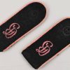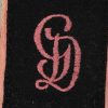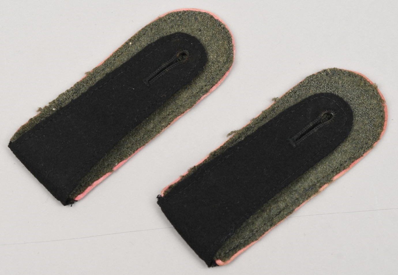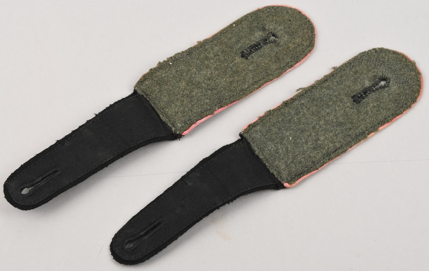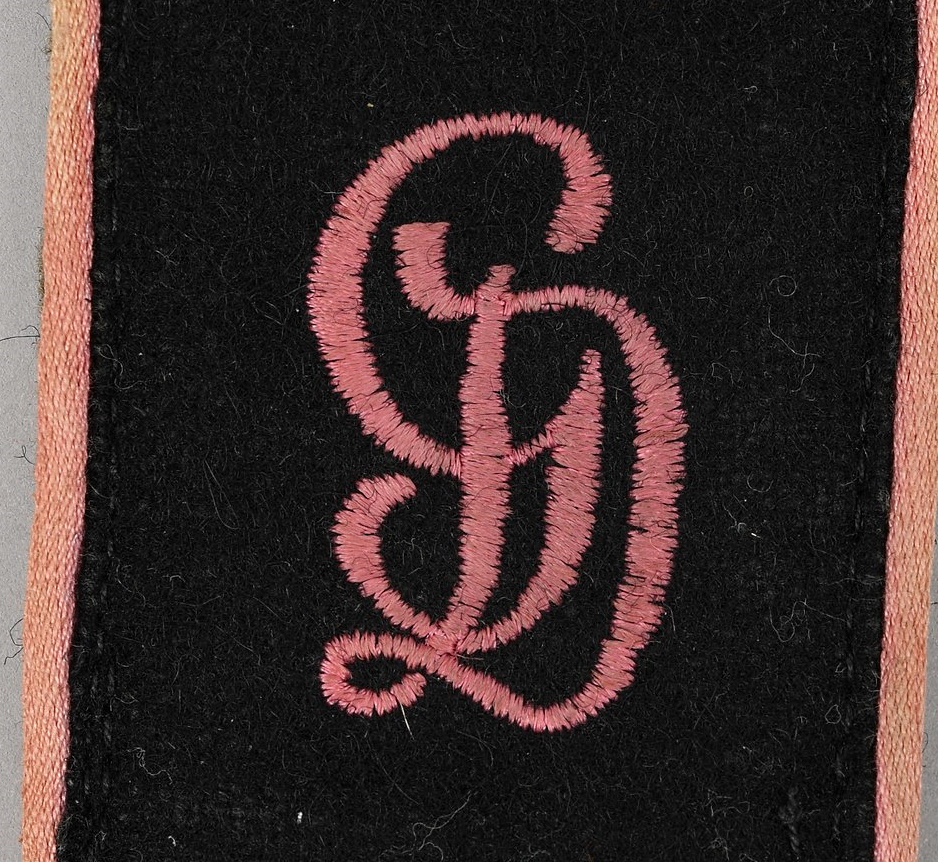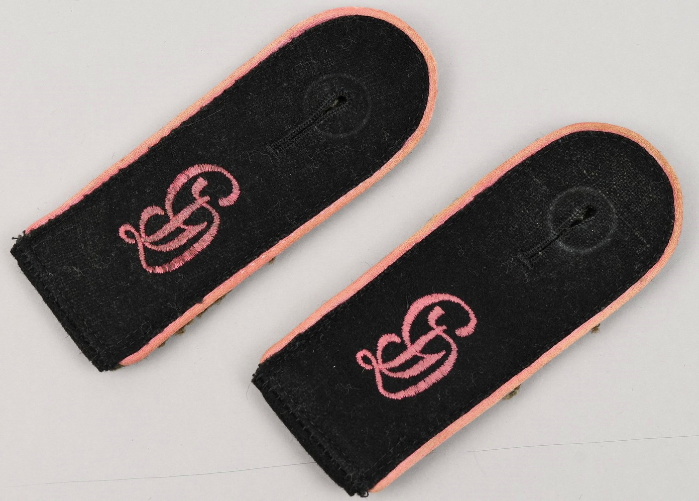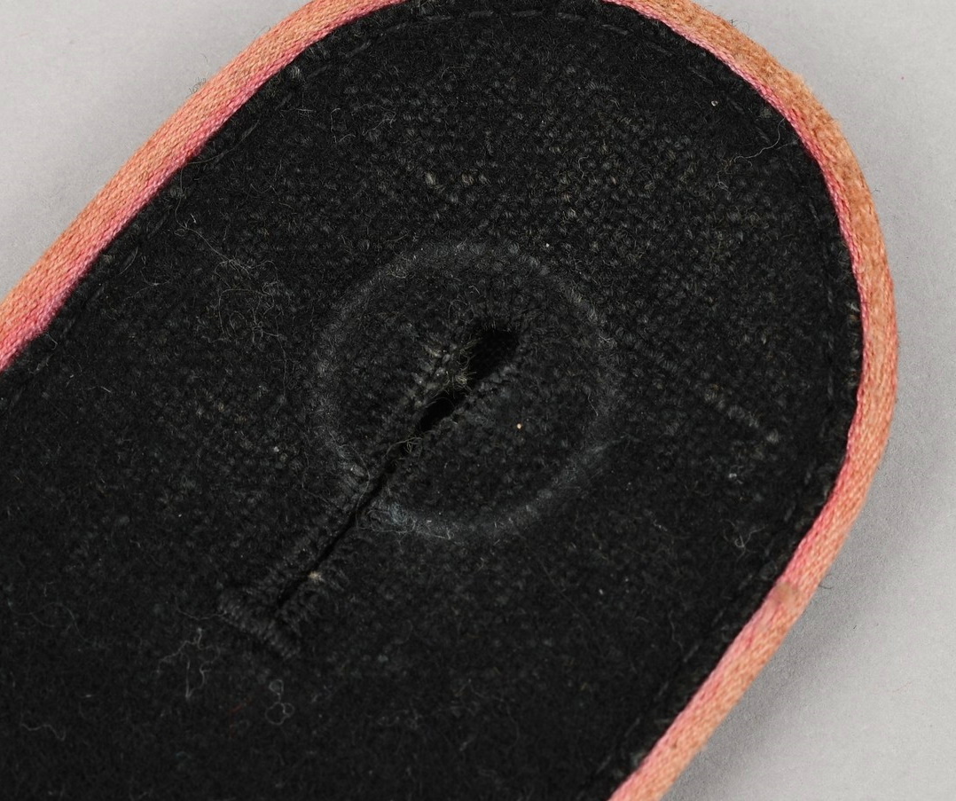 This is a pair of second pattern shoulder straps made of black wool with pink trimmed wool branch color piping to the edges. To the front of each strap is a pink “GD” monogram machine embroidred in place. Retaining tounges intact to the reverse with black drill, cotton reinforcement cloth. The perfect matching pair is in well used condition with clear signs of both age and real use.