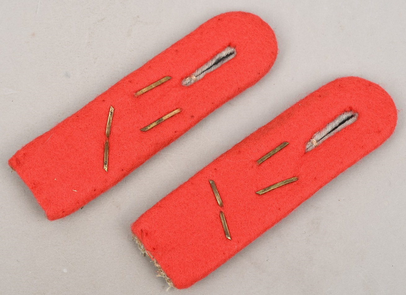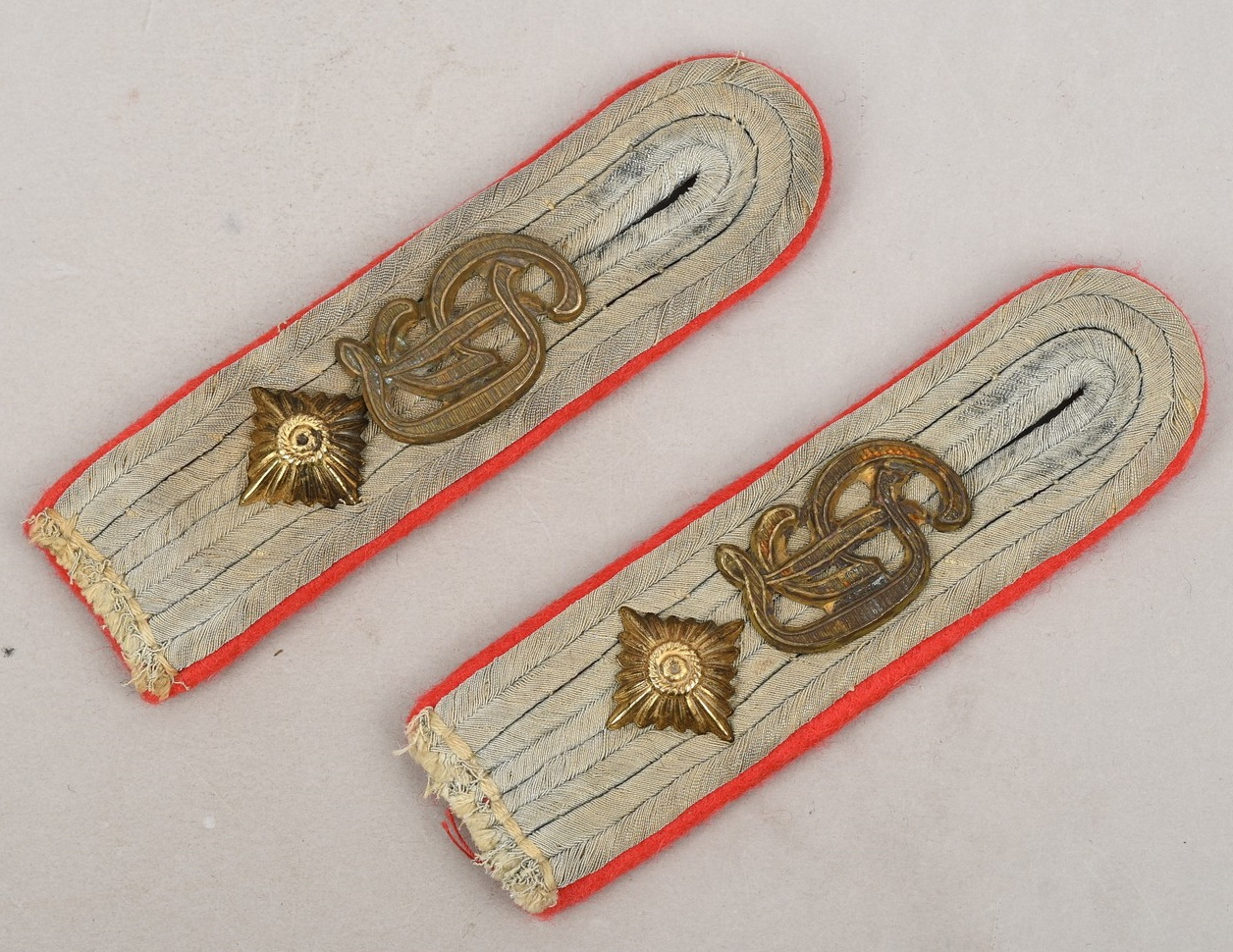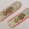 Sew on shoulder boards of silver/aluminum Russian braid with a gilt ferrous metal “GD” monogram cypher and a singel gilt alloy metal rank pip, pinned in place to each board. All mounted on pink wool waffenfarbe bases. The perfect matching pair show clear signs of age and real use.