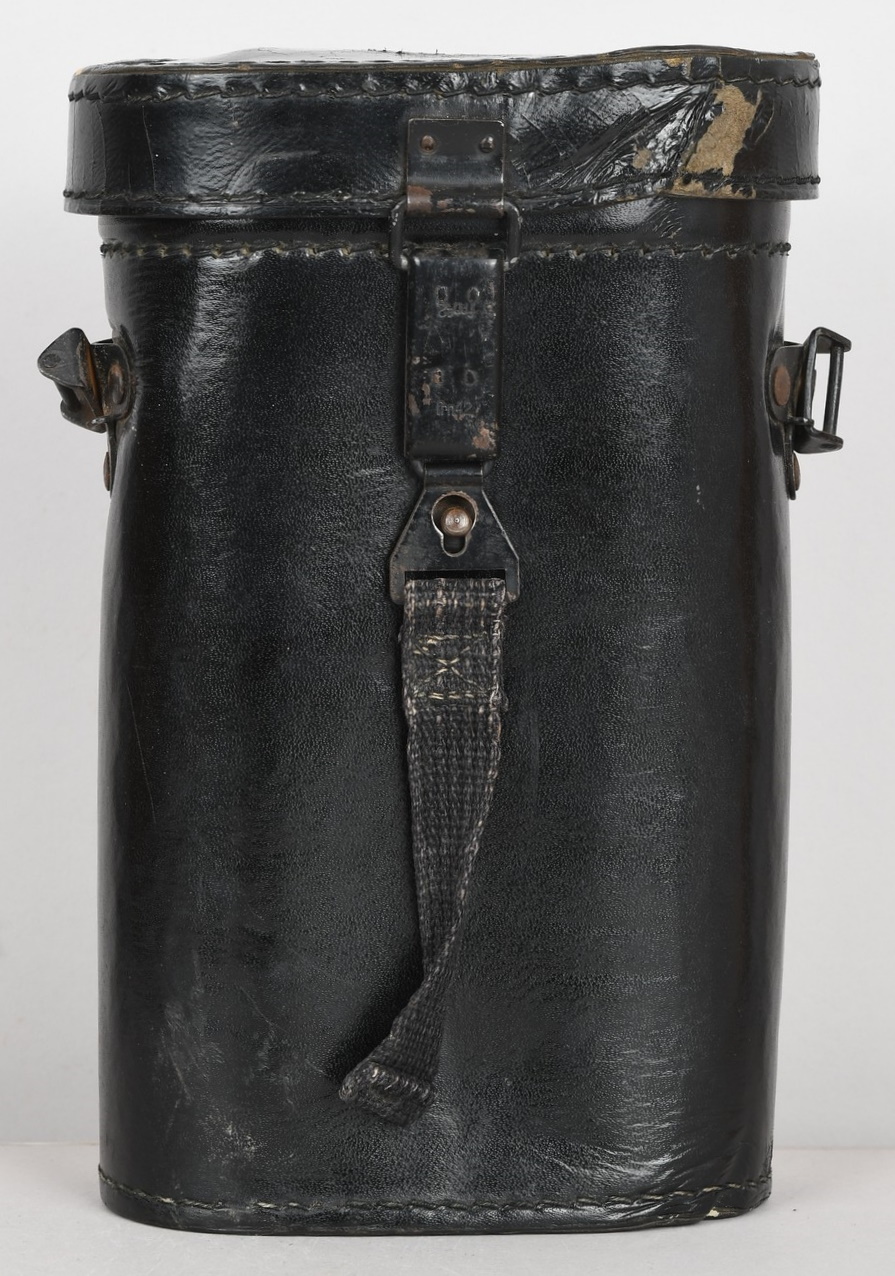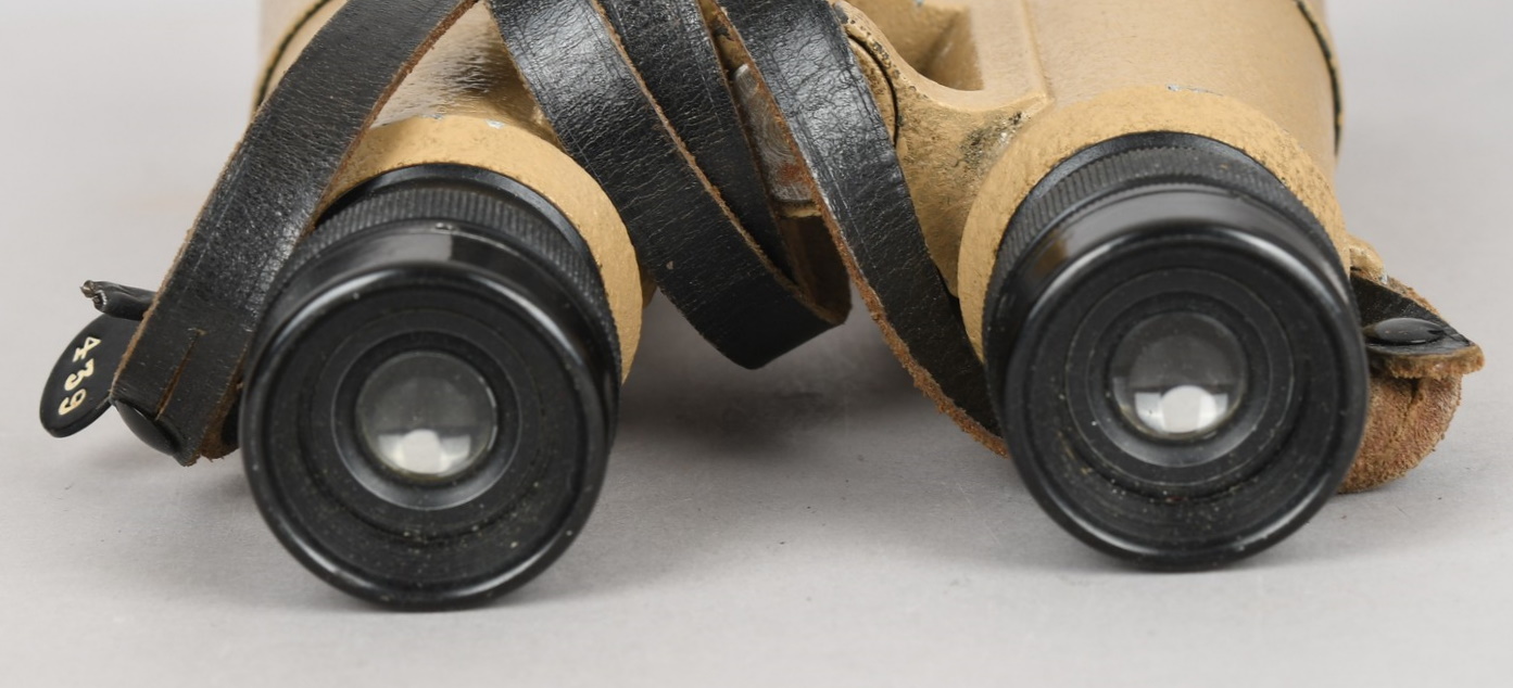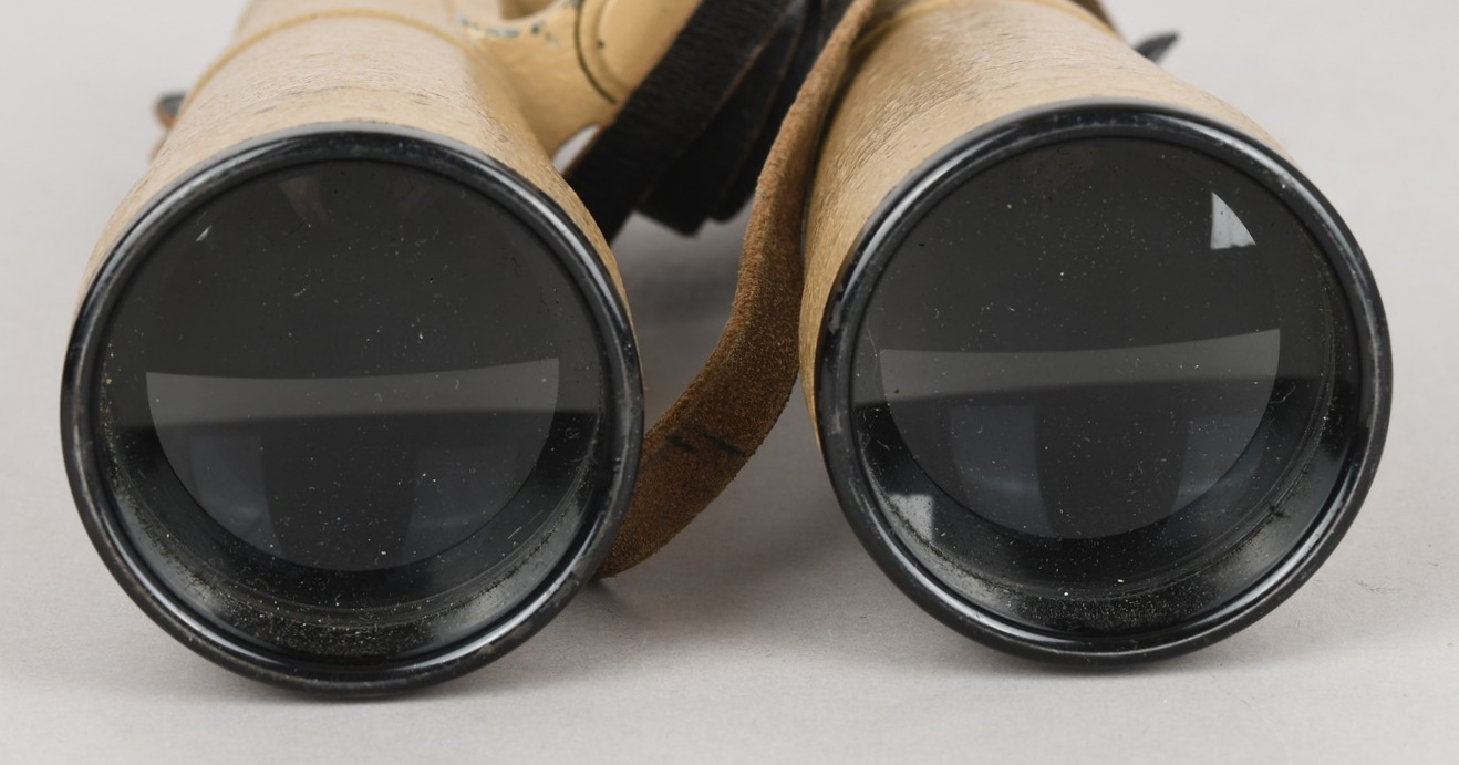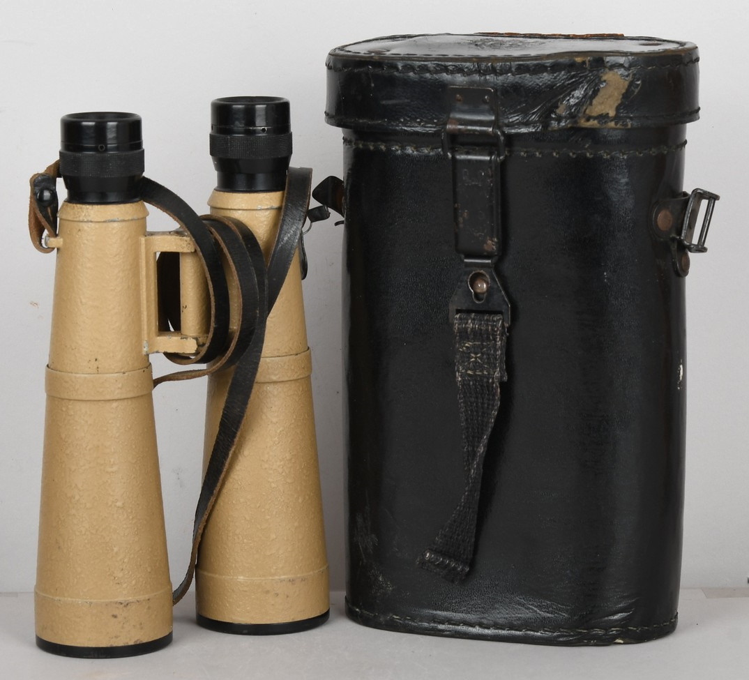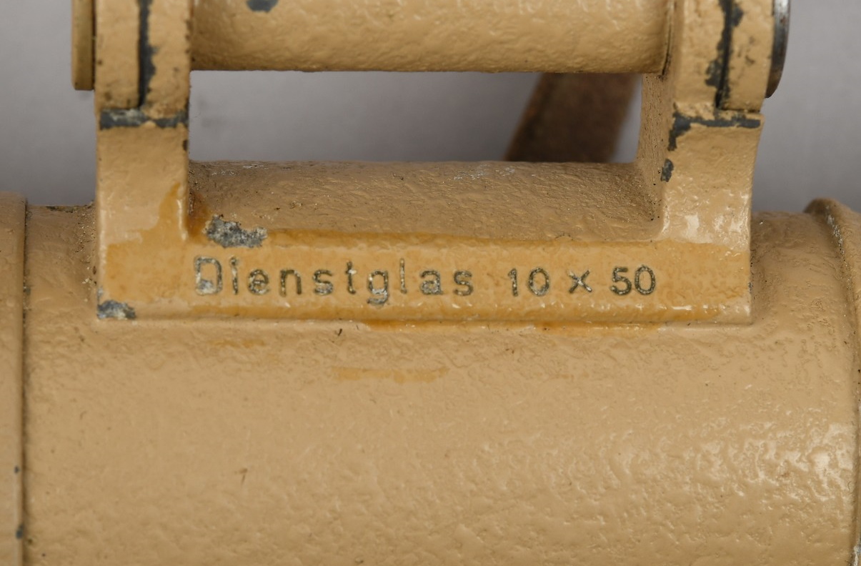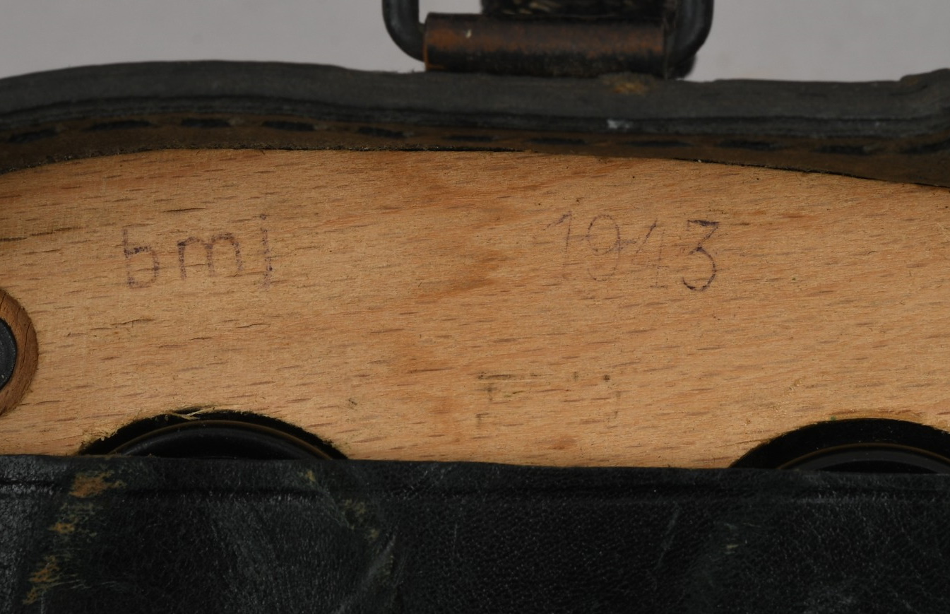 A near mint unissued factory produced pair of 10×50 power field binoculars with neck strap and carrier case. The binoculars are maker marked “bmj power 10×50”. They retain over 98% of their original factory applied, tan finish. The binoculars retaining their original neck strap. Optics are relatively clear. The case is made from ersatz black presstoff material and frontal closure buckle is maker marked “frn 42”, the interior is maker marked and dated “bmj 1943”. The case top lid has had a stamp or marking removed which is now just barely visable. The original factory tag is also intact (very hard to find!!).