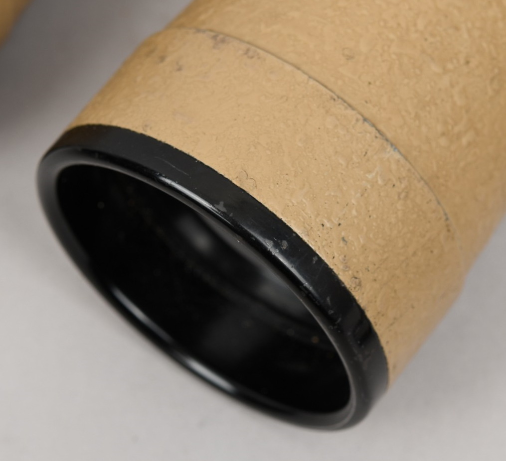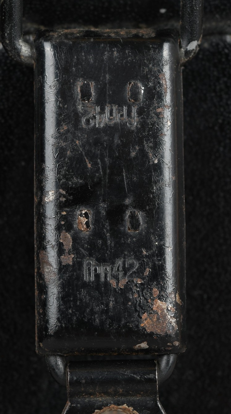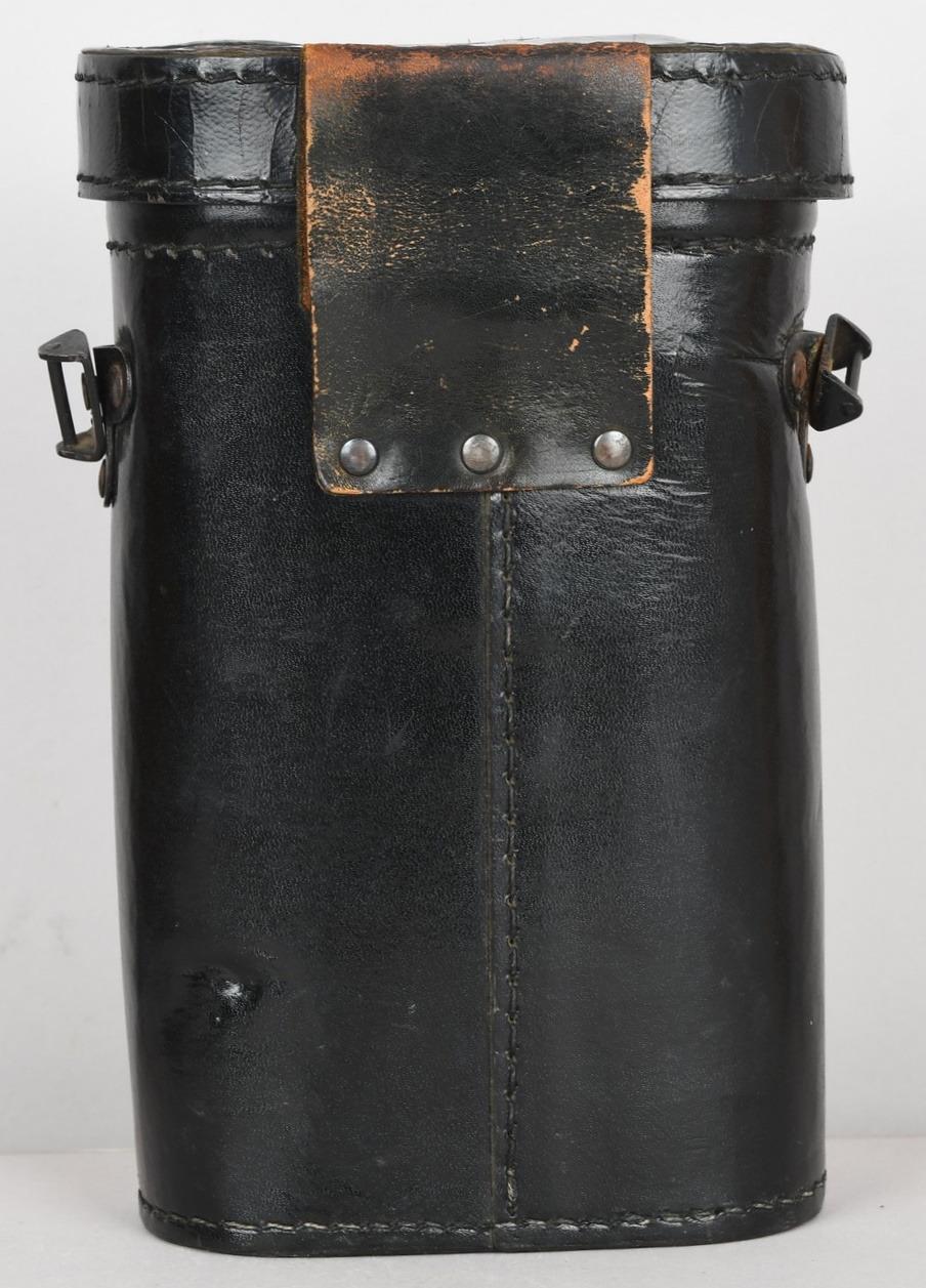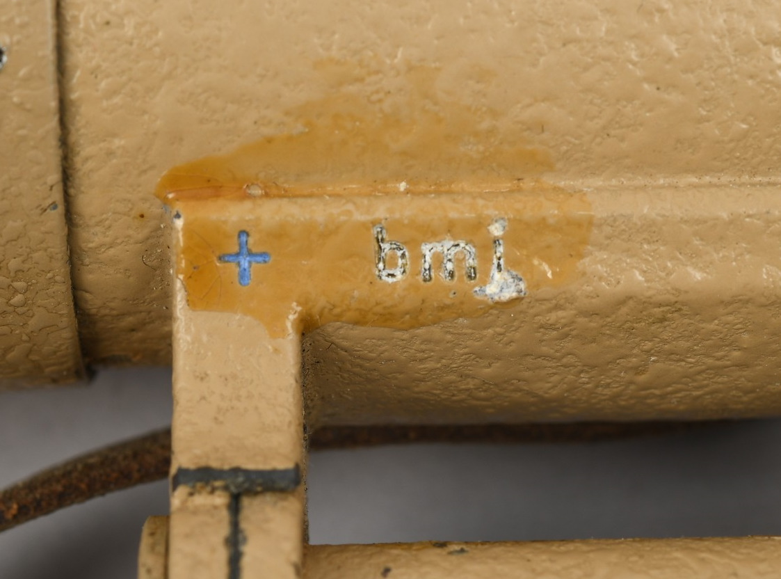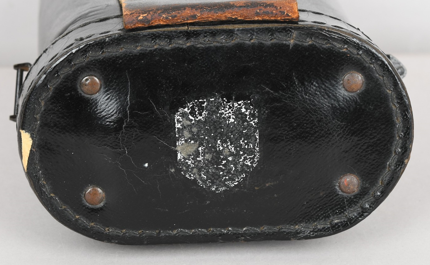 A near mint unissued factory produced pair of 10×50 power field binoculars with neck strap and carrier case. The binoculars are maker marked “bmj power 10×50”. They retain over 98% of their original factory applied, tan finish. The binoculars retaining their original neck strap. Optics are relatively clear. The case is made from ersatz black presstoff material and frontal closure buckle is maker marked “frn 42”, the interior is maker marked and dated “bmj 1943”. The case top lid has had a stamp or marking removed which is now just barely visable. The original factory tag is also intact (very hard to find!!).