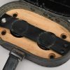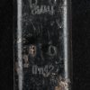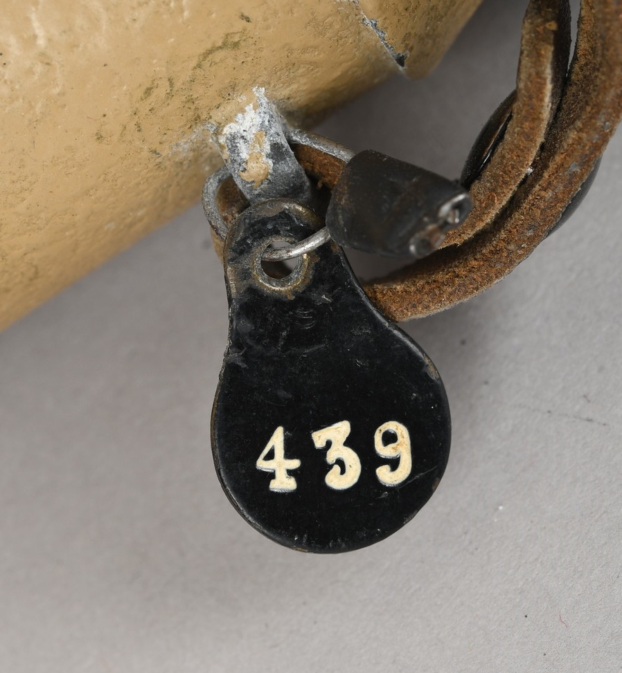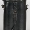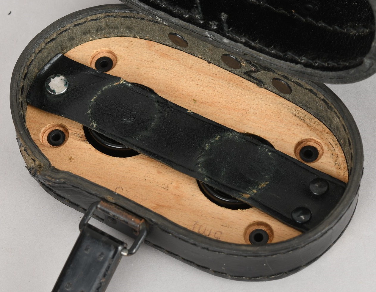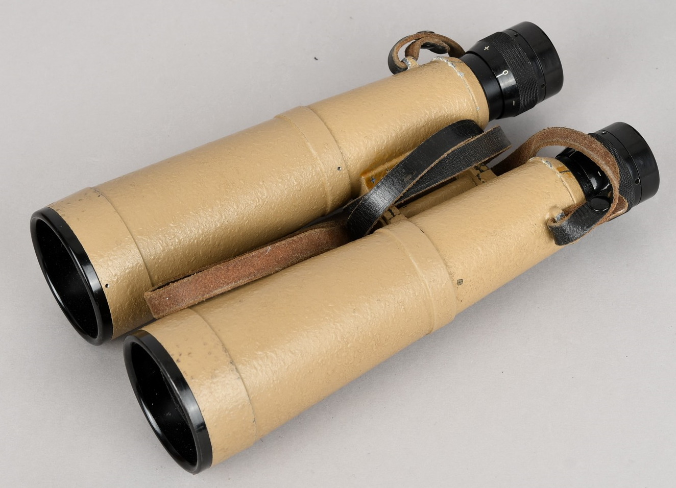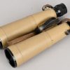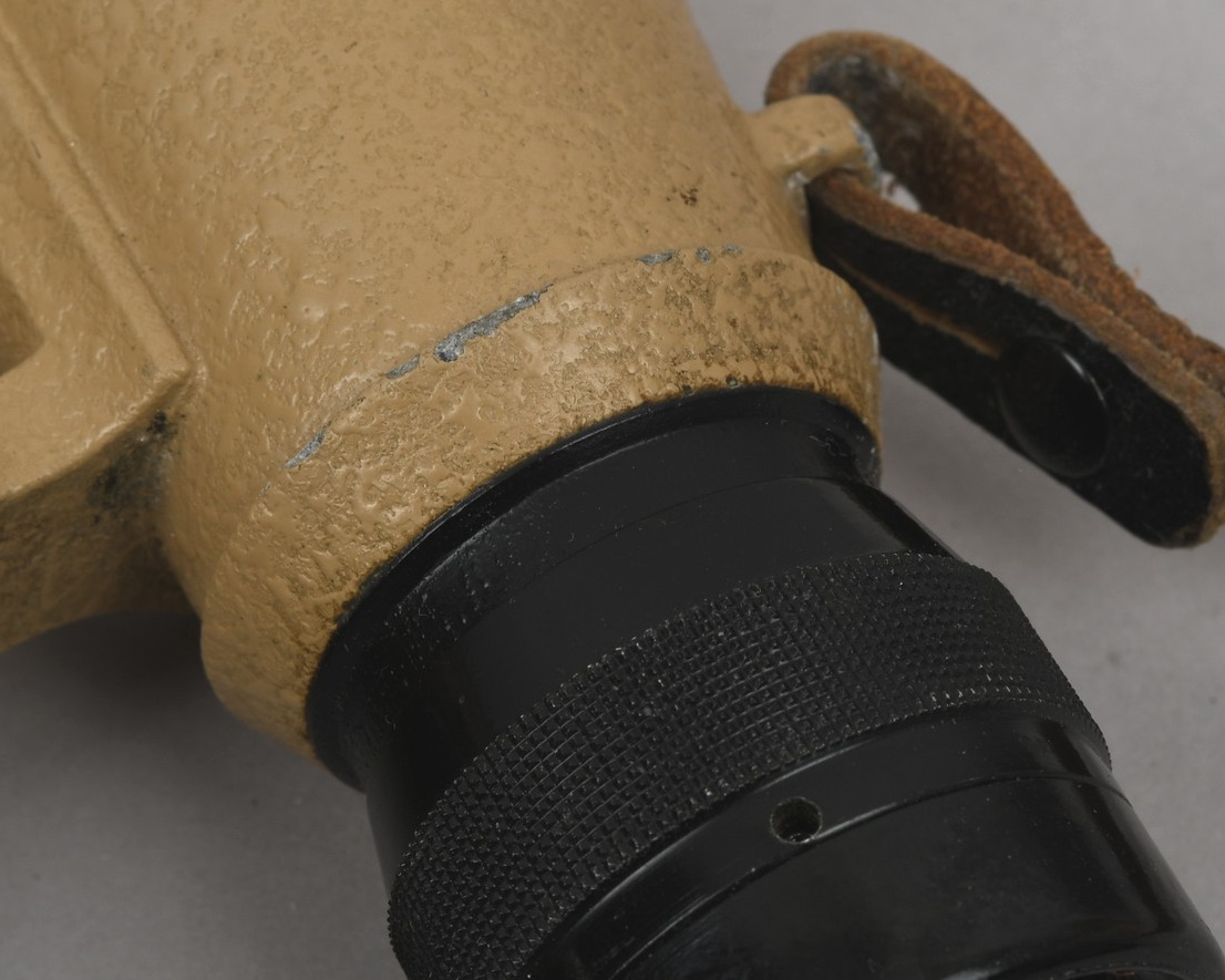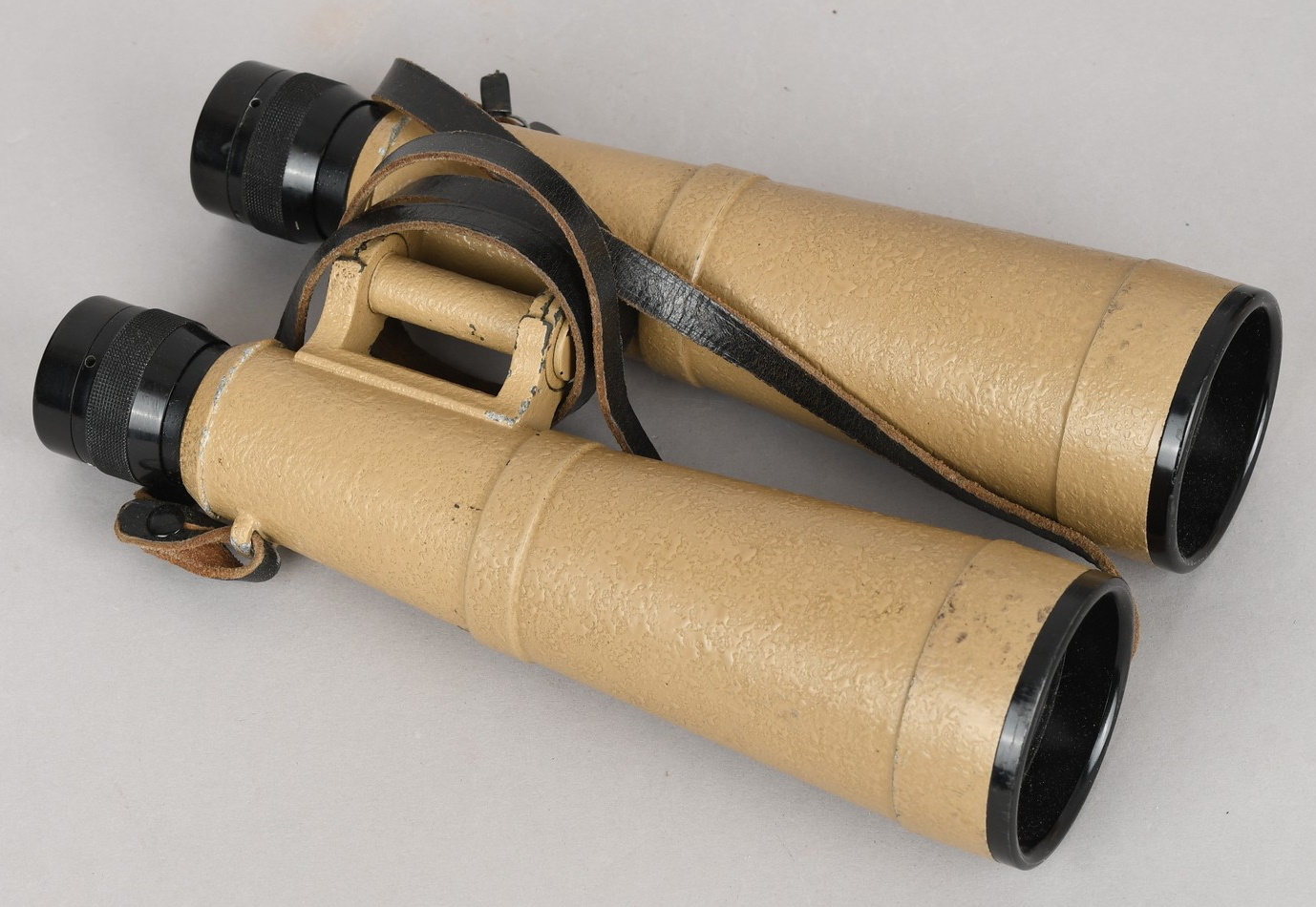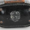 A near mint unissued factory produced pair of 10×50 power field binoculars with neck strap and carrier case. The binoculars are maker marked “bmj power 10×50”. They retain over 98% of their original factory applied, tan finish. The binoculars retaining their original neck strap. Optics are relatively clear. The case is made from ersatz black presstoff material and frontal closure buckle is maker marked “frn 42”, the interior is maker marked and dated “bmj 1943”. The case top lid has had a stamp or marking removed which is now just barely visable. The original factory tag is also intact (very hard to find!!).