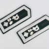 First pattern slip on shoulder straps with pointed tips and no waffenfarben. The blue/green badge cloth construction shoulder straps have bright silver/aluminum NCO’s tress to all edges. One alloy rank pip, “P” cyphers and unit numbers “24” all with bright silver paint wash, pinned in place to each strap. Slip on retaining tounges intact to the reverse. In very good condition with light signs of age and use.