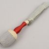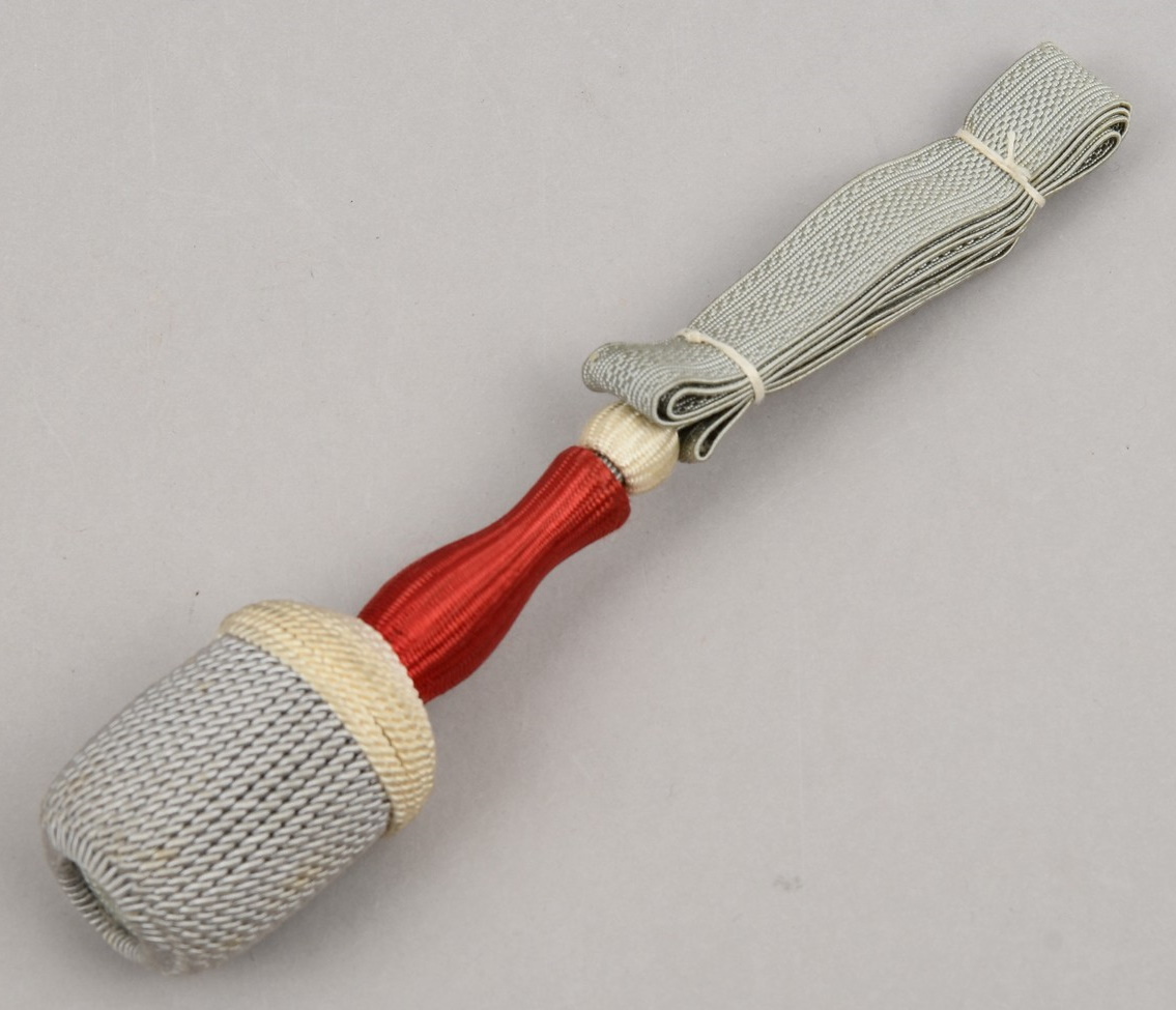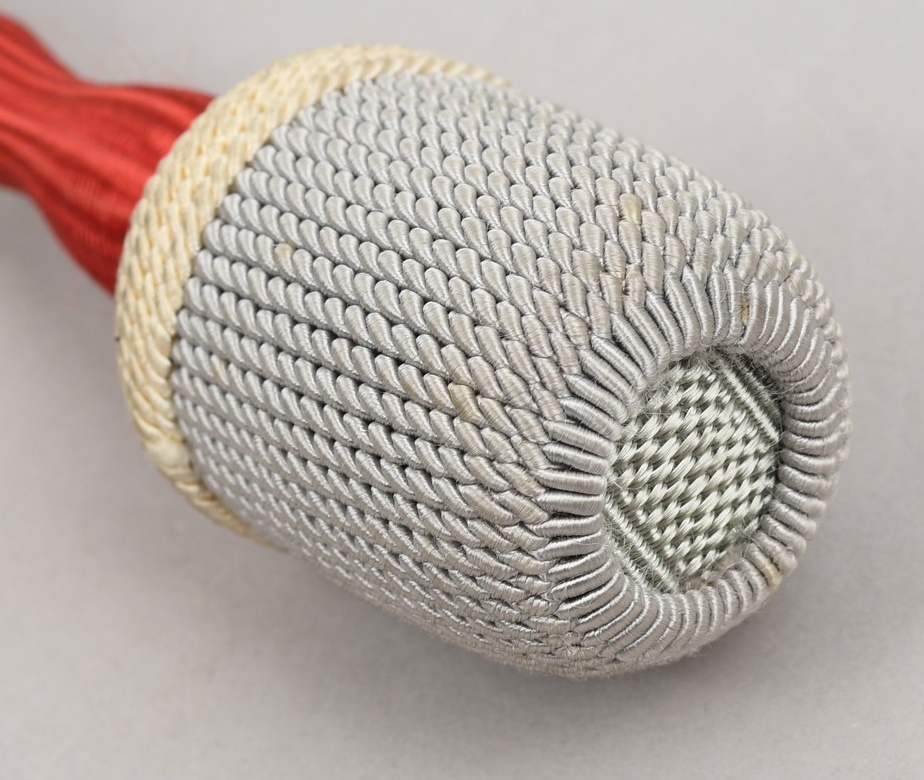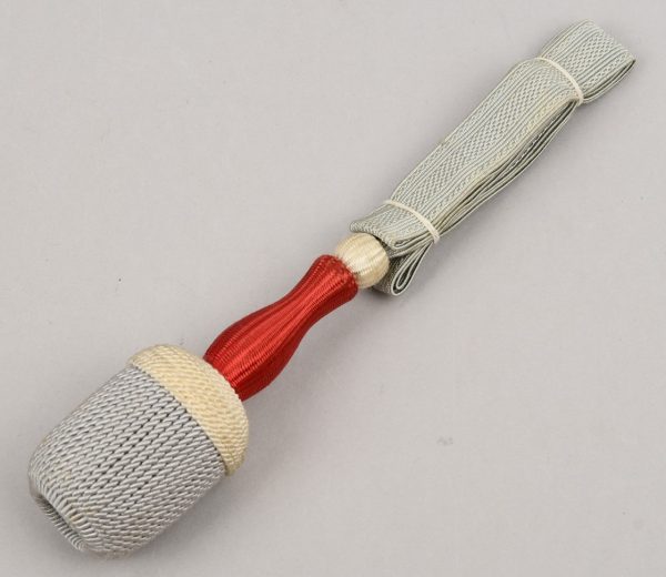This troddel is in very good condition never appearing to have been issued. It features the gray rayon strapping with a red slide stem. Ball cap and upper part of the ball is in white gray yarn like material. The insert matches the strapping.