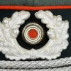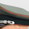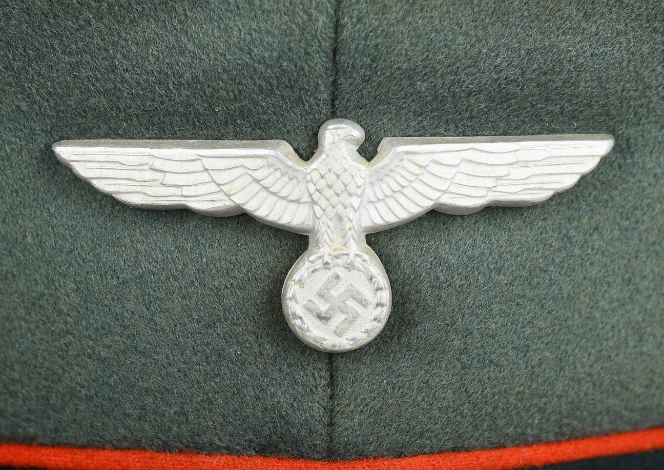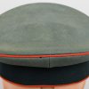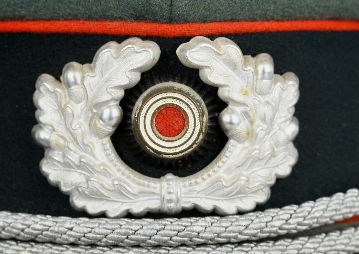 Early or even pre-war produced officer’s visor cap, constructed of field-grey doeskin cloth with trimmed red wool piping. Pinned in place to the front is a nickel silver national eagle and wreath/cockade. Also in front and buttoned in place to the sides is as a officer´s heavy chincord.