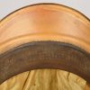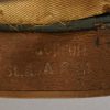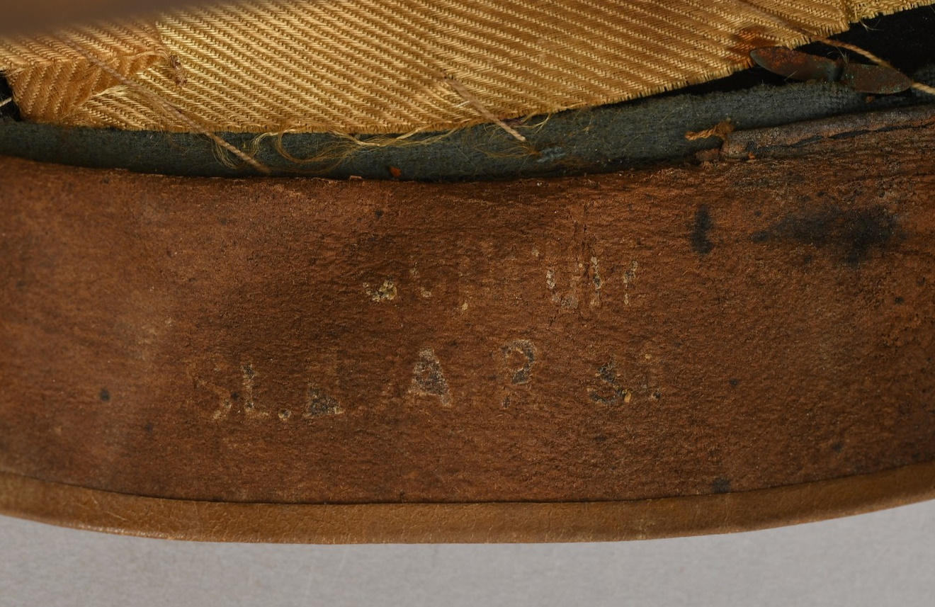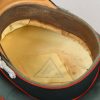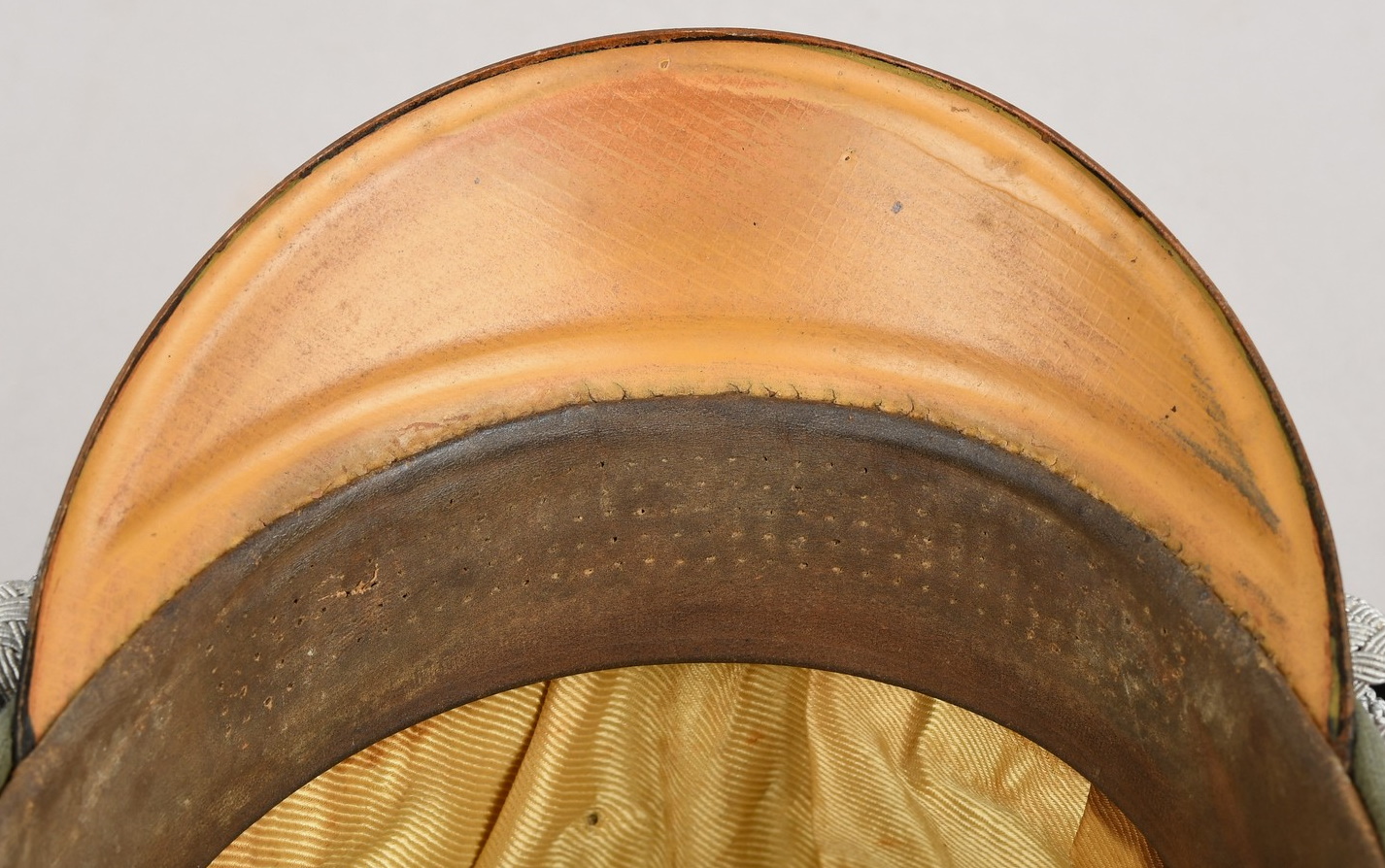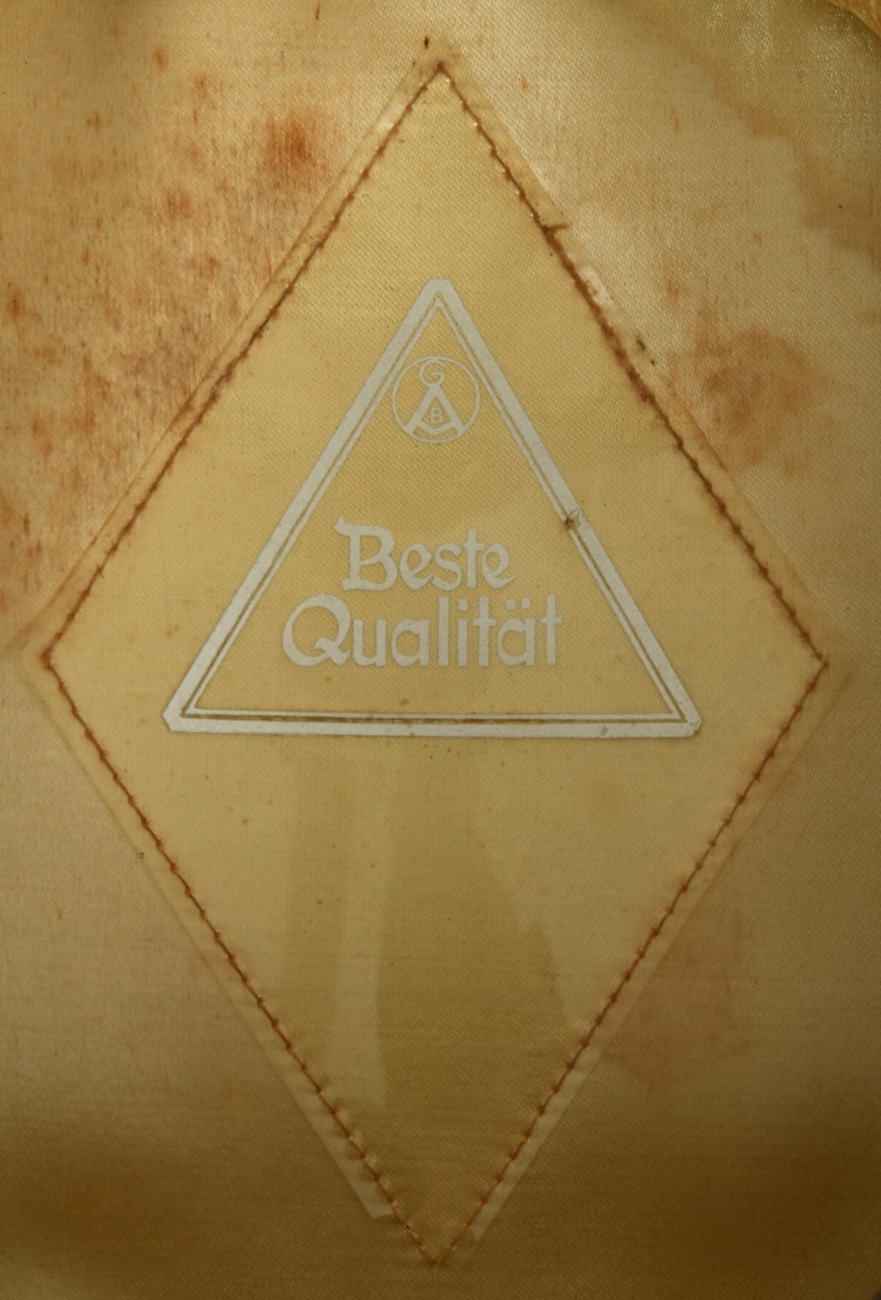 Inside cap is lined with golden yellow rayon. Cap still have it´s original sweat shield still intact. The cap is marked “Beste Qualität” and Gustav Bremer’s logo type. Brown leather sweatband is all intact. When folding the sweatband up, we find a very interesting stamp it reads: “Gepruft (accepted) St.II AR 31”. Clean exterior with a couple of moth bites. Inside shows some stains from use.