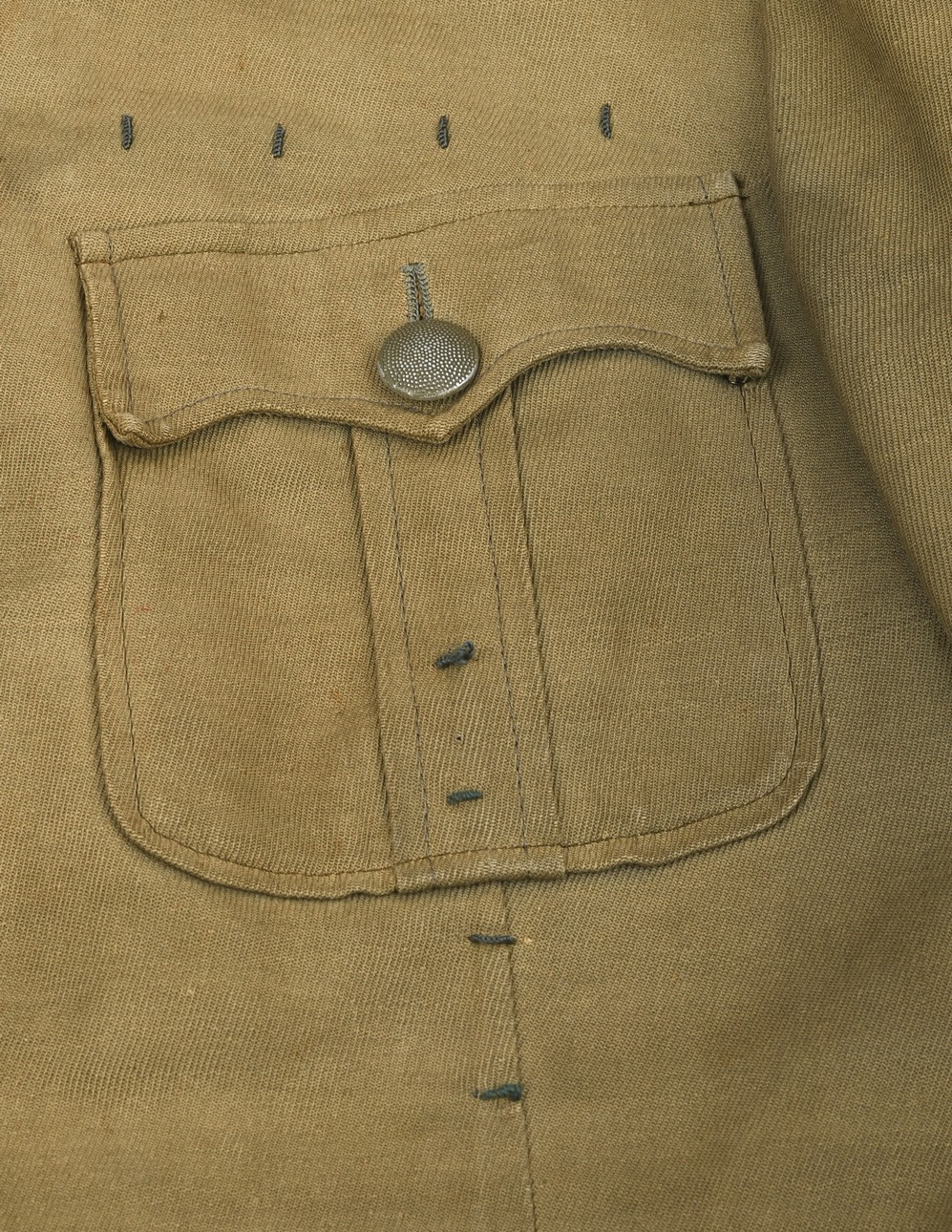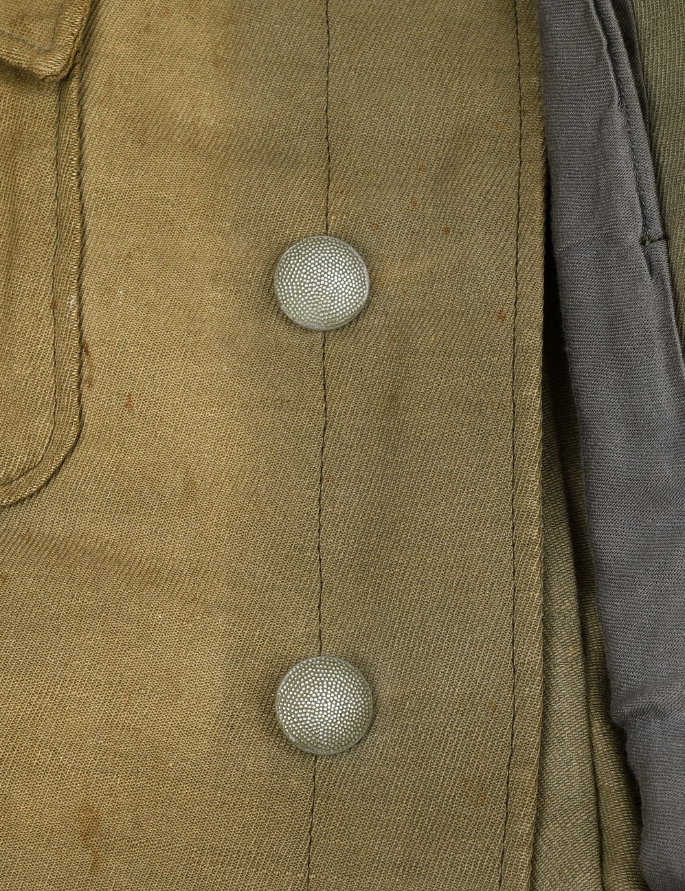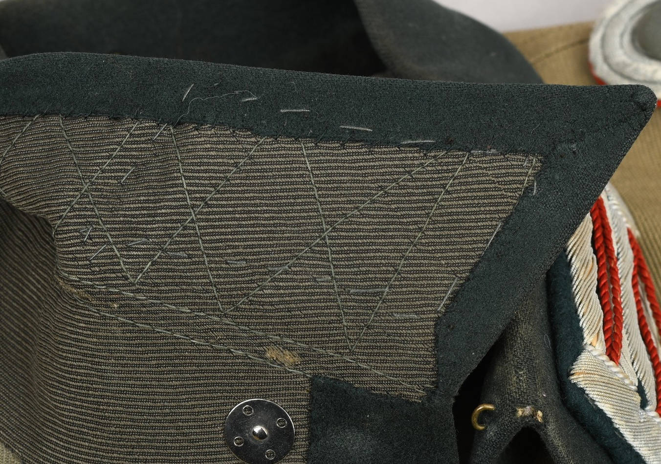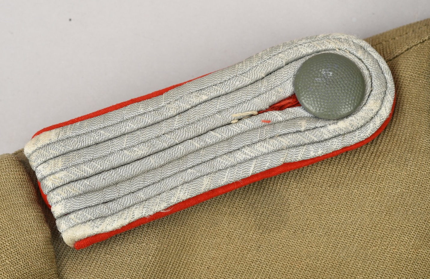 M36 style, light weight, subtly ribbed, tan cotton construction summer/tropical field tunic. The tunic has a five button front closure, a bottle green collar two metal hook’s and eye’s positioned at the forward neckline. The tunic has two, pleated, patch, breast pockets and two, pleated hip pockets. All pockets with scalloped edged, button down flaps. The right breast has a NCO/Officer’s national eagle in bright silver/aluminum threads mounted on a cut-out dark green rayon base. The eagle is machine sewn to the tunic. The tunic has slip on shoulder straps with red wool base with dull grey silver/aluminum russian braid. Hand sewn to the collar is a pair of Artillery officer’s collar tabs. To the right chest is award loops sewn for two awards and above the pocket is loops sewn for a longer ribbon bar. Interior is partly lined in grey cotton. Inside neck with original München taylor label. The label shows heavy fraying.