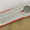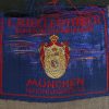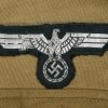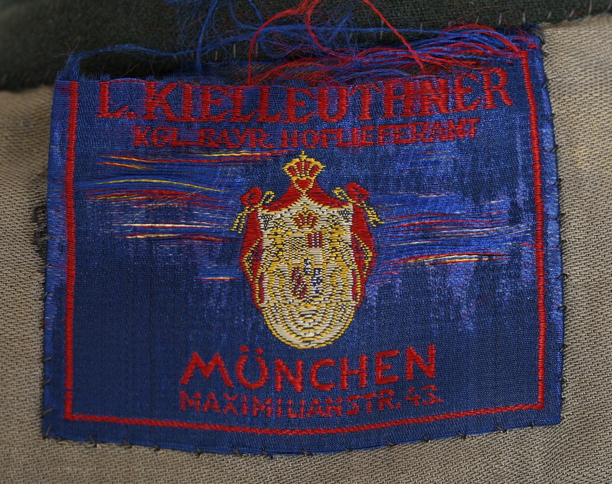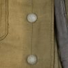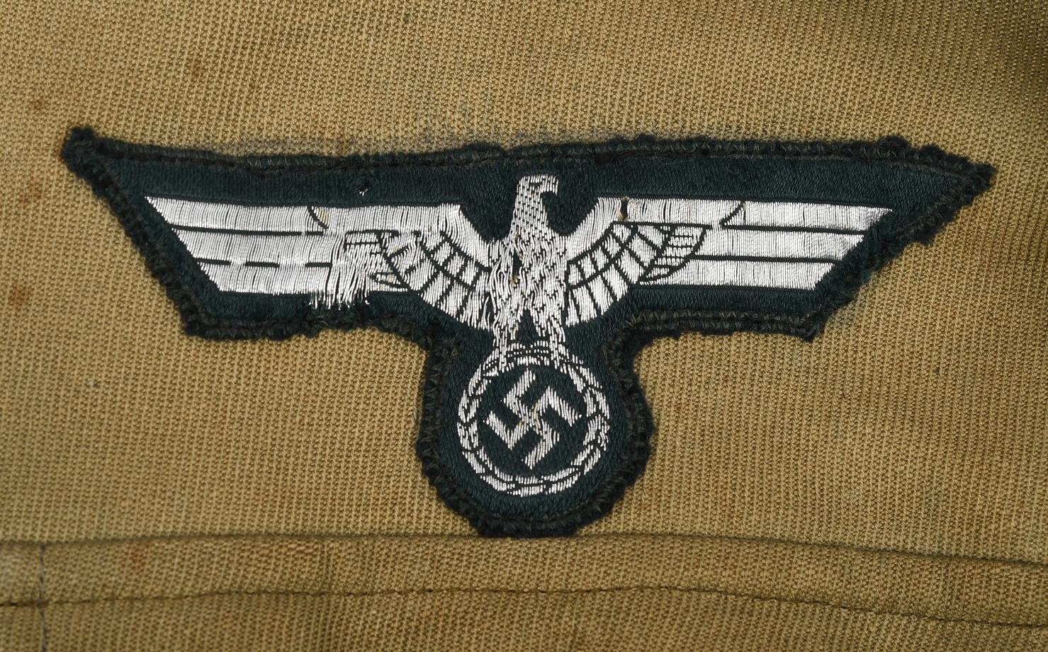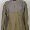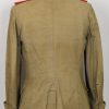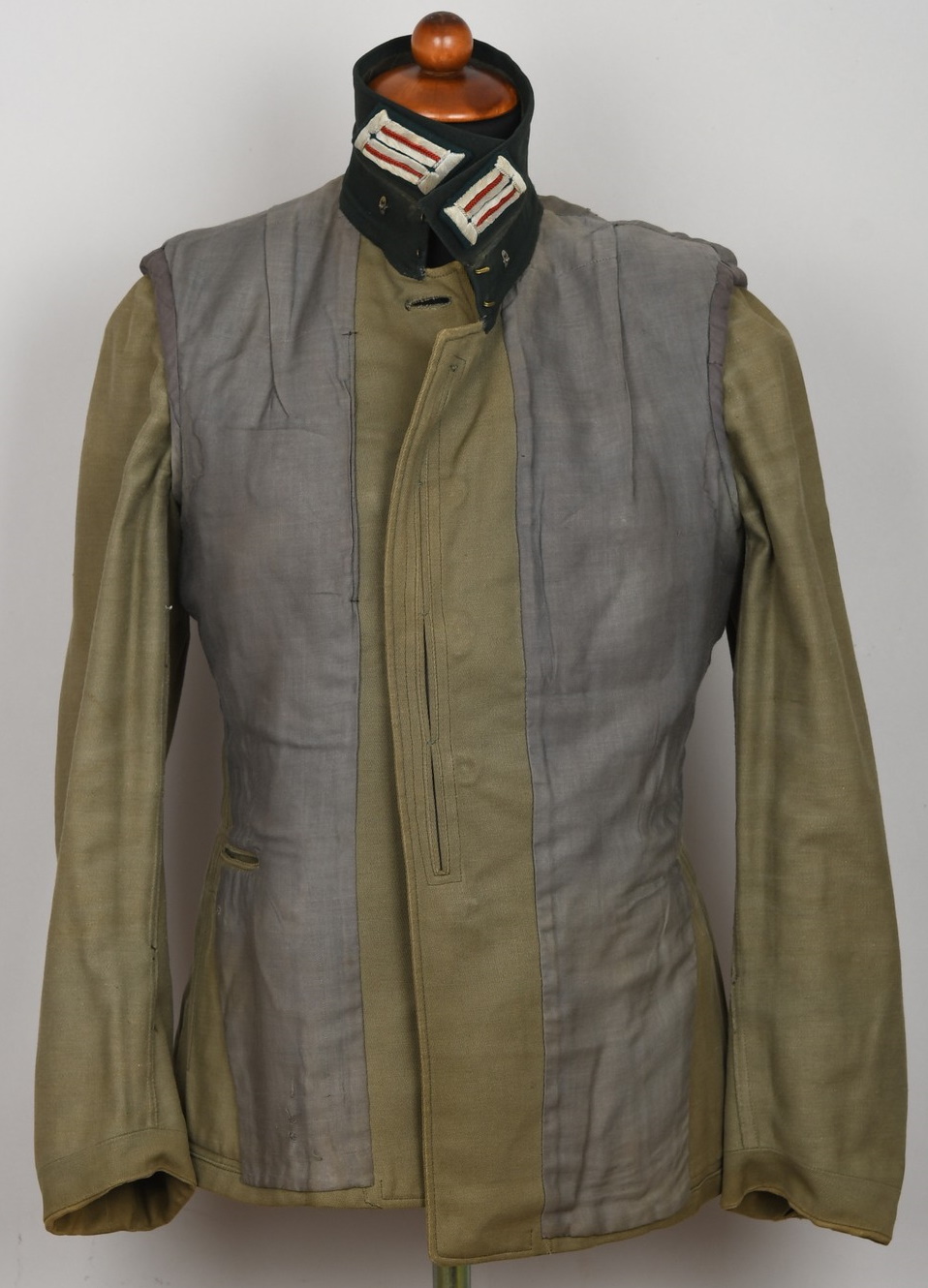 M36 style, light weight, subtly ribbed, tan cotton construction summer/tropical field tunic. The tunic has a five button front closure, a bottle green collar two metal hook’s and eye’s positioned at the forward neckline. The tunic has two, pleated, patch, breast pockets and two, pleated hip pockets. All pockets with scalloped edged, button down flaps. The right breast has a NCO/Officer’s national eagle in bright silver/aluminum threads mounted on a cut-out dark green rayon base. The eagle is machine sewn to the tunic. The tunic has slip on shoulder straps with red wool base with dull grey silver/aluminum russian braid. Hand sewn to the collar is a pair of Artillery officer’s collar tabs. To the right chest is award loops sewn for two awards and above the pocket is loops sewn for a longer ribbon bar. Interior is partly lined in grey cotton. Inside neck with original München taylor label. The label shows heavy fraying.