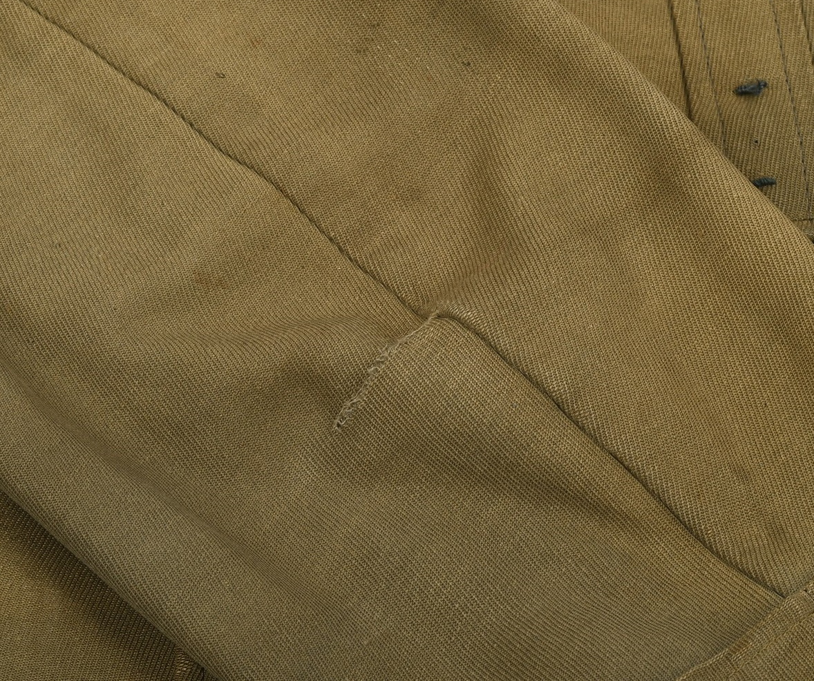 The tunic shows signs of real use and is heavily sun faded. We added one extra photo to clearly show the fading. There is one tear located to the right elbow area. The tear is approx 5cm in length.