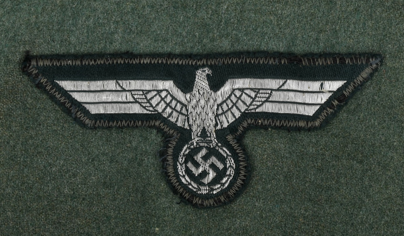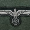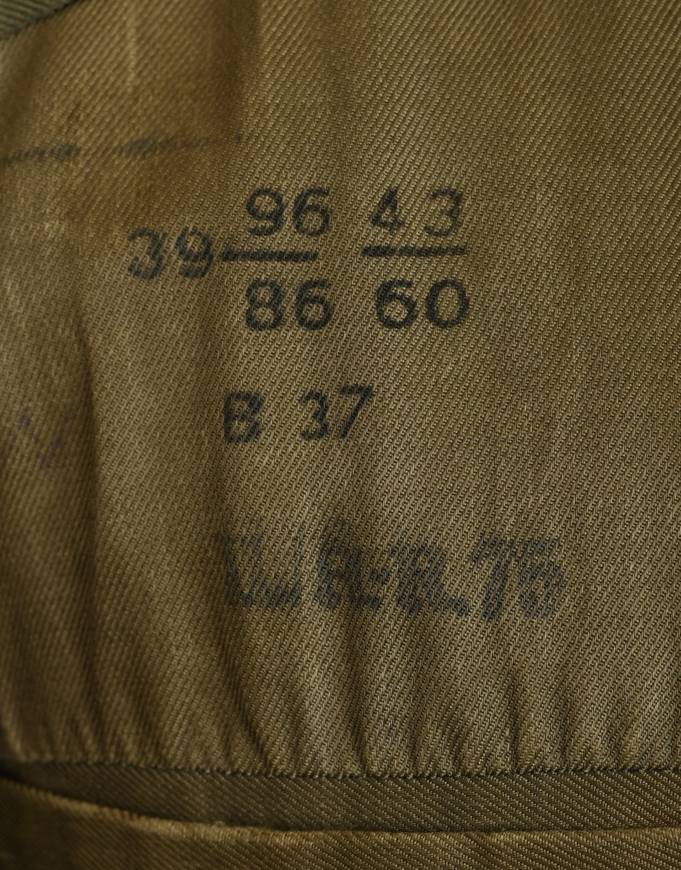High quality, field-grey cloth dress tunic. M35 dress tunic features eight button front closure with dual metal hooks and eyes positioned at the forward neckline and a lay down, dark green badge cloth collar. Dress type NCO collar tabs. Shoulder boards, early second type constructed of dark green wool with bright NCO tresse  and two metal alloy pips. Shouler board buttons, bright pebbled type with unit number “II”. To the right chest is a NCO/officer’s flat wire breast eagle on dark green backing. The eagle is neatly hand sewn in place. To the left side is award loops sewn for one badge and a 1-2 place ribbon bar. Inside is fully lined with silver/beige rayon cloth and pyjama striped sleeves. Lining is stamped with size and year, 37 for 1937. The lining is also marked with a unit stamp, it reads: “II AR. 75”. Really nice to see, tunics like these are very seldom unit marked. The tunic shows clear signs of age and use. There is a couple of pin-head sized holes and lining shows spots of fraying. No larger holes, stains or mendings though.