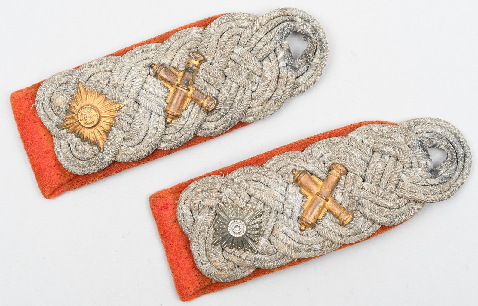 Sew on shoulder boards of interwoven matte silver/aluminum Russian braid mounted on a Orange/red wool waffenfarbe base. To each board is a fire gilded Crossed cannon insignia cypher for “Waffen Offizier” (Ordnance Officer) and one rank pip pinned in Place.