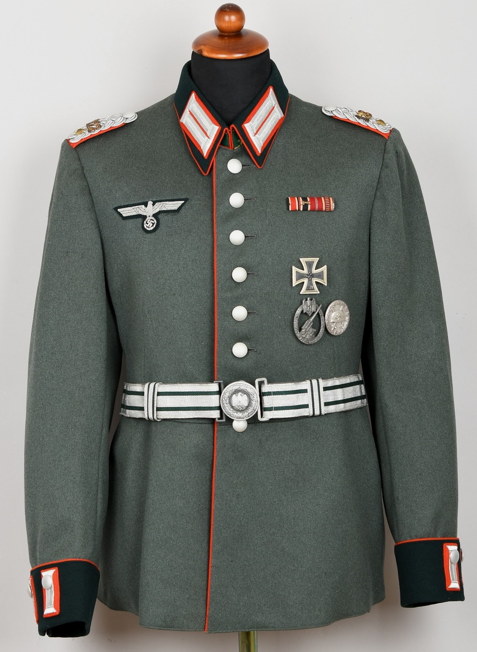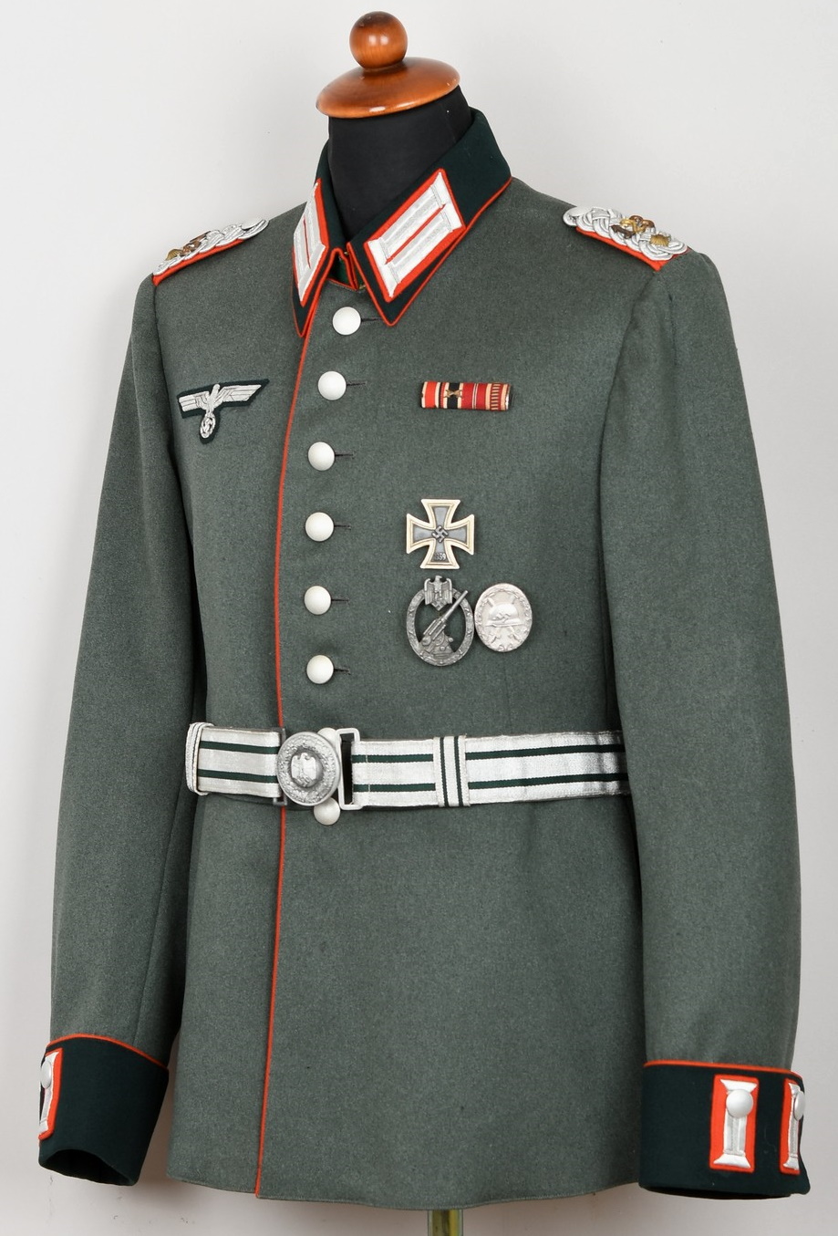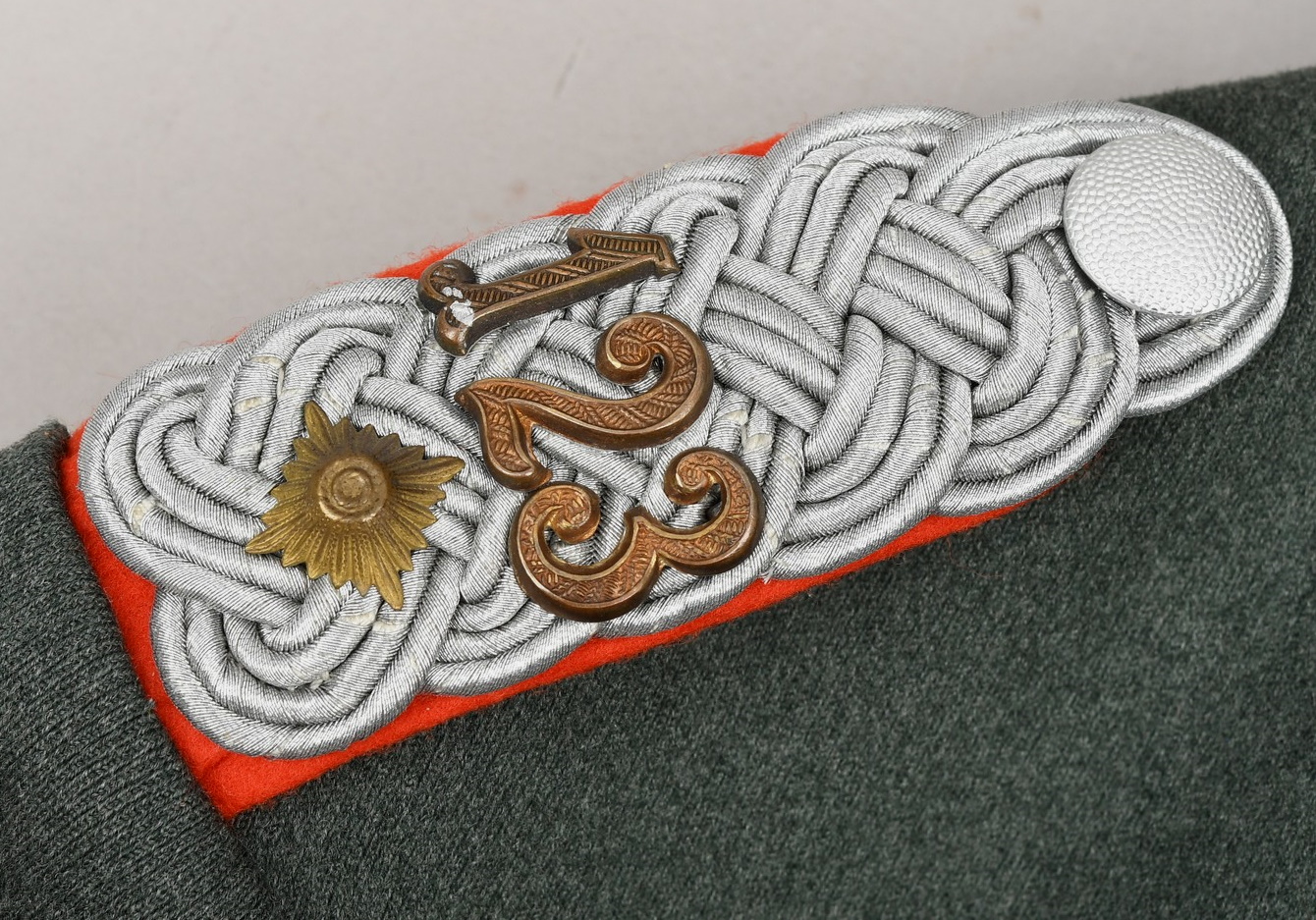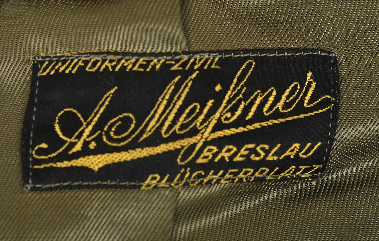 High quality, tailor made field-grey cloth dress tunic. M35 dress tunic features eight button front closure with dual metal hooks and eyes positioned at the forward neckline and a lay down, dark green badge cloth collar. Dress/parade type artillery officer’s collar tabs. Shoulder boards, red cloth underlay with bright interwoven, silver/aluminum Russian braid. Pinned in place to each is unit number cyphers “123” and a gilt alloy metal rank pip. Shouler board buttons, bright pebbled type. To the right chest is a hand embroidered officer’s bullion breast eagle on dark green backing. The eagle is neatly hand sewn in place. To the left side is award loops sewn for three badges and a long ribbon bar. Inside is fully lined with green rayon. To the inside neck is a tailors label machine sewn in place. Sleeves are lined with white fine cotton. The tunic is in very good condition, no holes, rips or mendings. Only minor signs of age and real use.