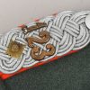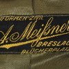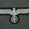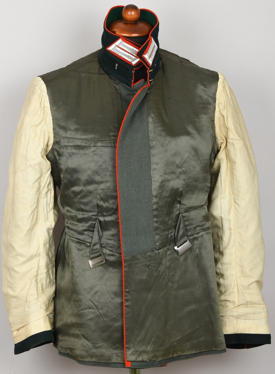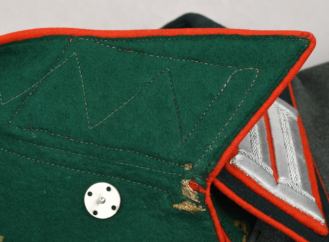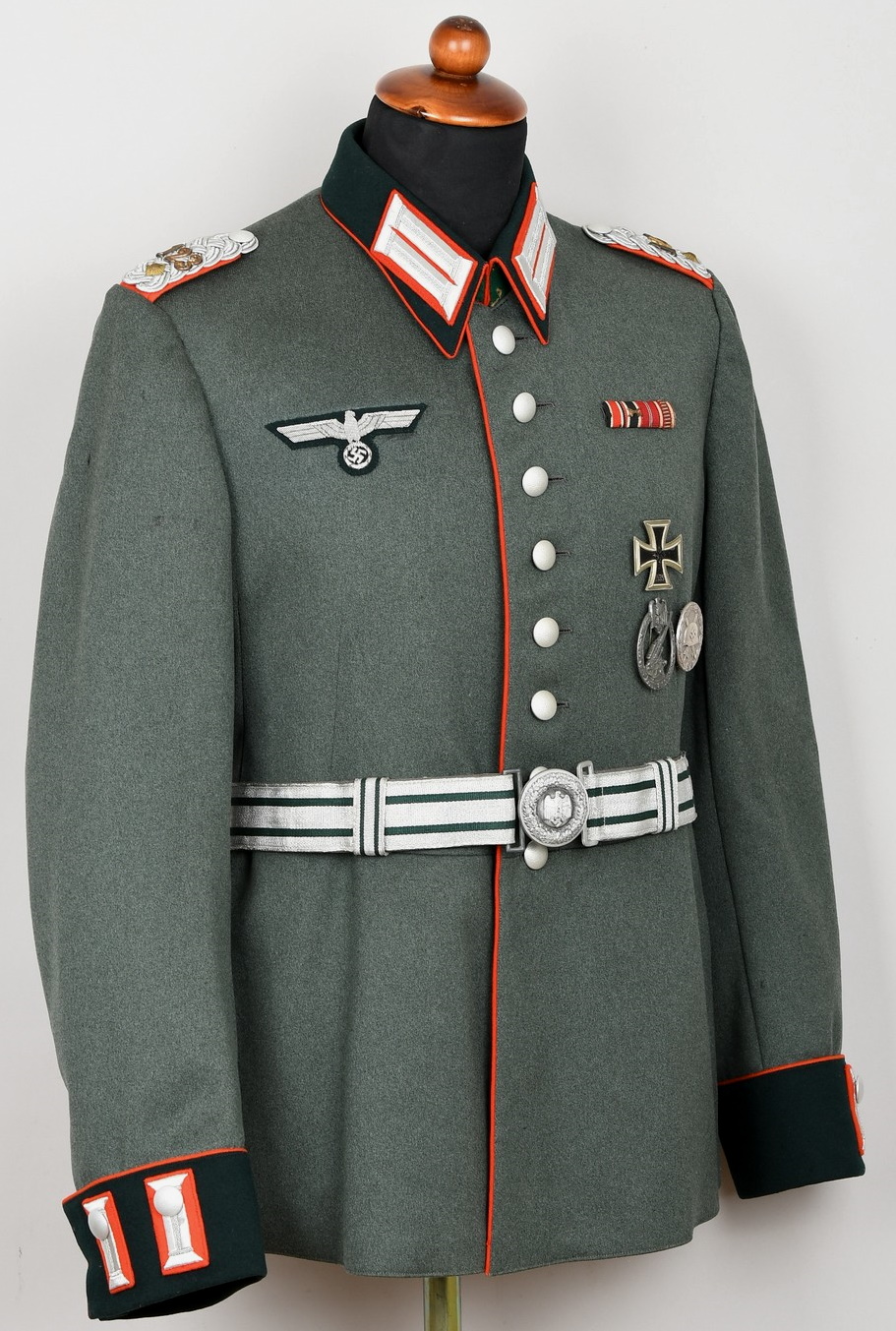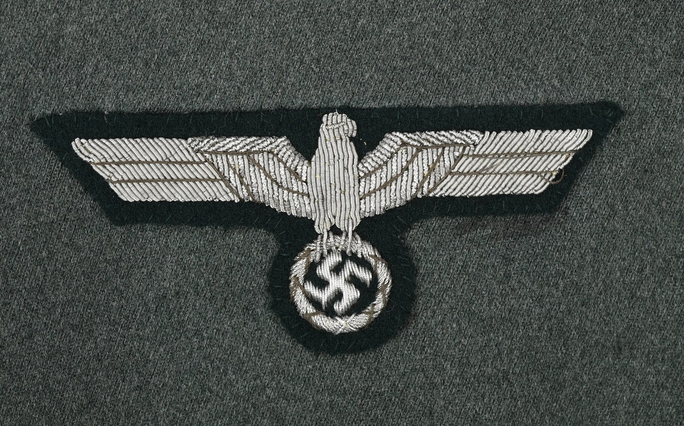 High quality, tailor made field-grey cloth dress tunic. M35 dress tunic features eight button front closure with dual metal hooks and eyes positioned at the forward neckline and a lay down, dark green badge cloth collar. Dress/parade type artillery officer’s collar tabs. Shoulder boards, red cloth underlay with bright interwoven, silver/aluminum Russian braid. Pinned in place to each is unit number cyphers “123” and a gilt alloy metal rank pip. Shouler board buttons, bright pebbled type. To the right chest is a hand embroidered officer’s bullion breast eagle on dark green backing. The eagle is neatly hand sewn in place. To the left side is award loops sewn for three badges and a long ribbon bar. Inside is fully lined with green rayon. To the inside neck is a tailors label machine sewn in place. Sleeves are lined with white fine cotton. The tunic is in very good condition, no holes, rips or mendings. Only minor signs of age and real use.