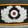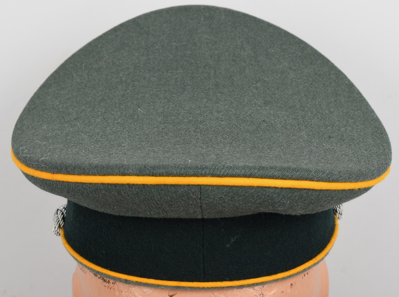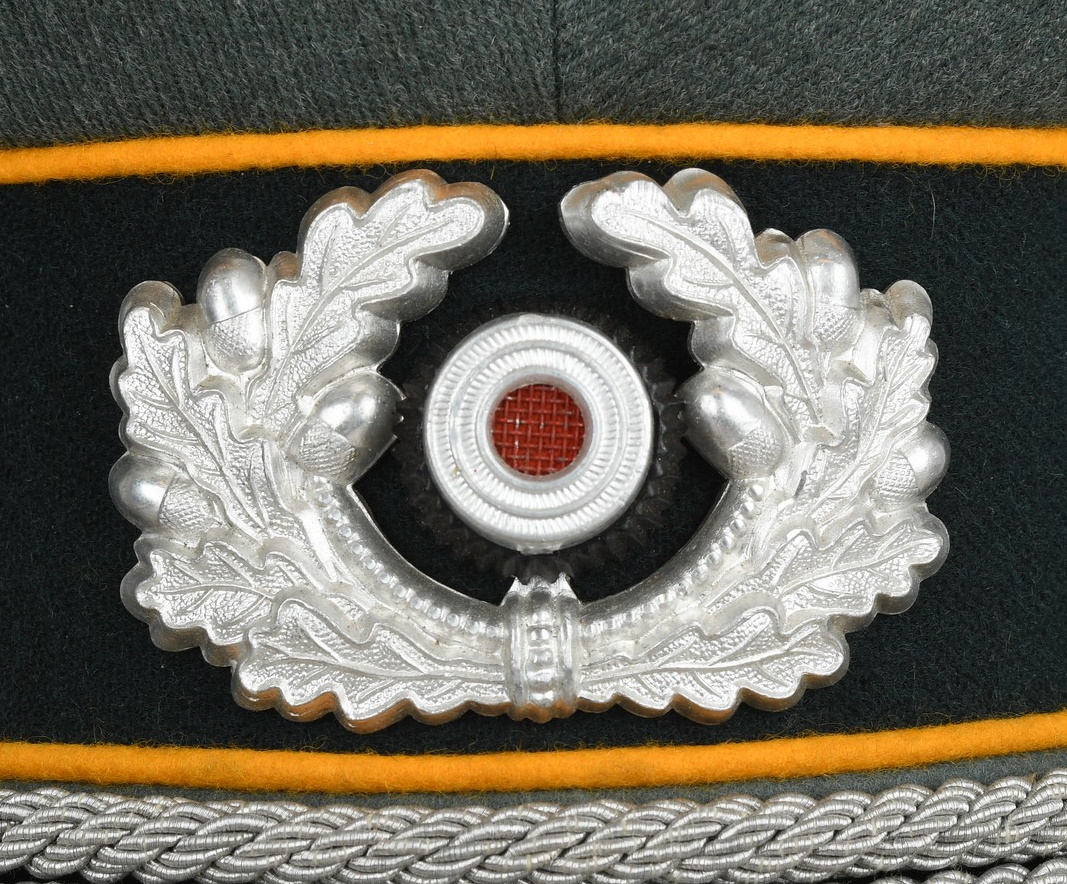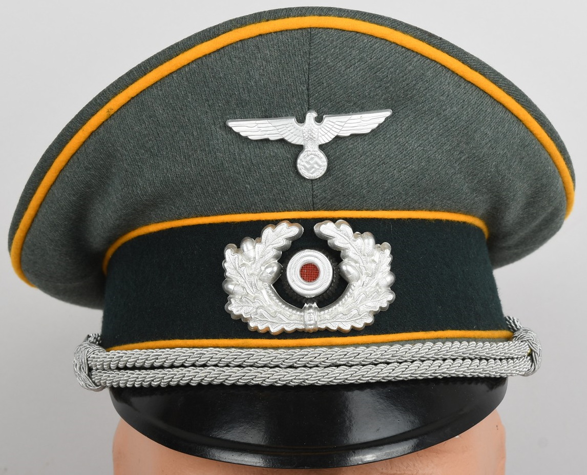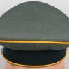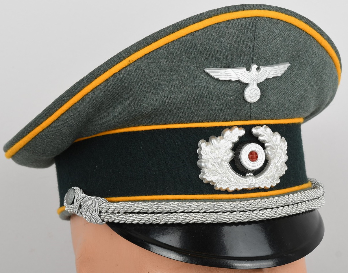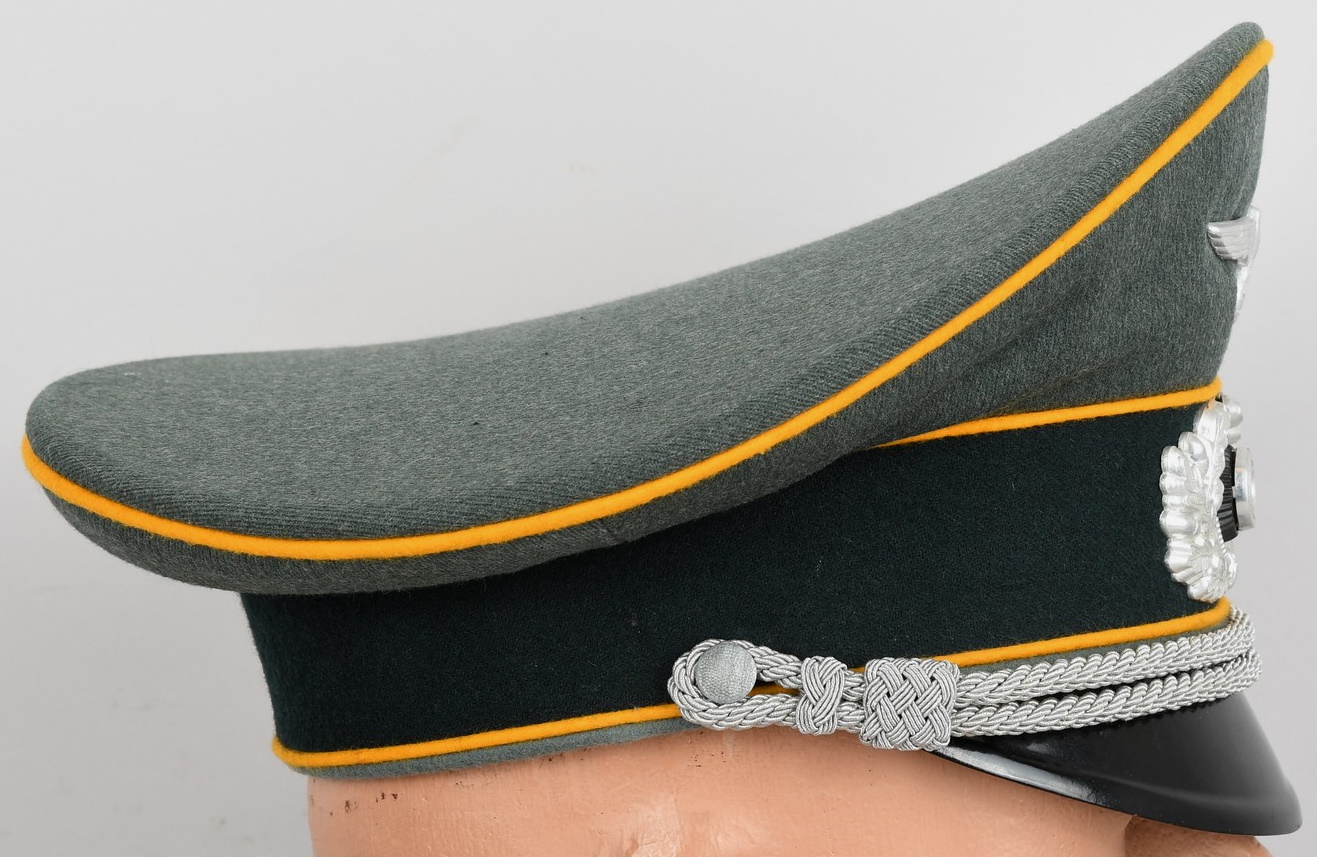 Mid war produced officer’s visor cap, constructed of field-grey tricot cloth with golden yellow wool piping. Pinned in place to the front is a silver washed alloy metal national eagle and wreath/cockade. Also in front and buttoned in place to the sides is as a officer´s heavy chincord.