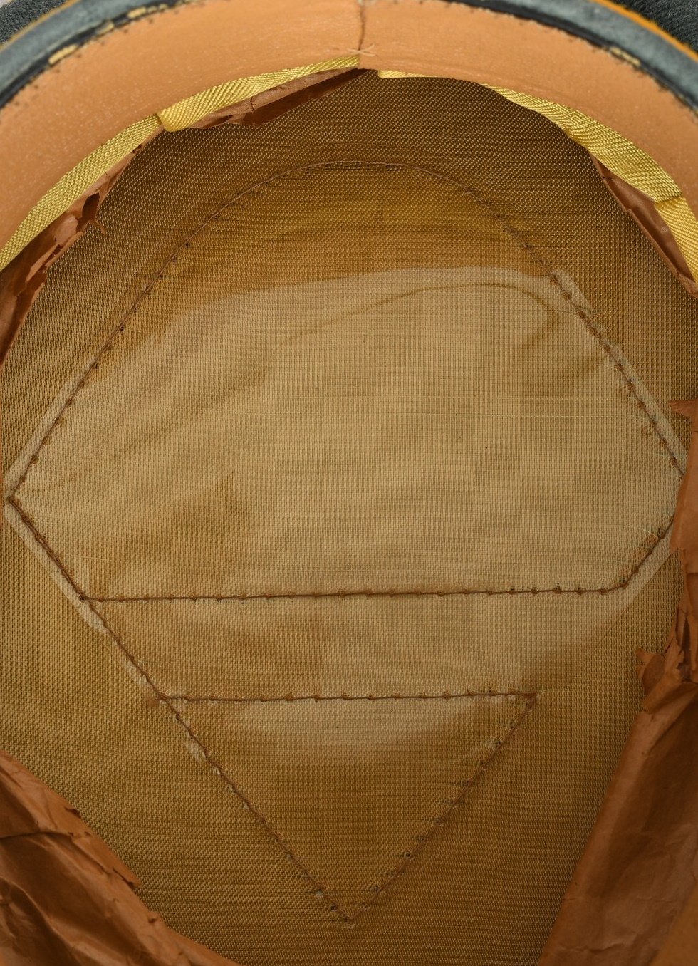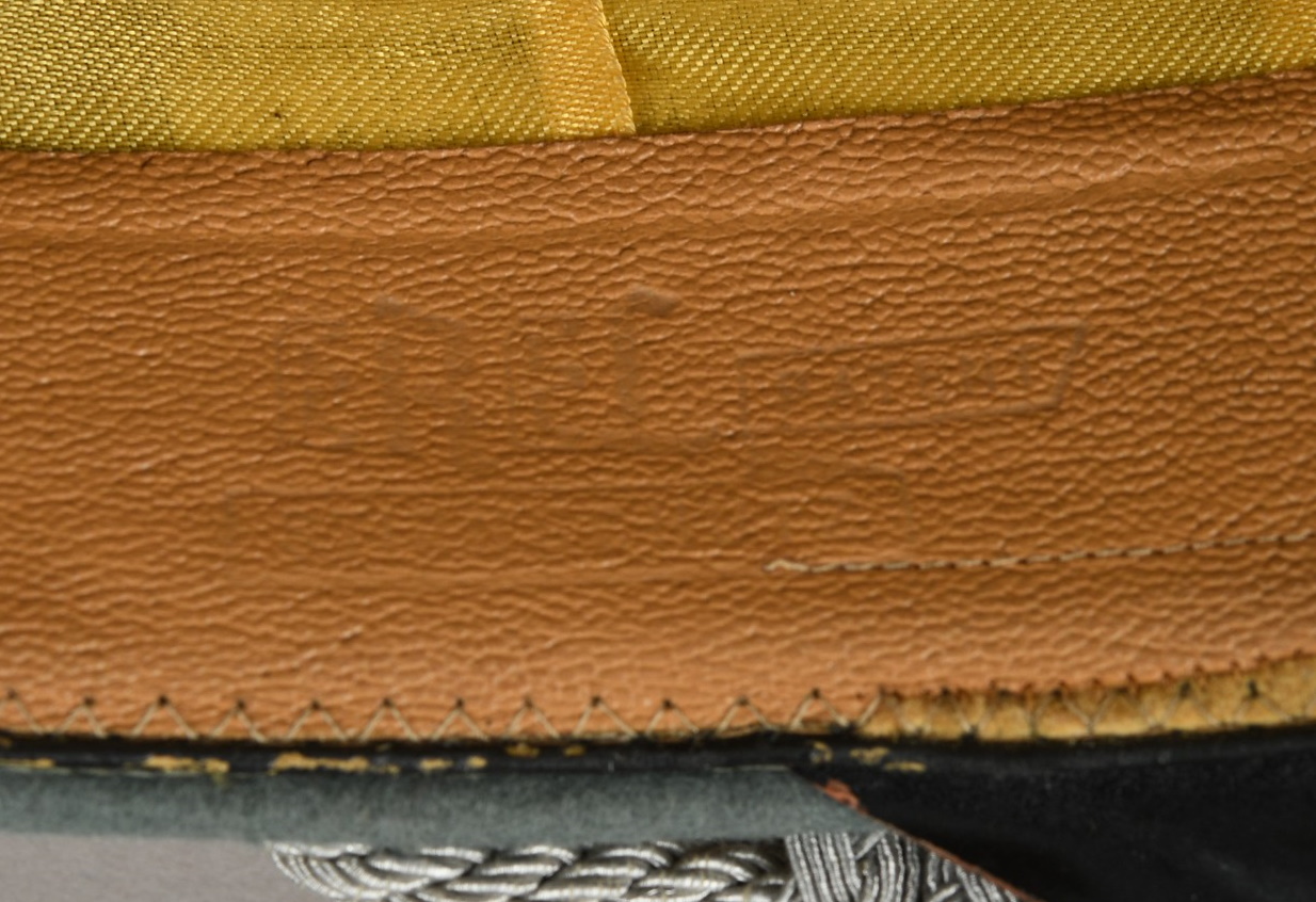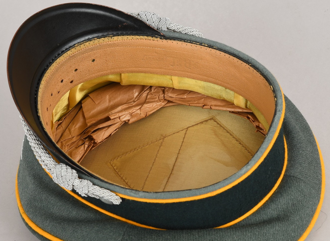 Inside cap is lined with golden yellow rayon. Cap still have it´s original sweat shield still intact. The cap is water marked stamped “Erel” beneath the sweat shield. It’s very hard to see and even harder to capture on picture. Tan leather sweatband is all intact. The cap is in close to perfect condition, out-side is absolutly mint and inside to. There is minor paint loss to the upper part of the black colored cord above the sweatband. Hardly noticable at all. Inside is still filled with the original factory paper for the cap to keep it’s shape. The cap present it self very nicely with its clean interior and exterior and nice high peak. Size is about 56 – 56,5