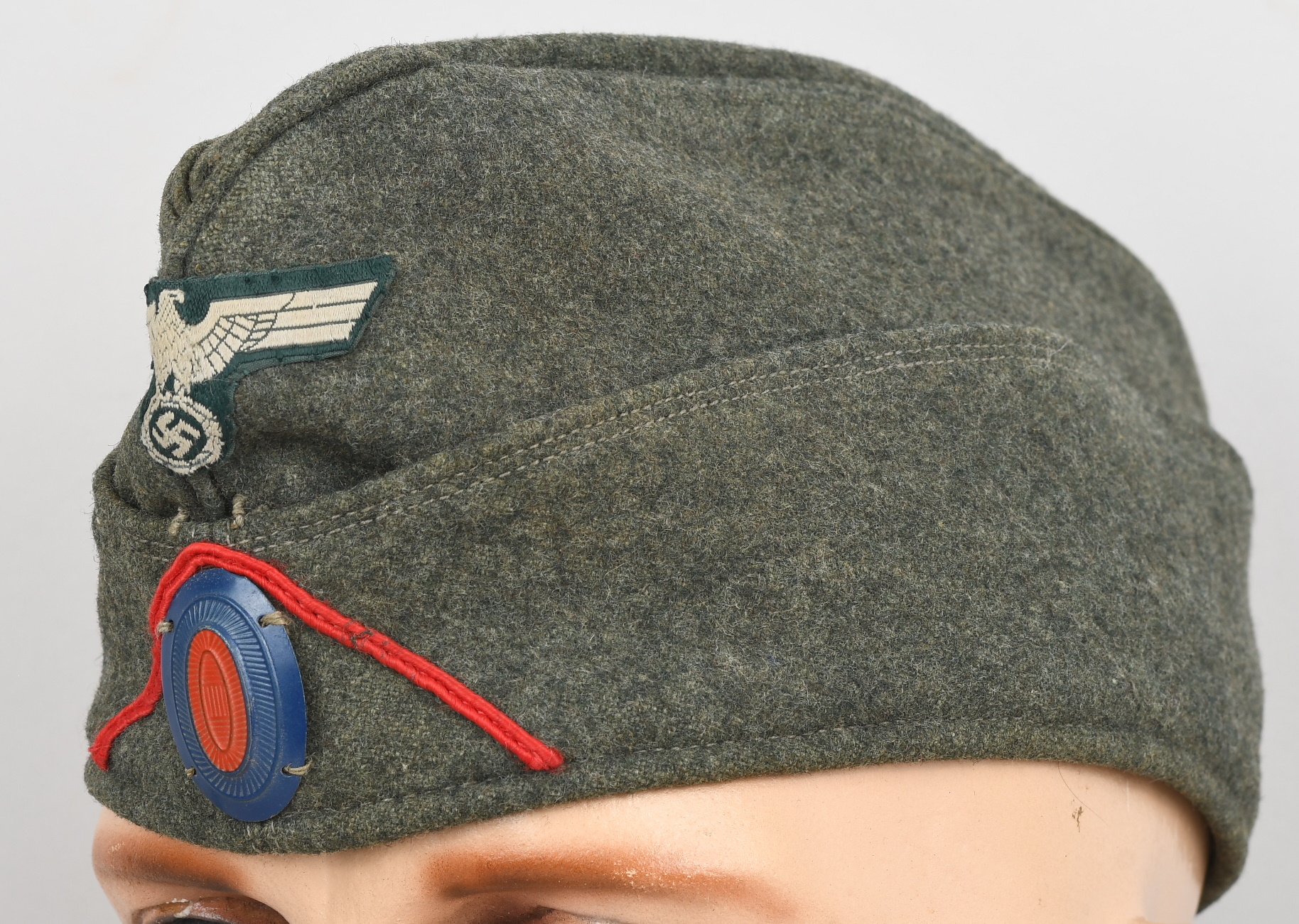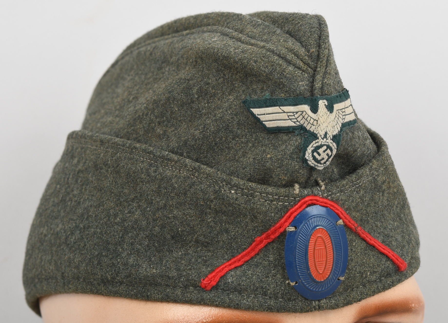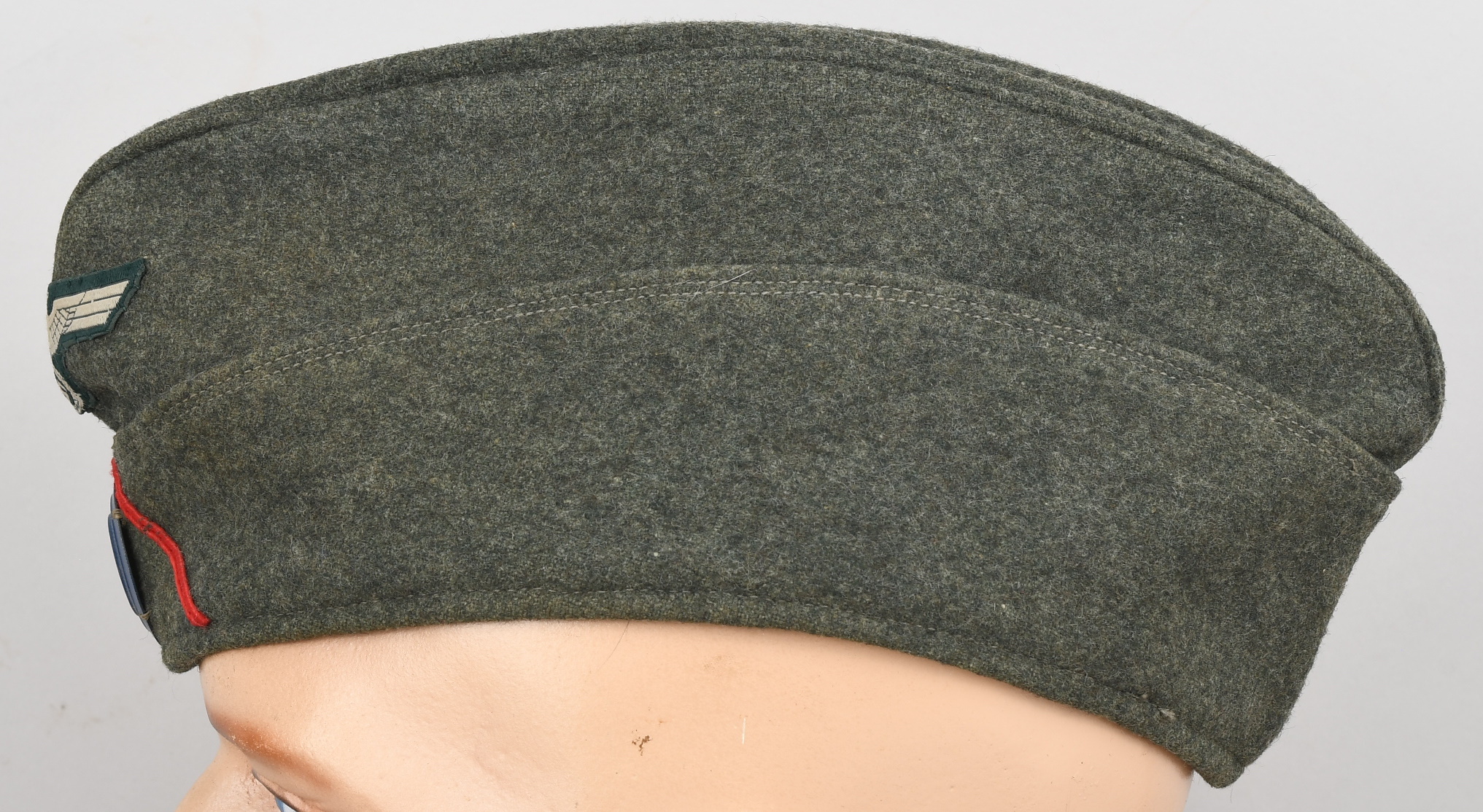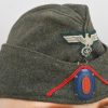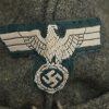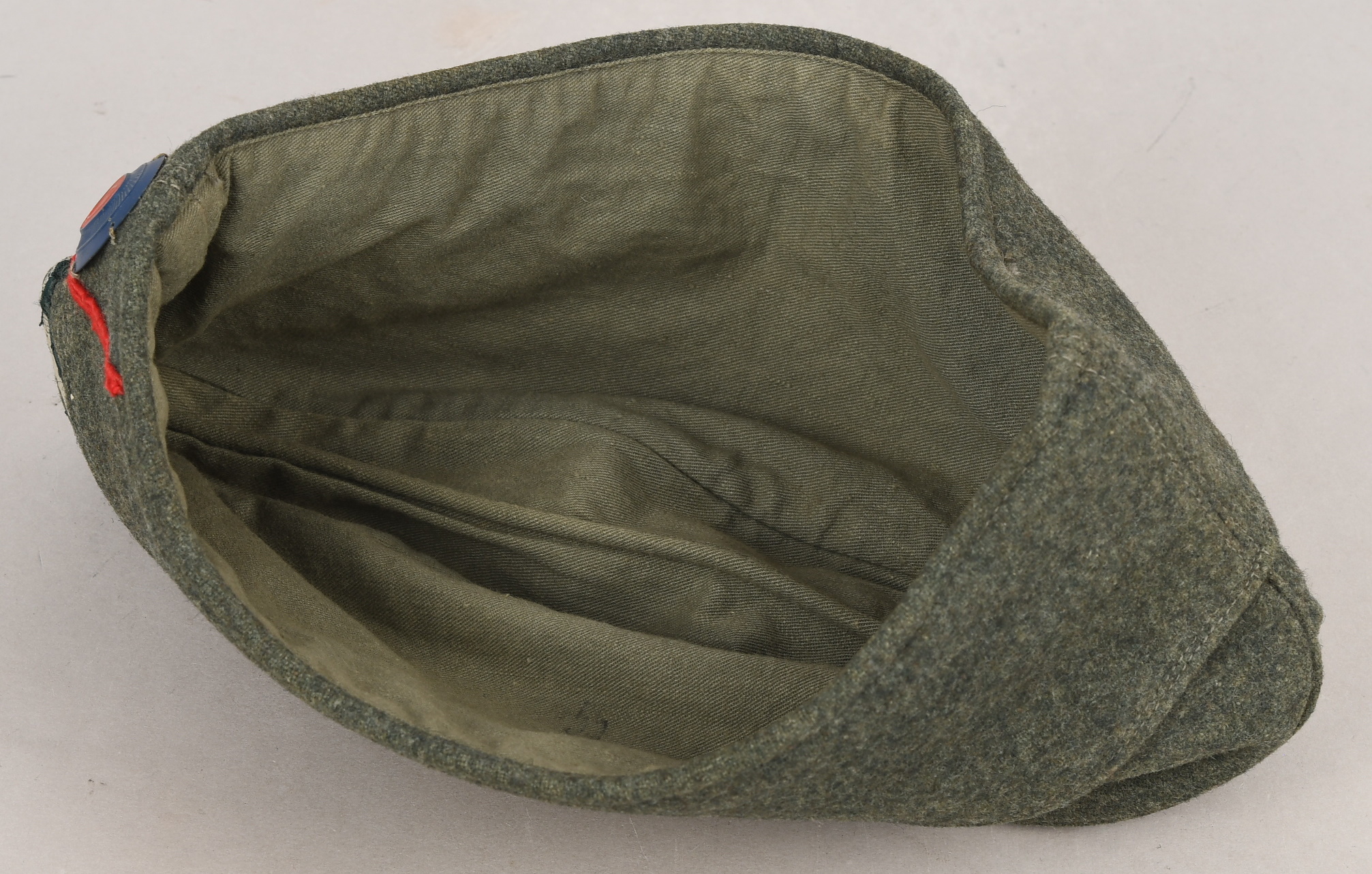Field-grey course wool construction cap with fold down side and back panels. As is typical the fold down panels are hand-stitched in the upright position at the front center of the cap. The front center of the cap has a machine woven, national eagle in white/grey threads on a cut-out woven, field-grey rayon base. The eagle is neatly handstitched to the cap. The front center of the fold down panels has a Don Cossack metal cockade/insignia. The cockade is hand sewn in place. The cap has a red rayon inverted “V” soutache indicating service in a artillery unit. The soutache has been applied in the correct manner, being machine stitched in place and inserted through two, small, puncture holes near the bottom edge of the cap. The interior of the cap is fully lined in grey, drill cotton cloth. Lining has a rather faint size stamp “55” in black ink. The cap is in good, still used condition with nap wear and age toning to all exposed parts.