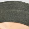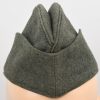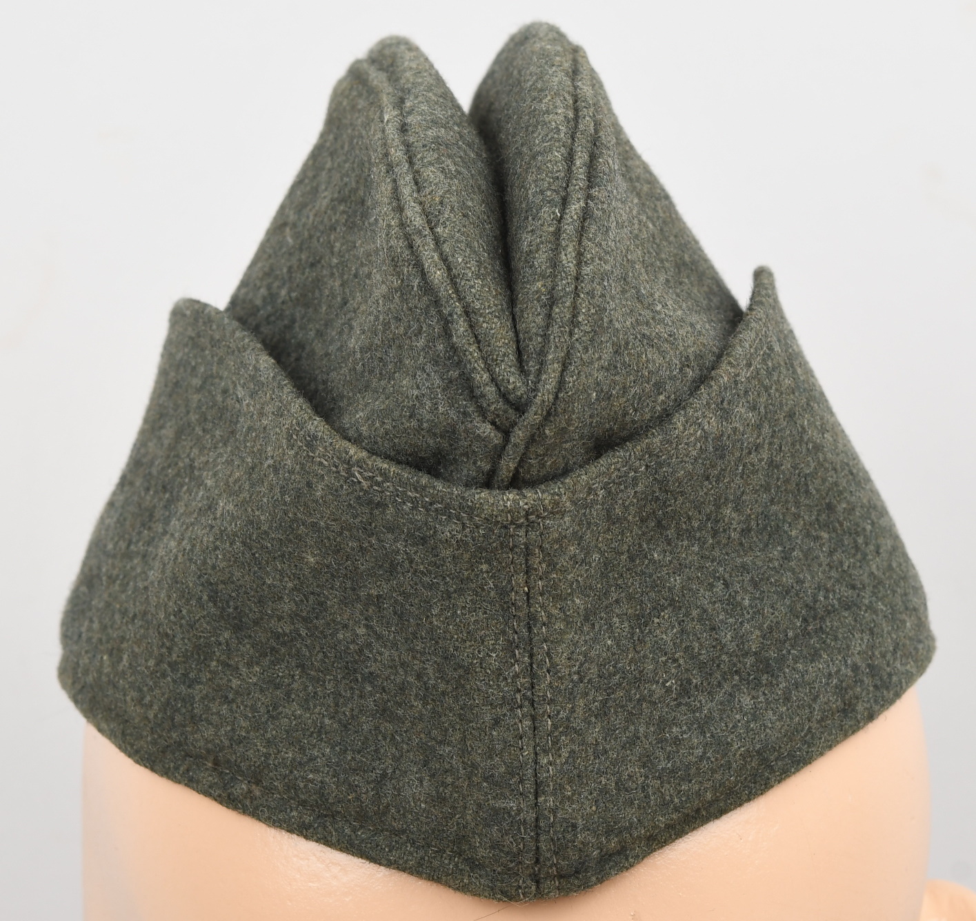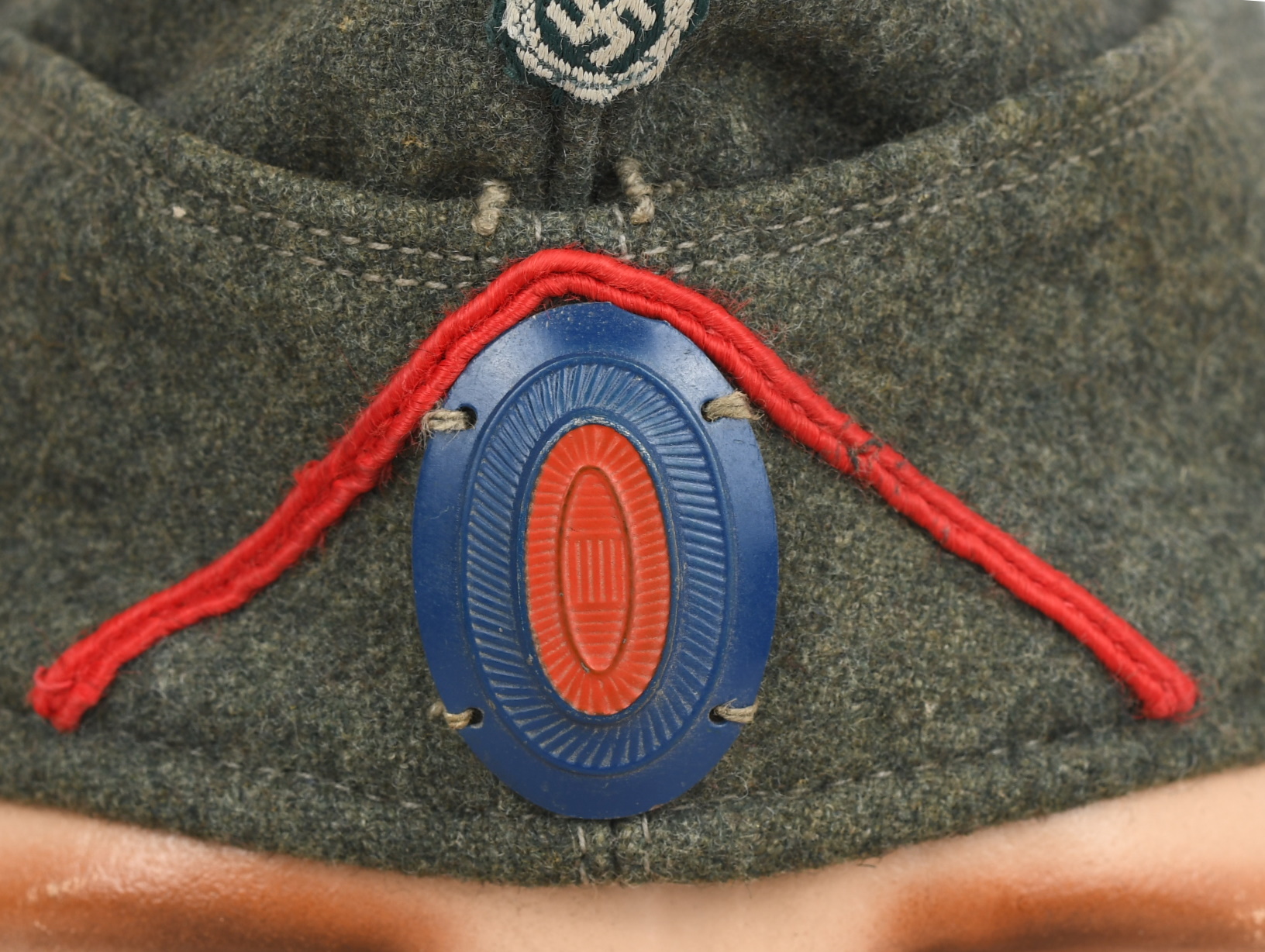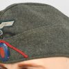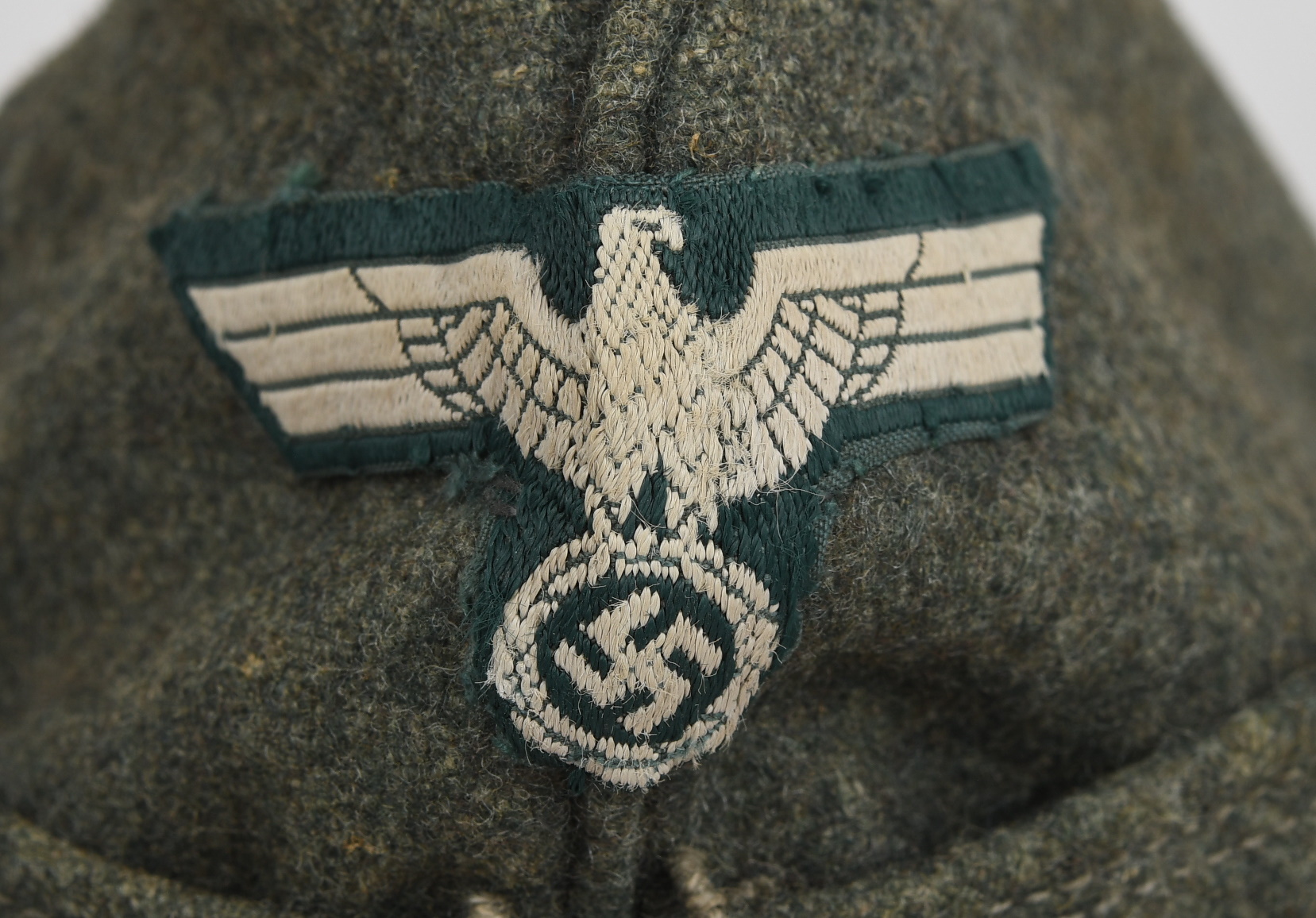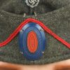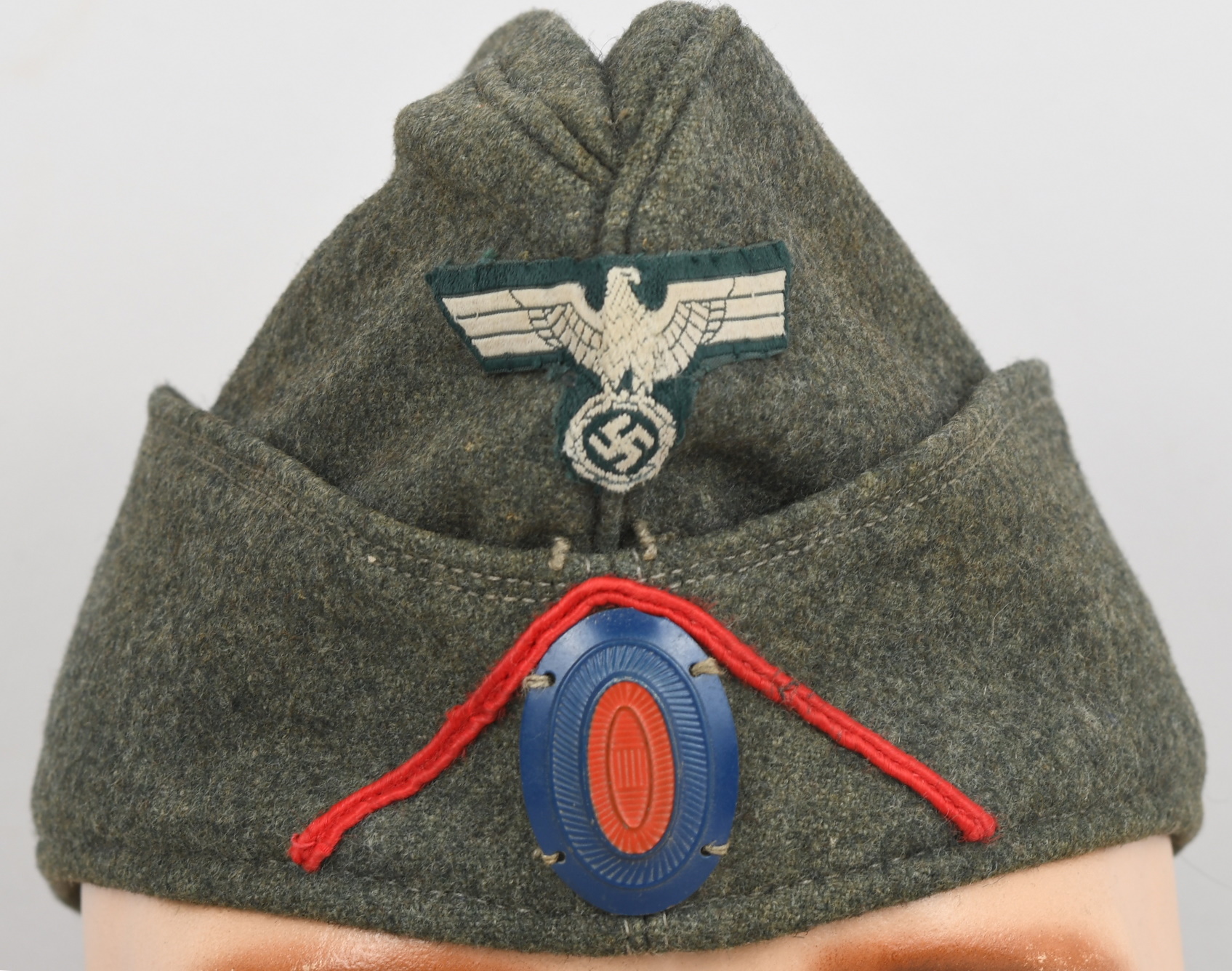 Field-grey course wool construction cap with fold down side and back panels. As is typical the fold down panels are hand-stitched in the upright position at the front center of the cap. The front center of the cap has a machine woven, national eagle in white/grey threads on a cut-out woven, field-grey rayon base. The eagle is neatly handstitched to the cap. The front center of the fold down panels has a Don Cossack metal cockade/insignia. The cockade is hand sewn in place. The cap has a red rayon inverted “V” soutache indicating service in a artillery unit. The soutache has been applied in the correct manner, being machine stitched in place and inserted through two, small, puncture holes near the bottom edge of the cap. The interior of the cap is fully lined in grey, drill cotton cloth. Lining has a rather faint size stamp “55” in black ink. The cap is in good, still used condition with nap wear and age toning to all exposed parts.