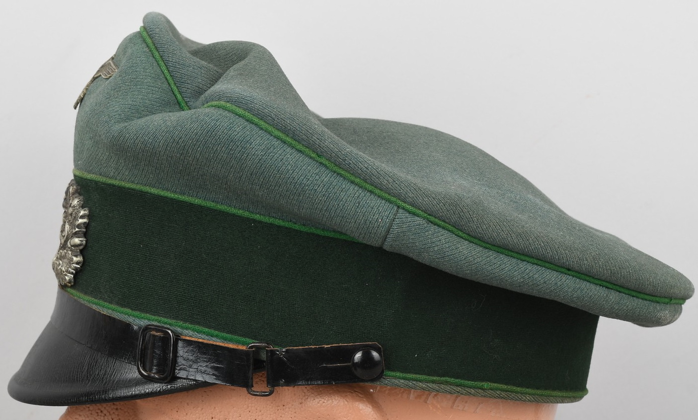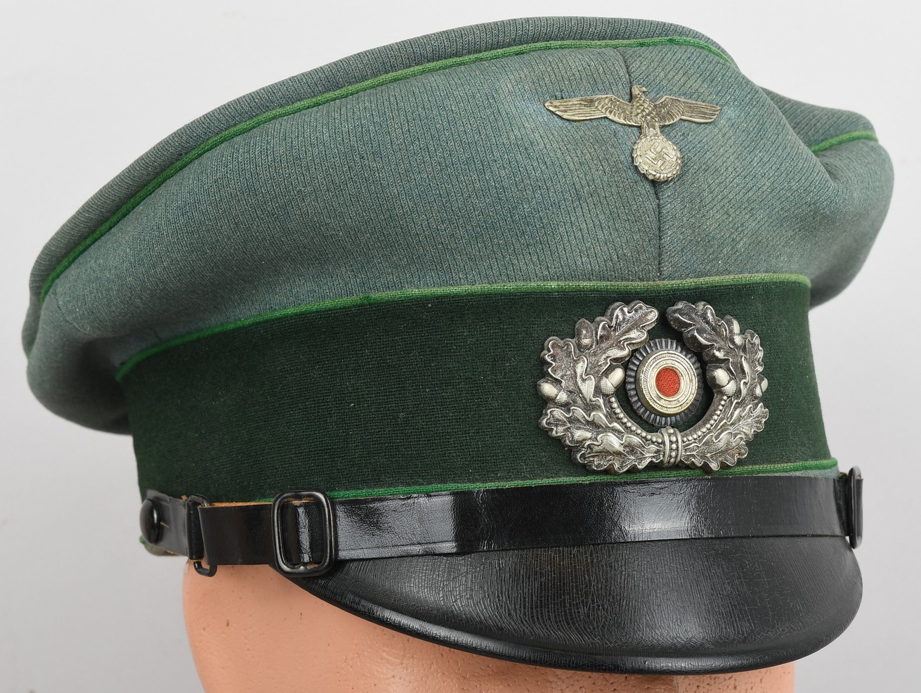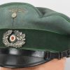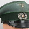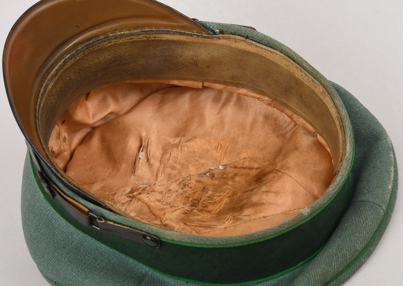 Early produced, private purchase jäger EM/NCO´s visor cap made of field-grey tricot cloth with green, trimmed wool piping. Pinned in place to the front is a early buntmetal, silver washed national eagle and wreath/cockade as well as EM/NCO´s black laquered pressed paper chincord. Inside cap is lined with orange/brown rayon cloth. Cap has lost it’s sweatshield. Brown leather sweatband is all intact. Cap shows clear signs of age and use. Inside with some tears from wear to the lining. The cap is very large approx size 59.